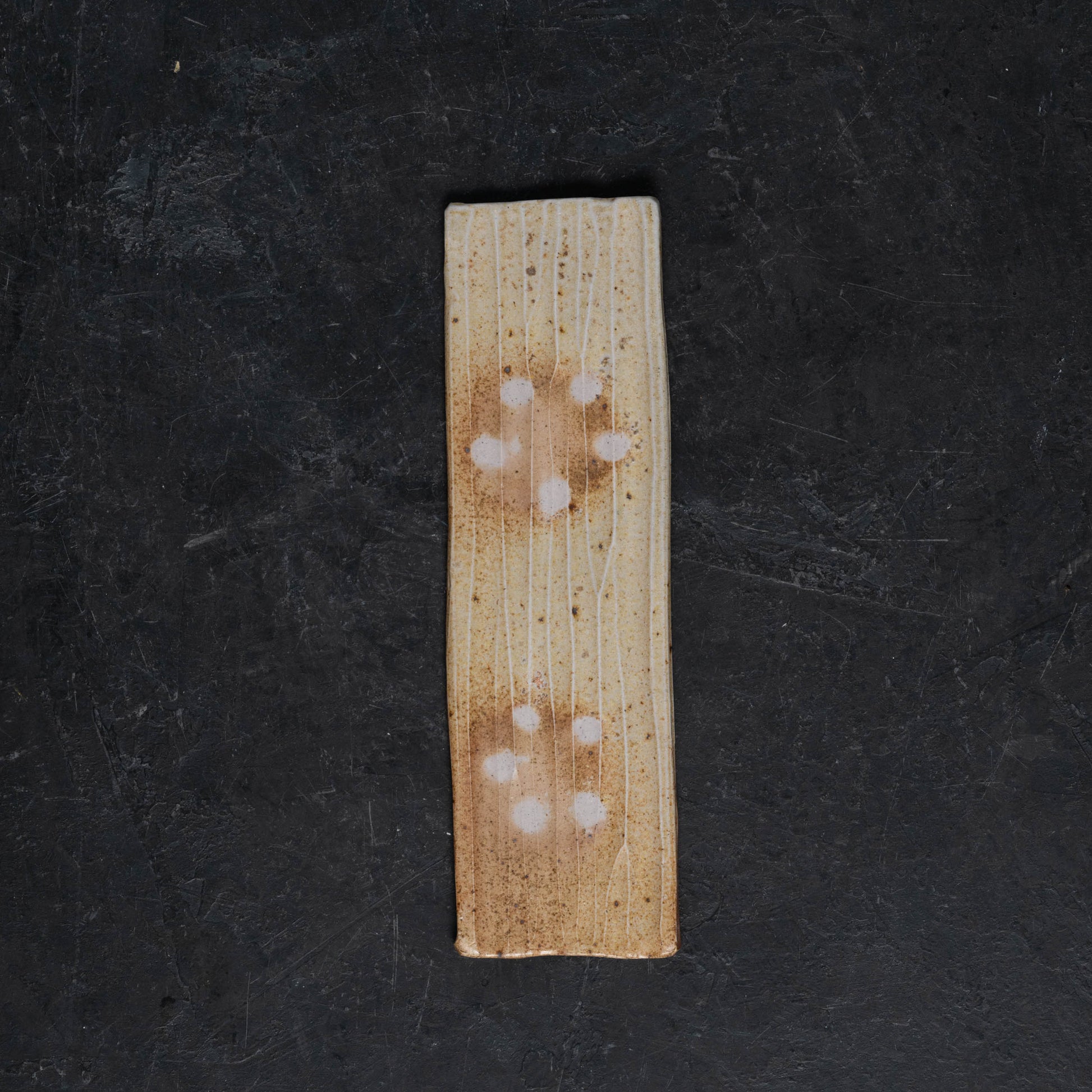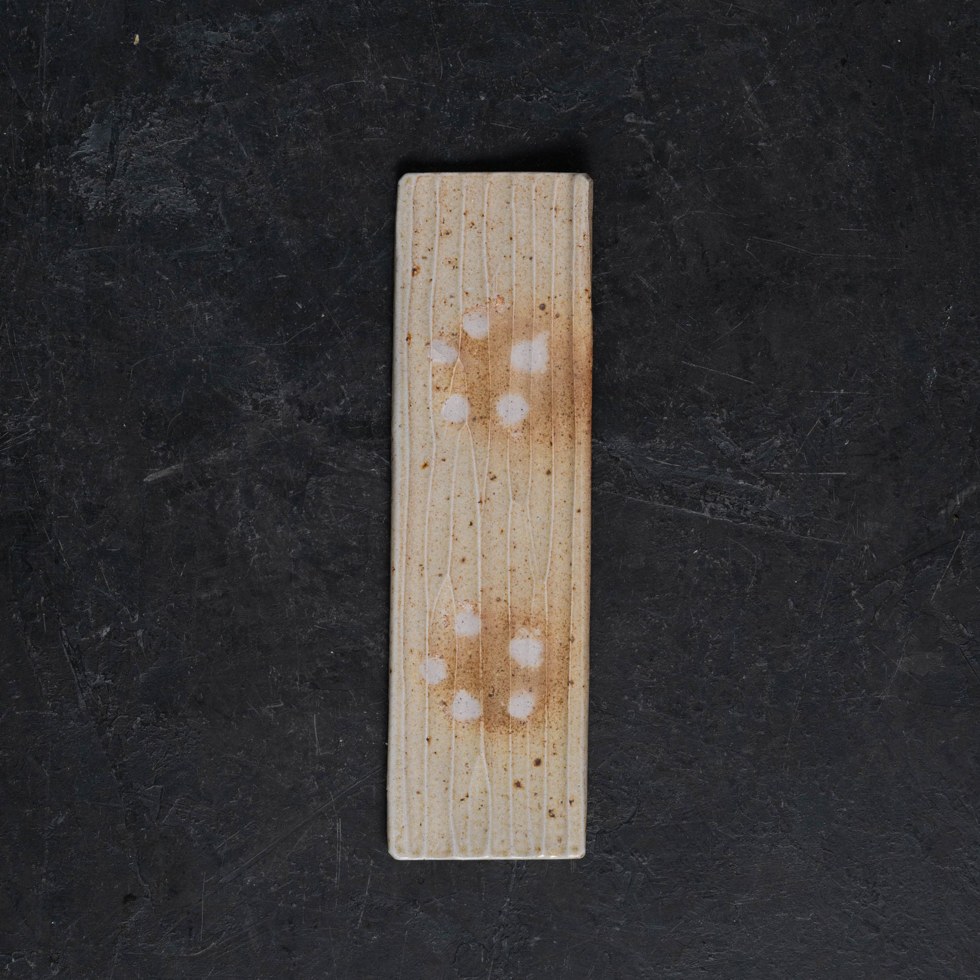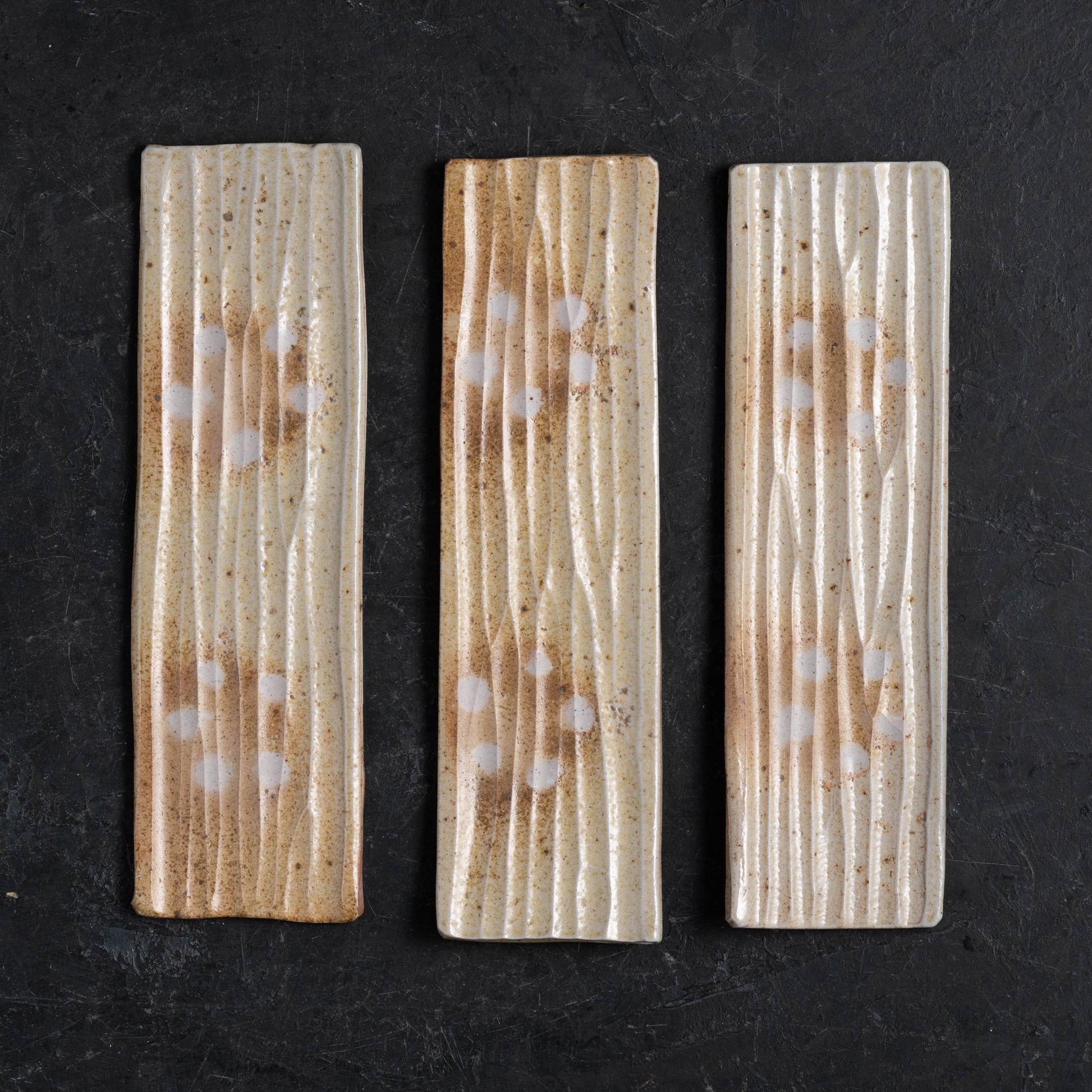 Hand-fluted stoneware slabs formed into rectangular trays. Originally designed as pen trays for a desk, these could also be used for tea snacks, sushi, or whatever else your heart desires. Decorated only with fire, ash, and salt.