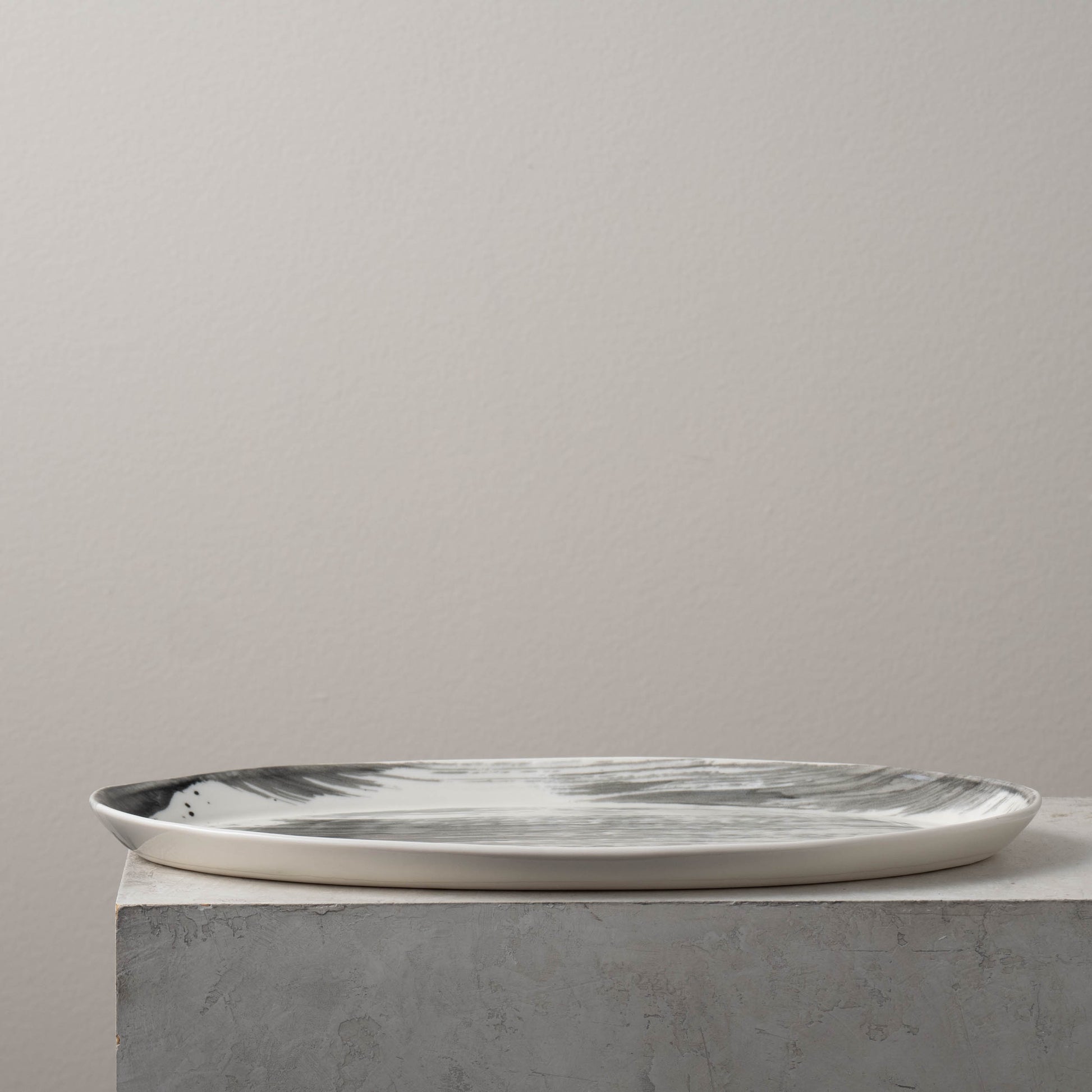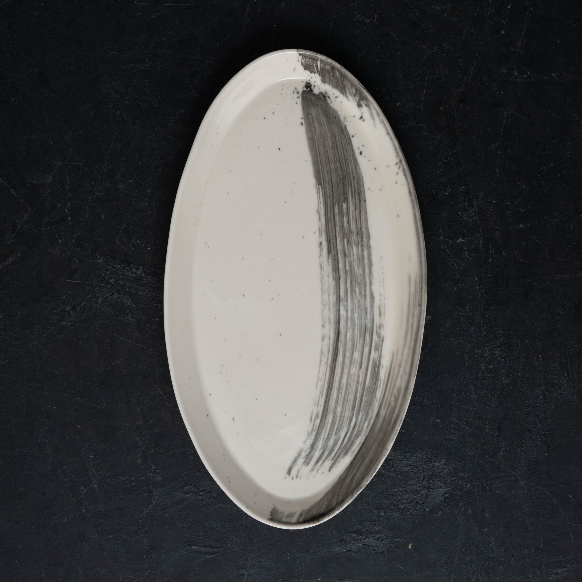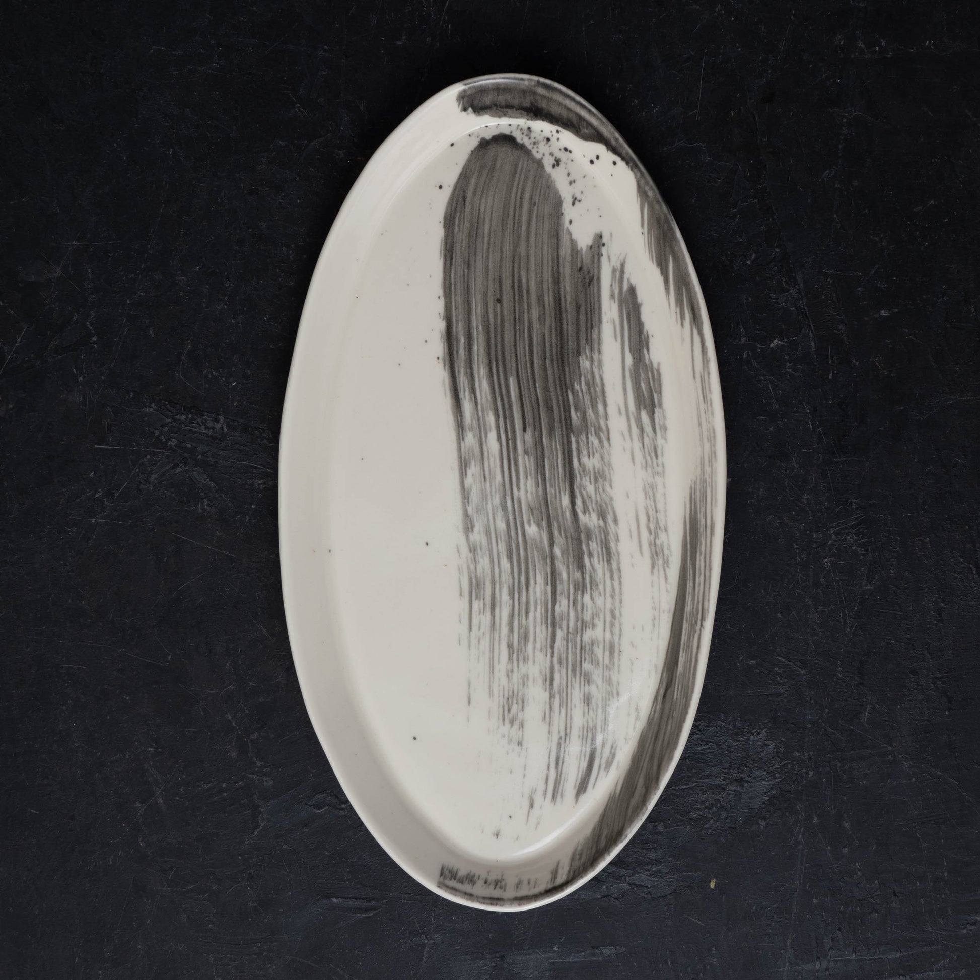 Slump molded porcelain with a big, bold brushstroke to decorate the surface. In one confident movement, a black brushstroke is hand-painted onto the surface using a Japanese sheep hair brush. I love decorating ceramics with brushstrokes because I can make ephemeral moments last forever.