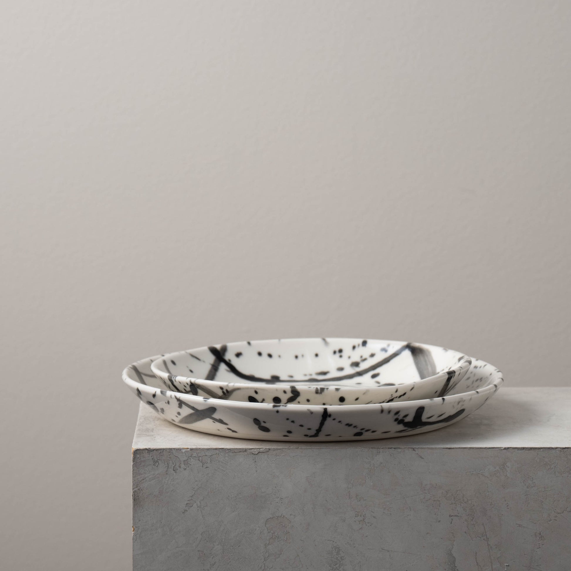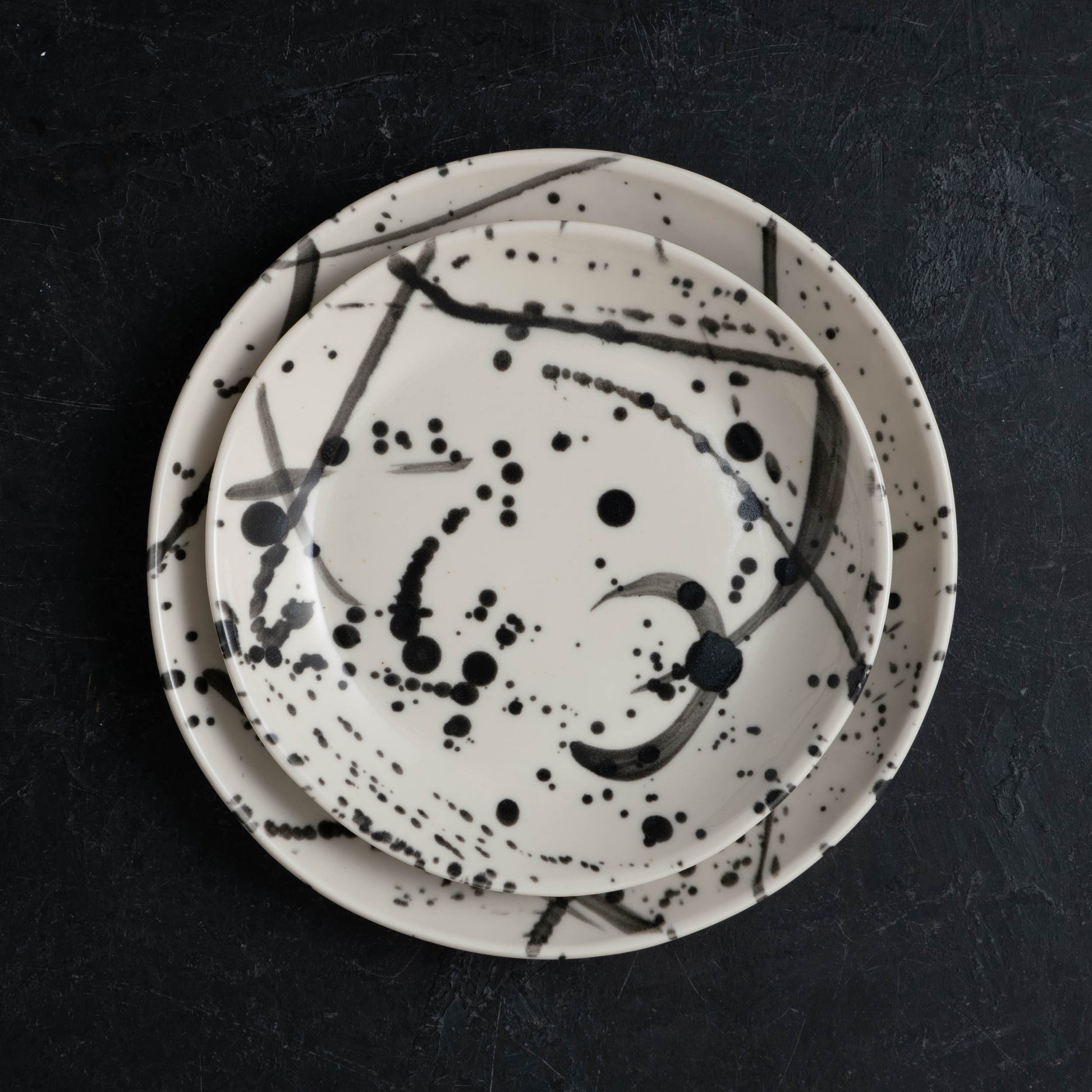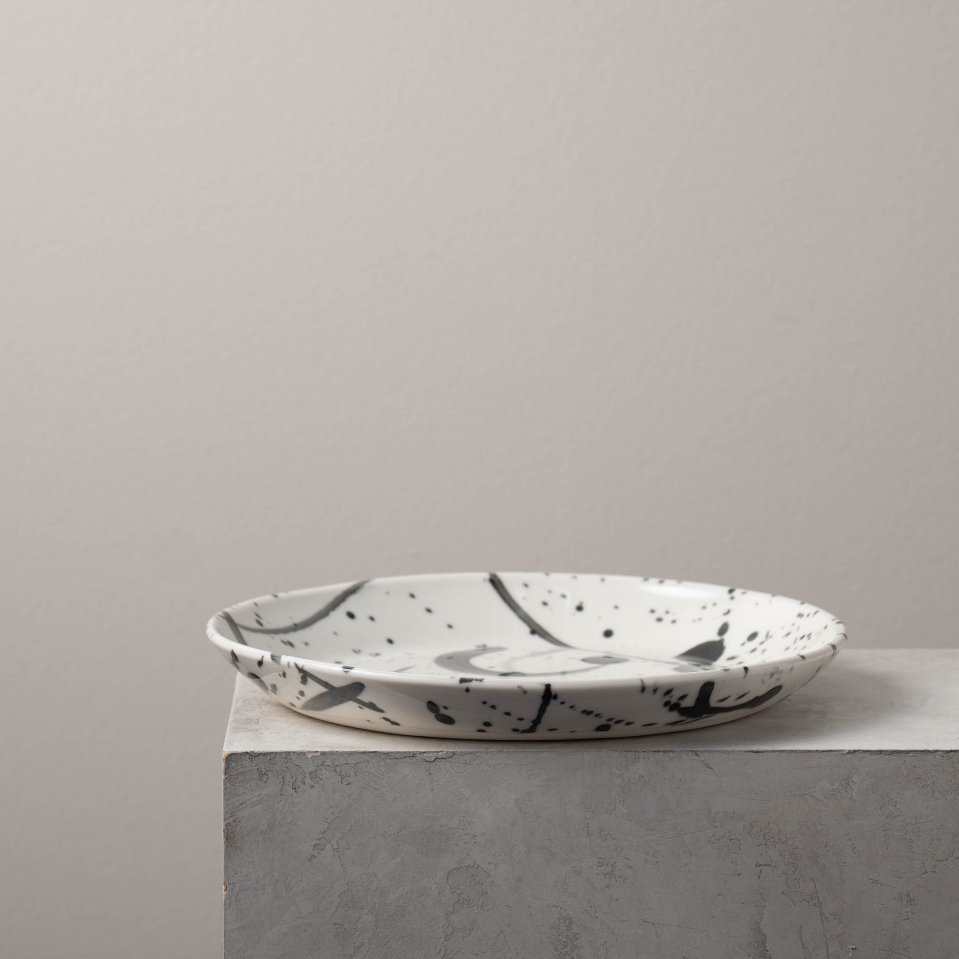 Slab-draped porcelain coupe style plates finished in a splatter decoration. Porcelain is elastic and we love how it almost has a mind of its own. We created this line to celebrate the wabi sabi nature of porcelain while bringing an easy elegance to your home.