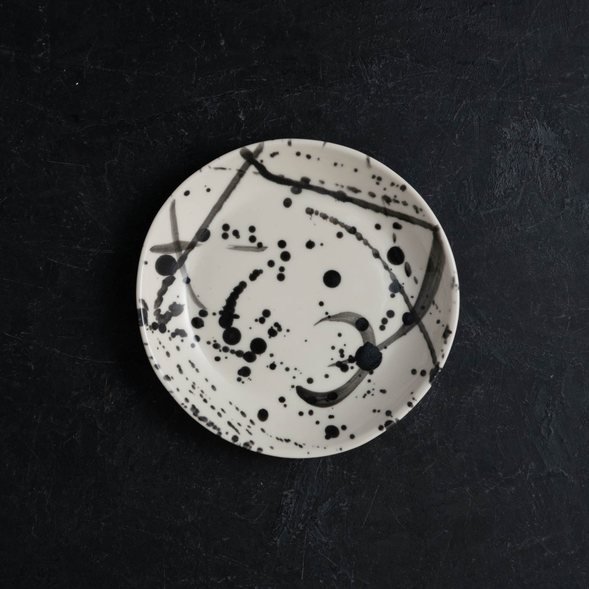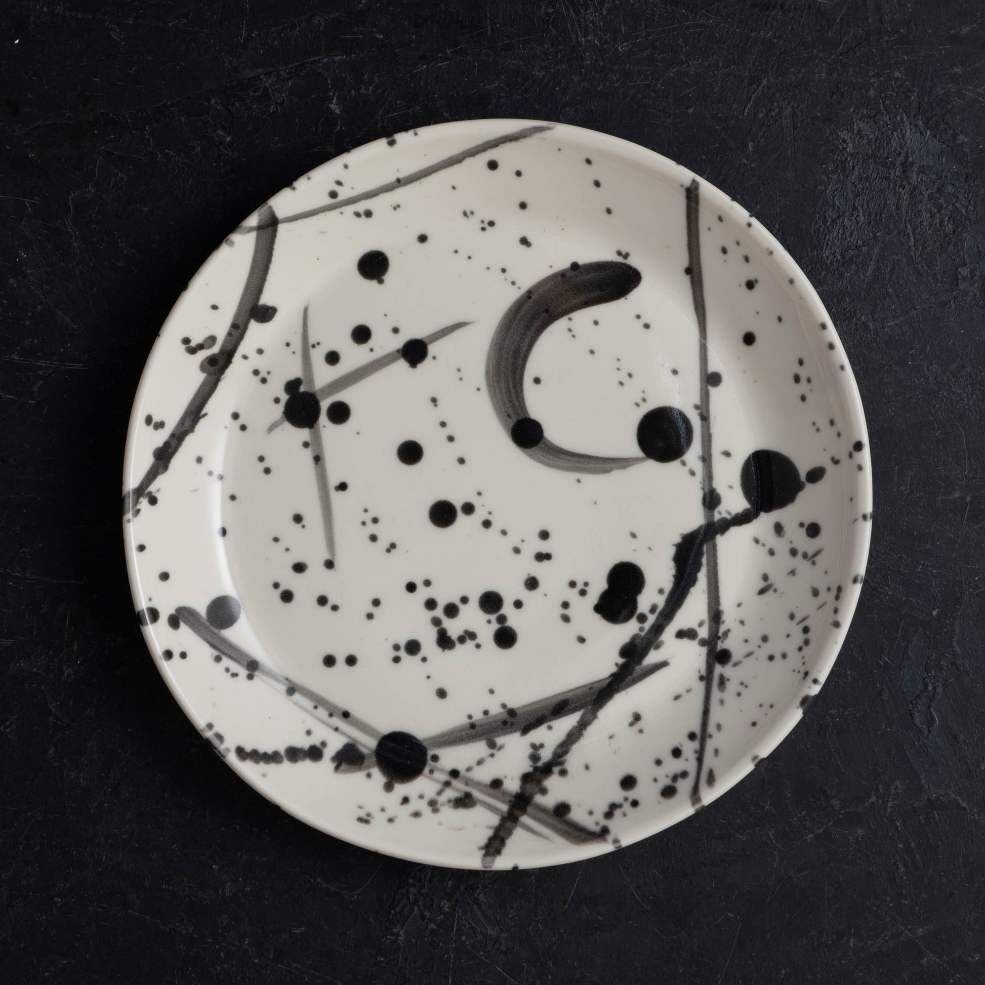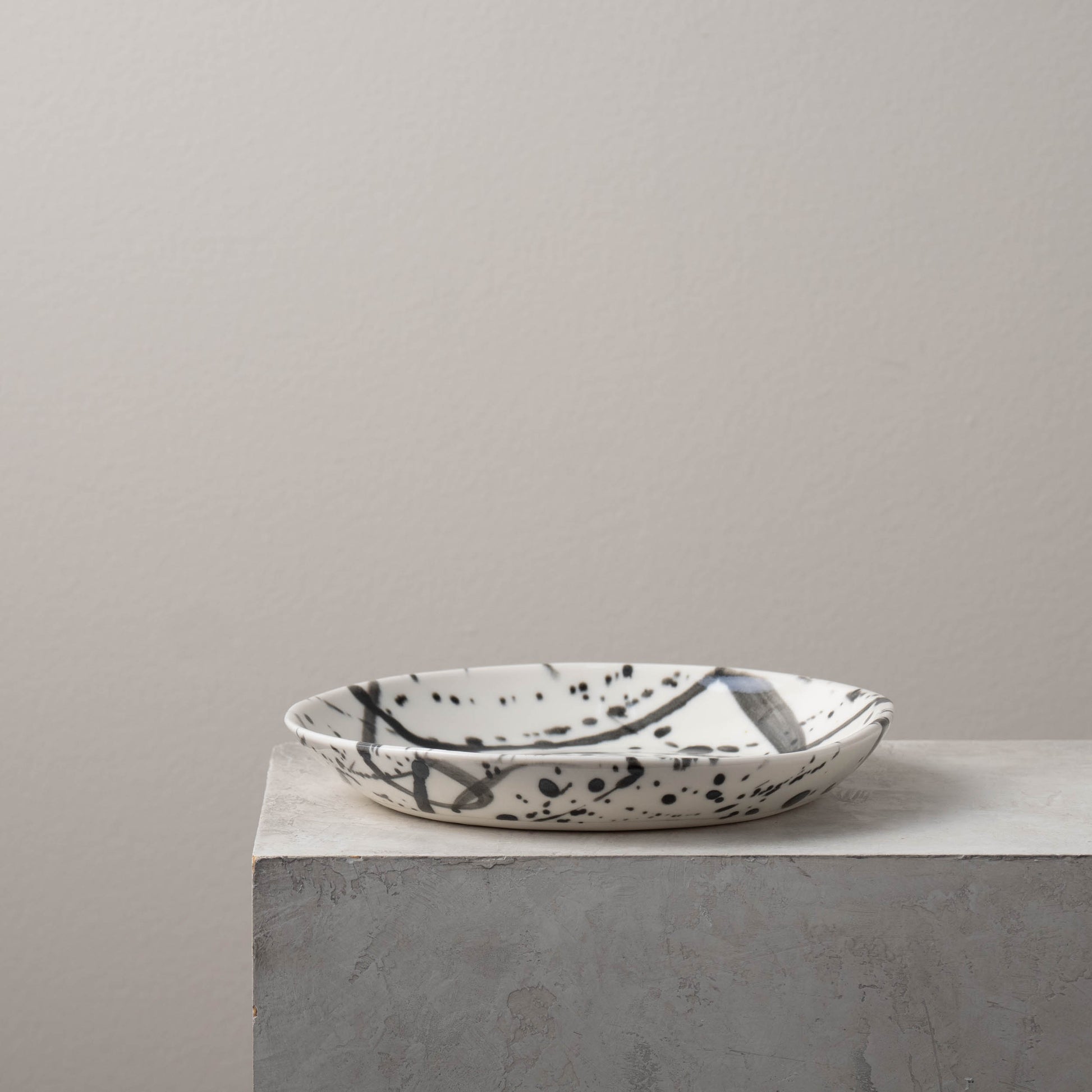 Slab-draped porcelain coupe style plates finished in a splatter decoration. Porcelain is elastic and we love how it almost has a mind of its own. We created this line to celebrate the wabi sabi nature of porcelain while bringing an easy elegance to your home.