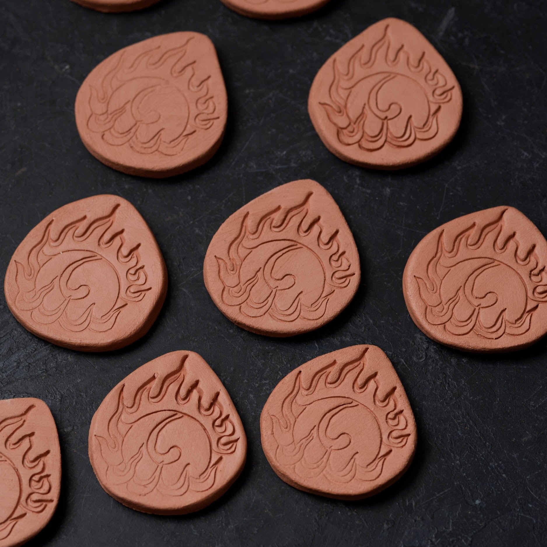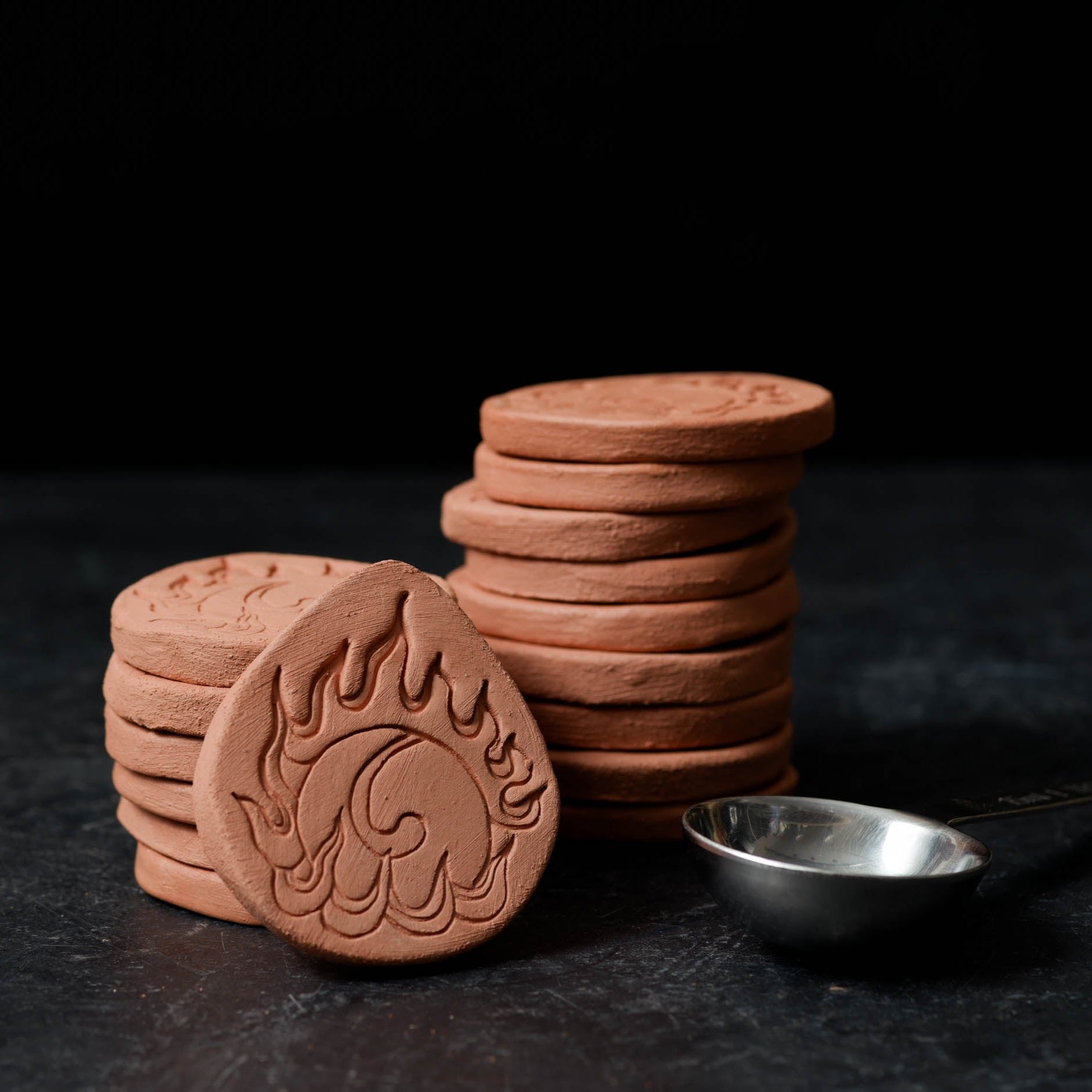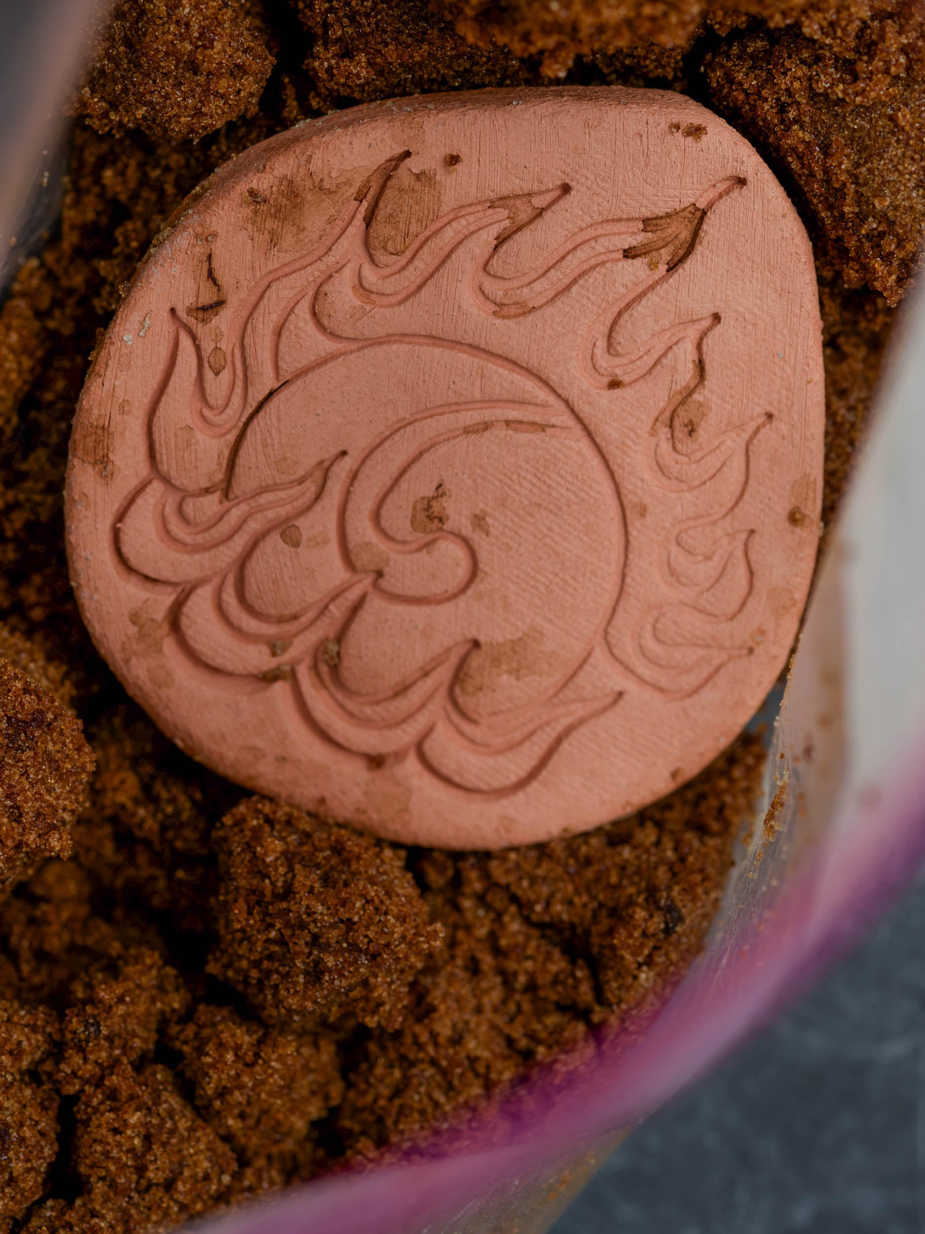 Terra cotta brown sugar keeper with a wishing jewel decoration stamped into it. A wishing jewel is a flaming, magical Buddhist symbol of wish-fulfillment and enlightened wisdom.