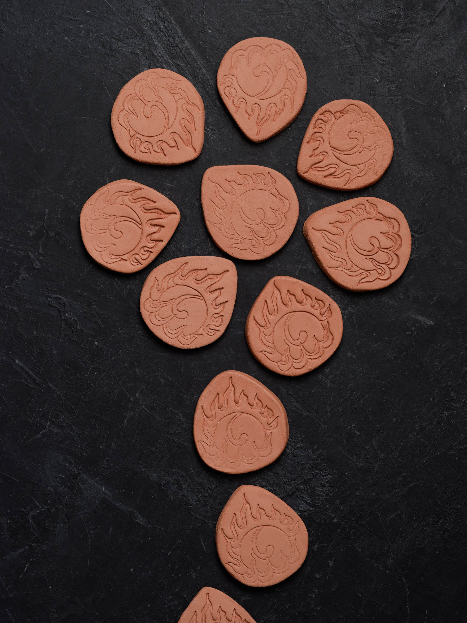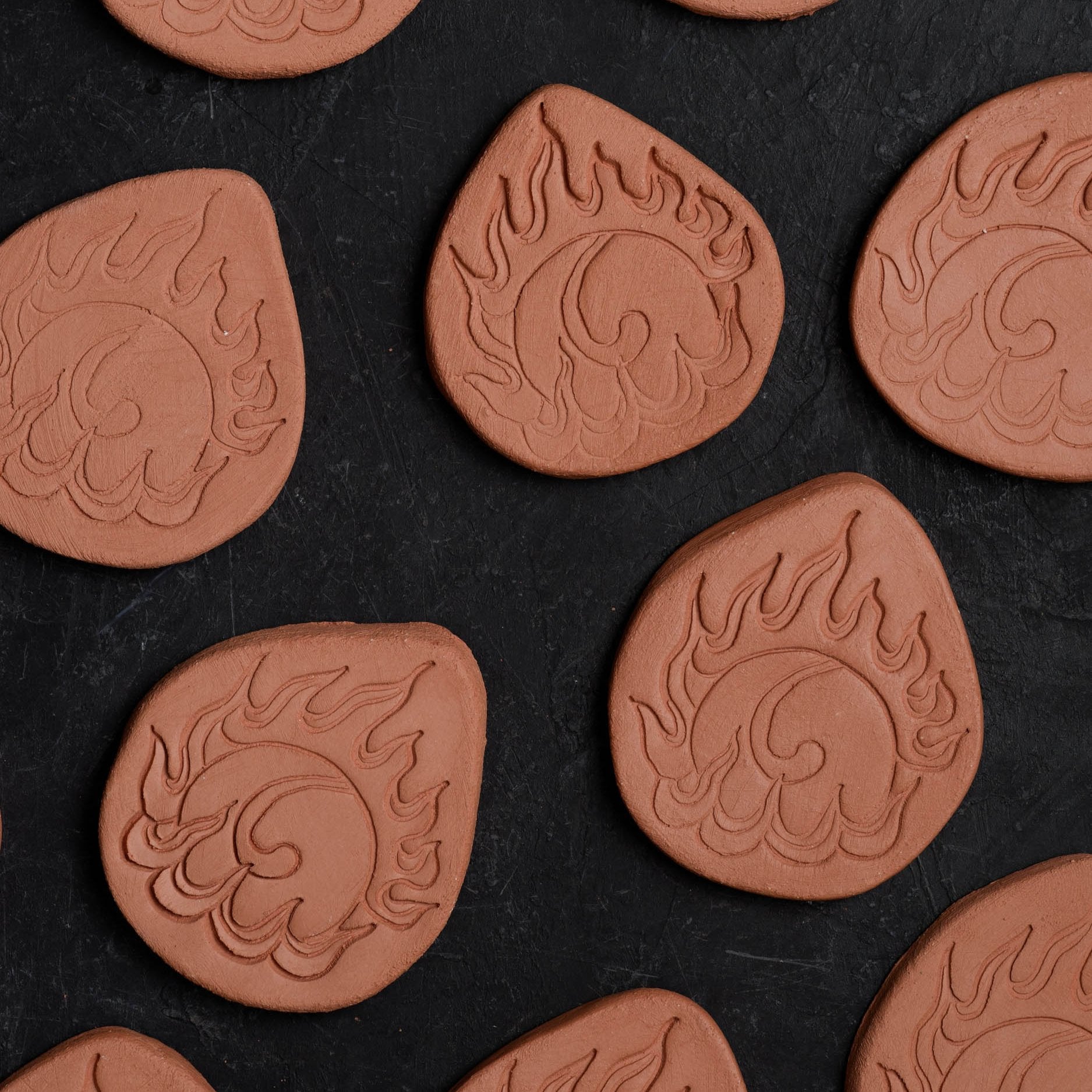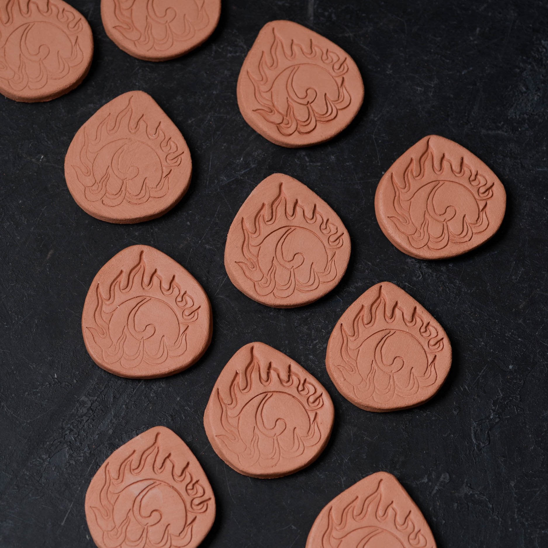 Terra cotta brown sugar keeper with a wishing jewel decoration stamped into it. A wishing jewel is a flaming, magical Buddhist symbol of wish-fulfillment and enlightened wisdom.