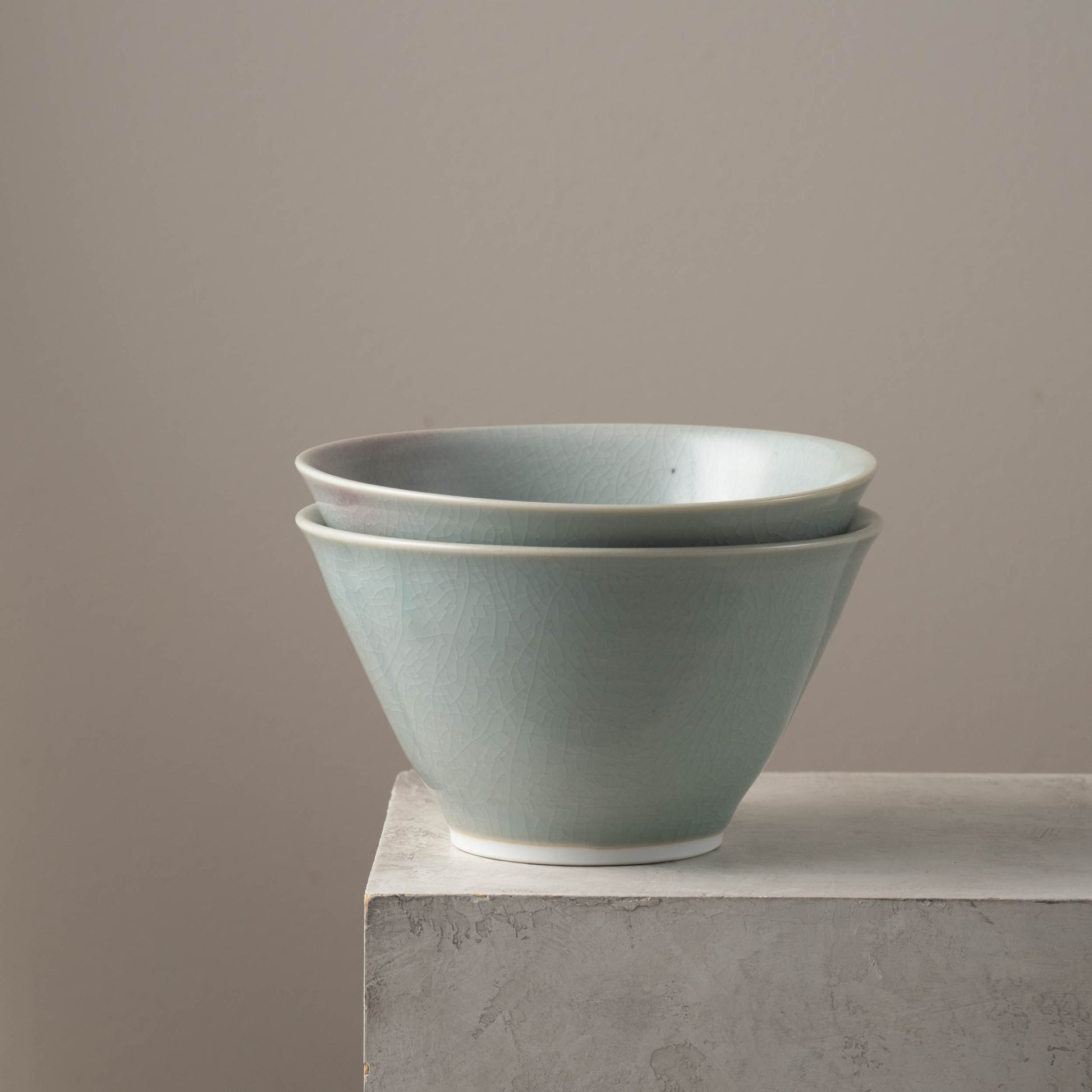 Wheel thrown porcelain bowl finished in a celadon glaze. Reduction fired in a gas kiln. A deep narrow bowl that would be perfect for congee, cereal, or oatmeal. Feels nice in the hand and is perfect for taking to the couch.