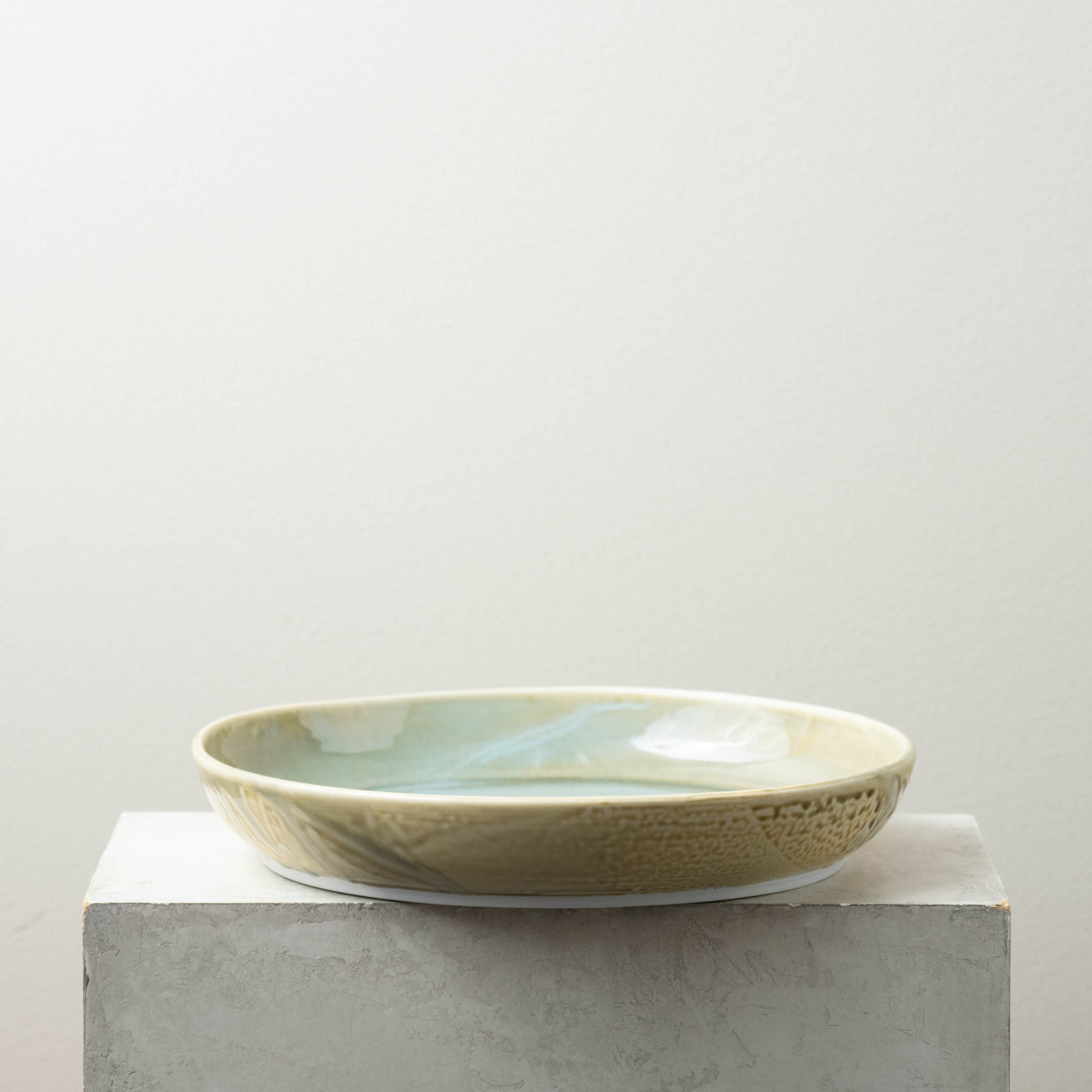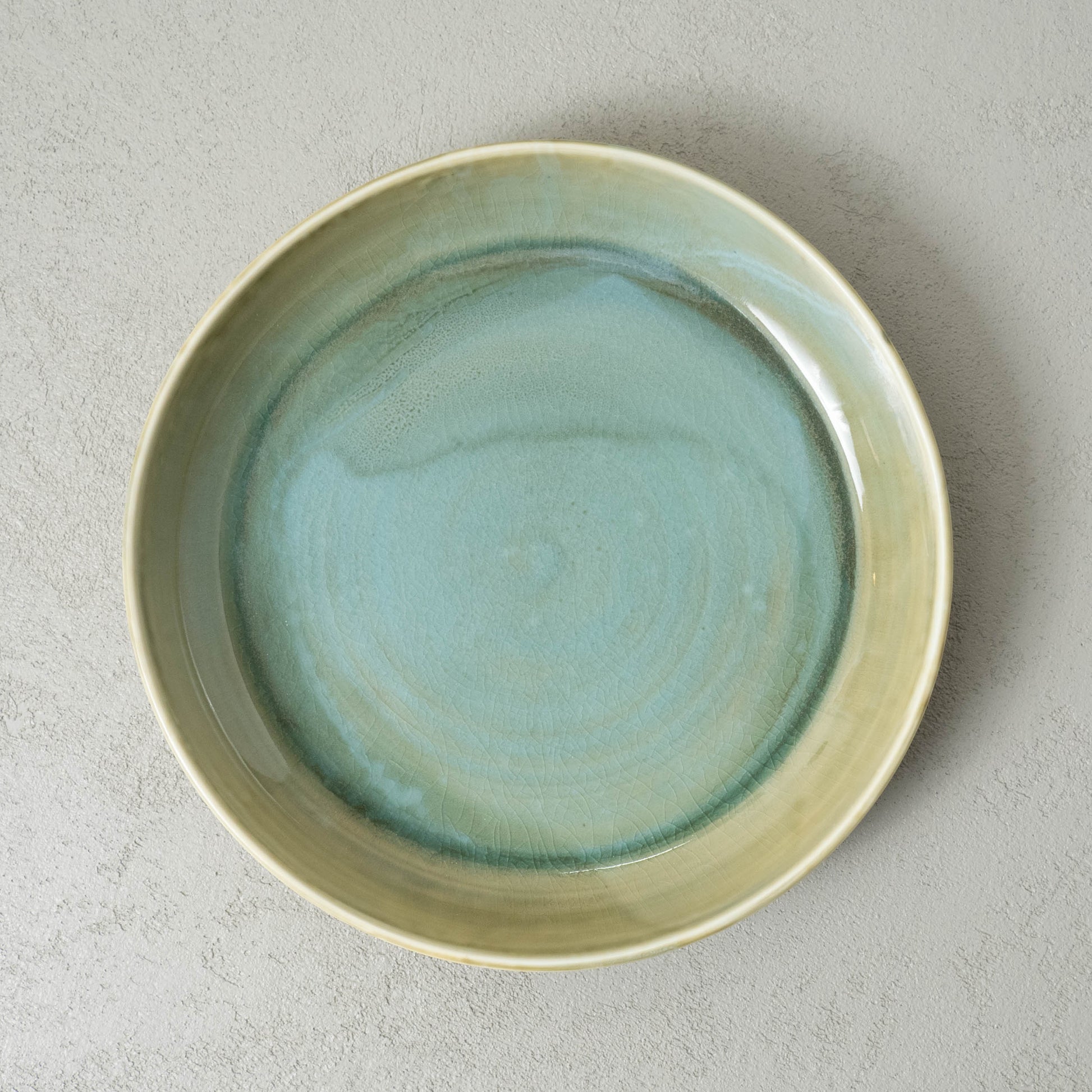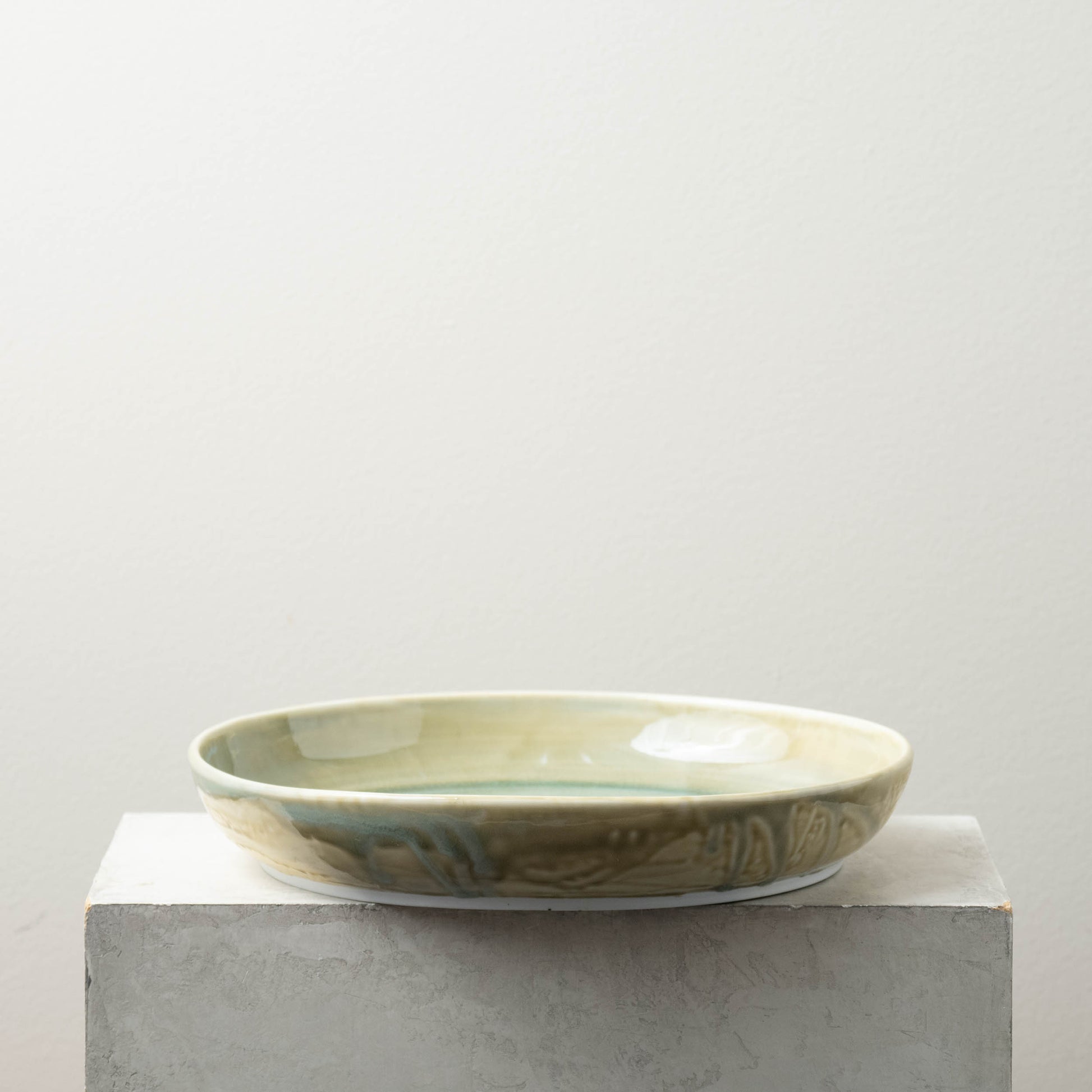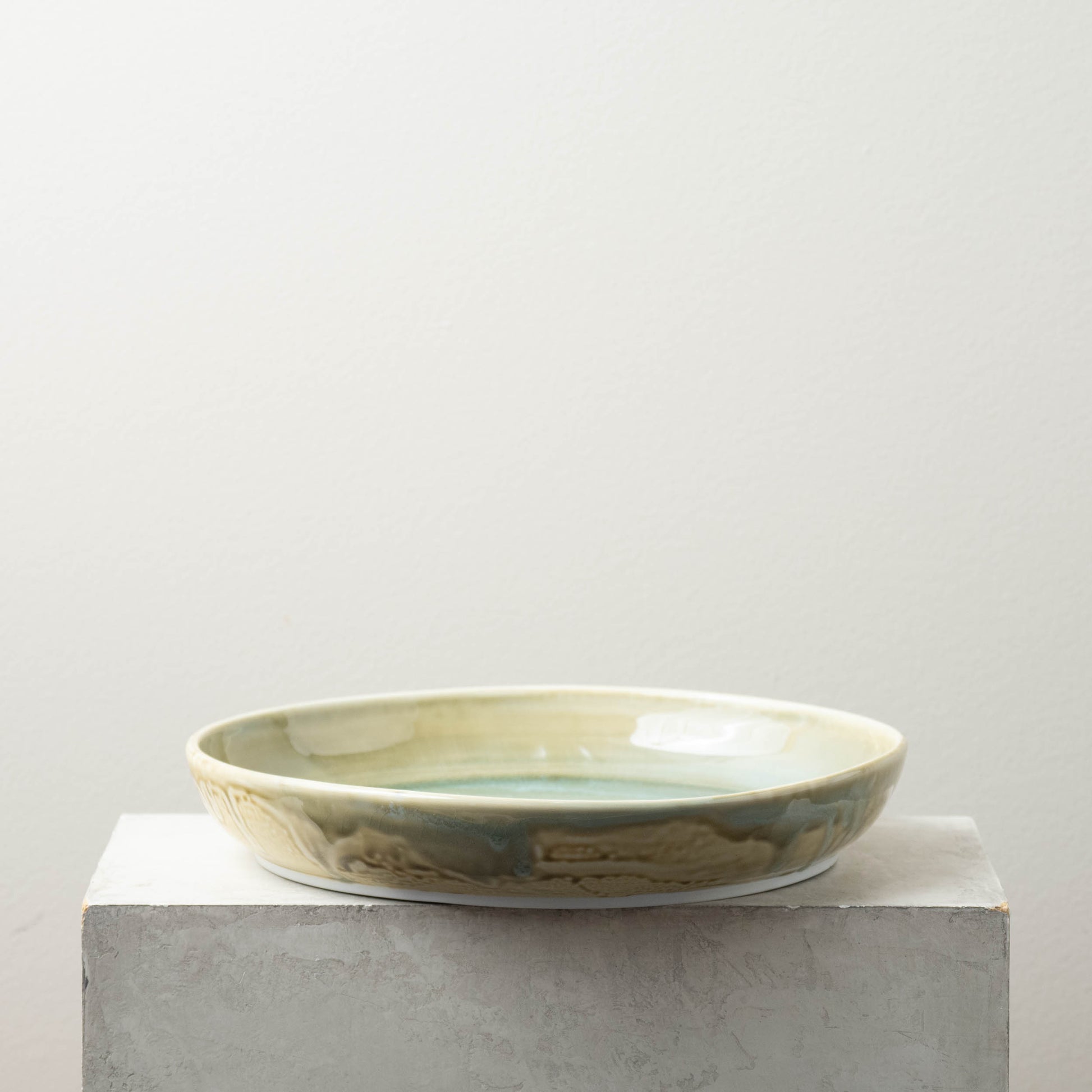 Wheel thrown porcelaneous stoneware serving dish reduction fired in a celadon glaze. Dramatic glaze trailing marks. One of a kind.