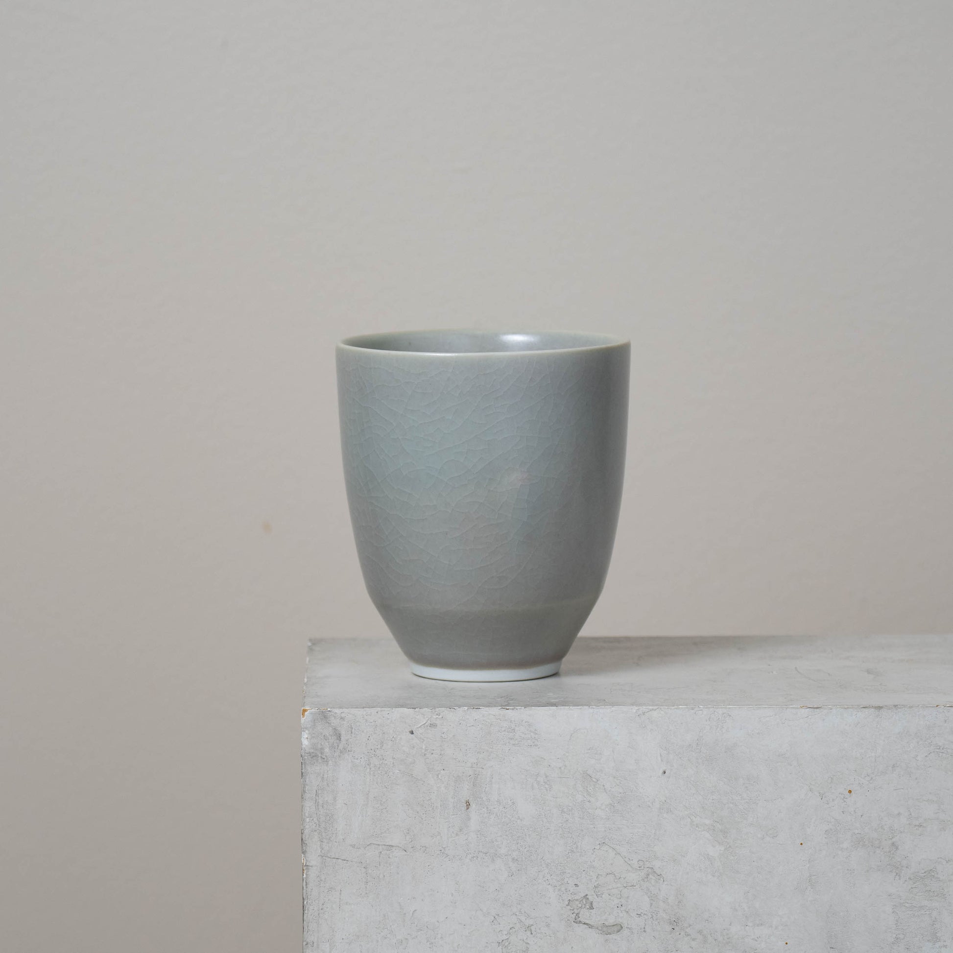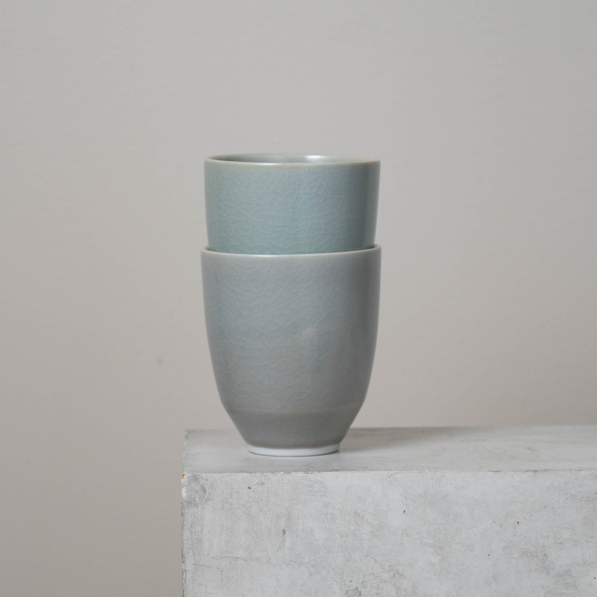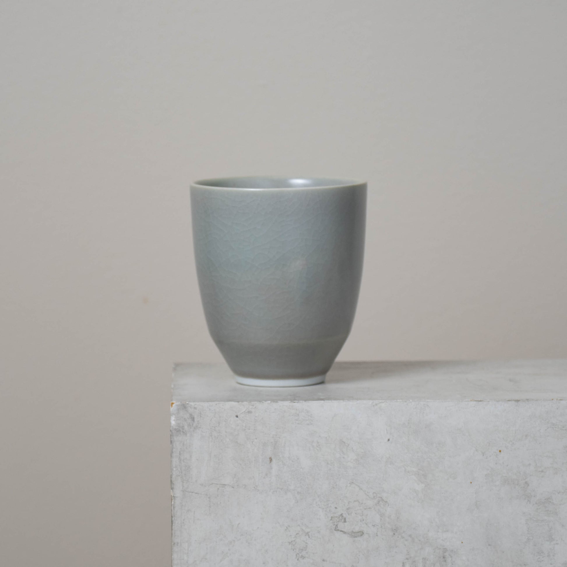 Wheel thrown porcelain tumbler glazed in celadon and reduction fired in a gas kiln. Celadon glazes were invented in China to emulate the look of jade. The tradition spread to other countries in Asia including Japan, Korea, and Thailand.