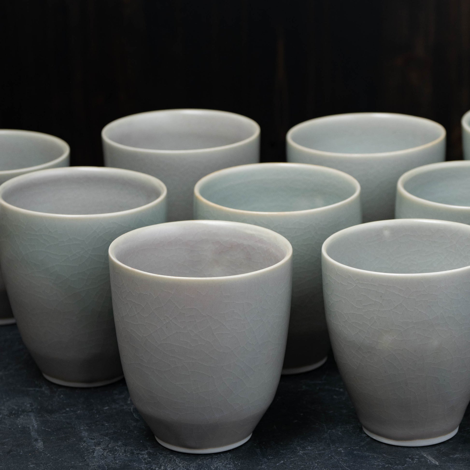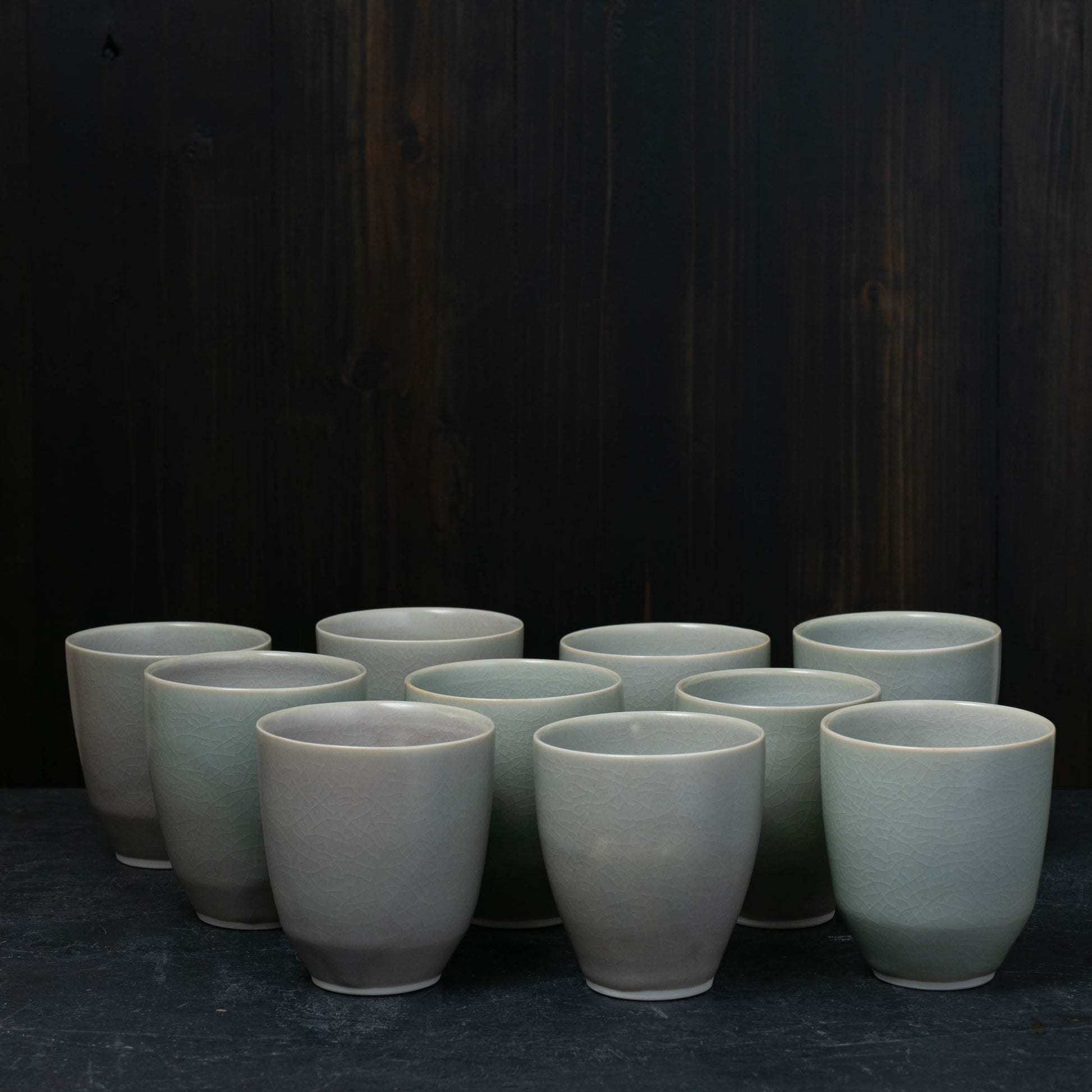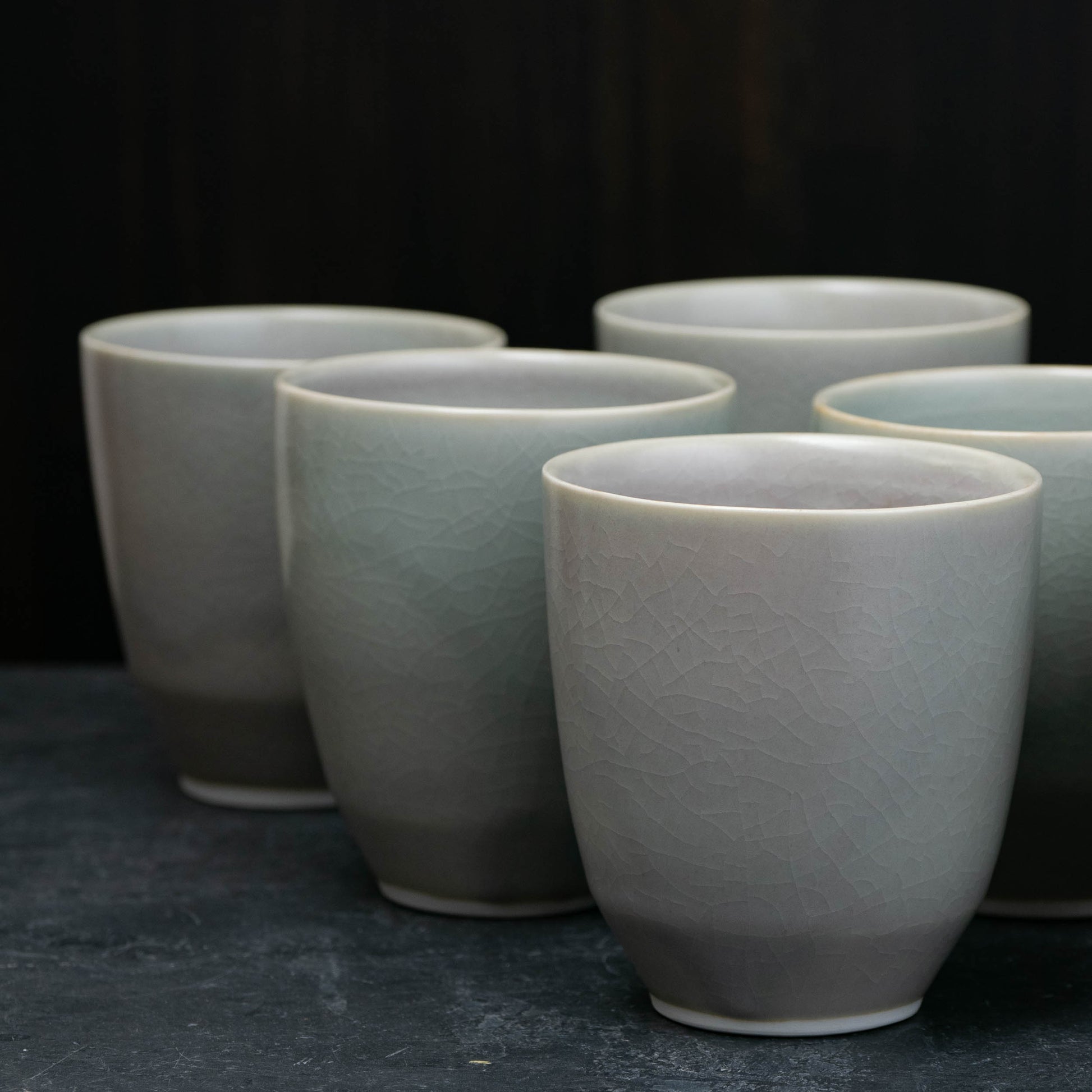 Wheel thrown porcelain tumbler glazed in celadon and reduction fired in a gas kiln. Celadon glazes were invented in China to emulate the look of jade. The tradition spread to other countries in Asia including Japan, Korea, and Thailand.