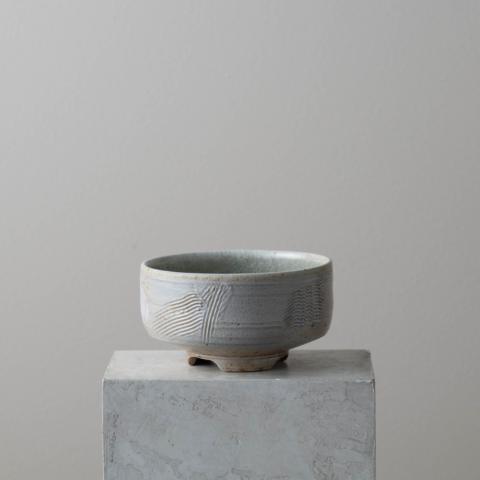 Wheel thrown stoneware chawan with textured slip decoration on the outside. Finished with flashing slip, flame, ash, and salt on the exterior. Coated with a crackle slip and glazed in a celadon glaze on the interior.