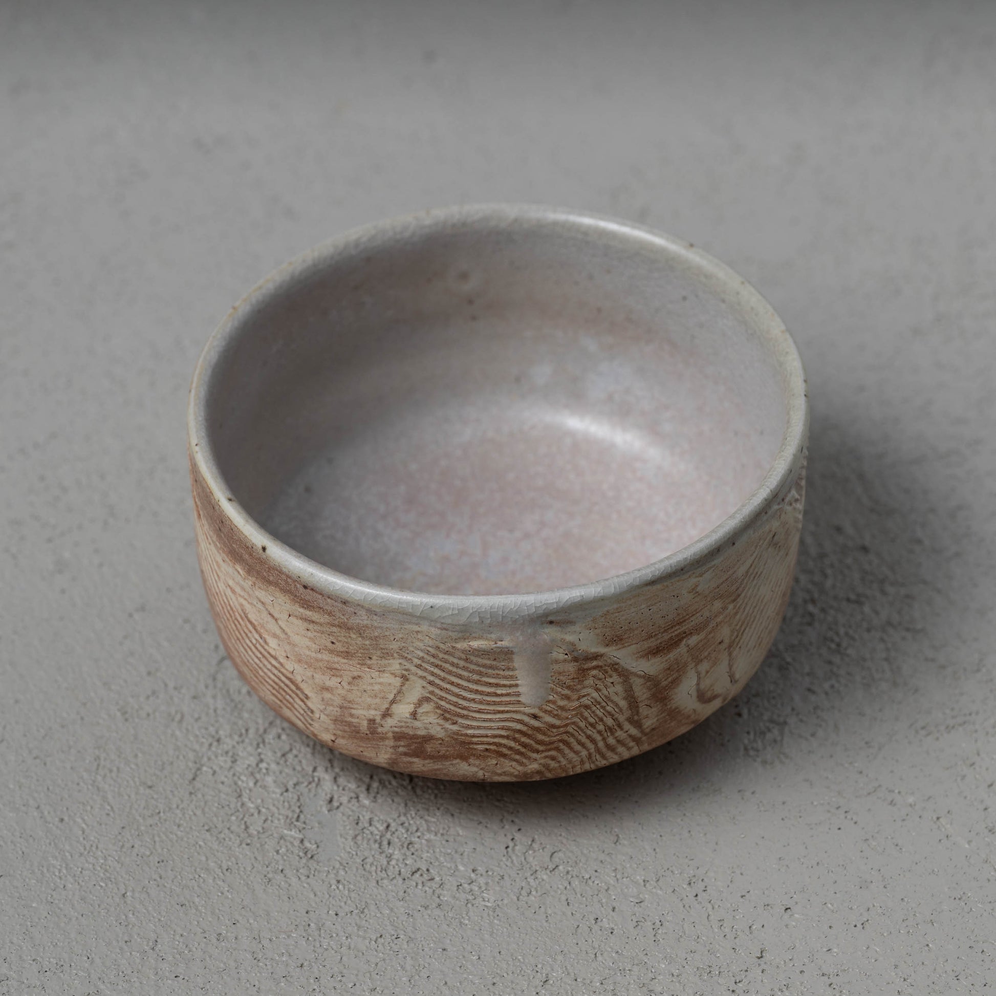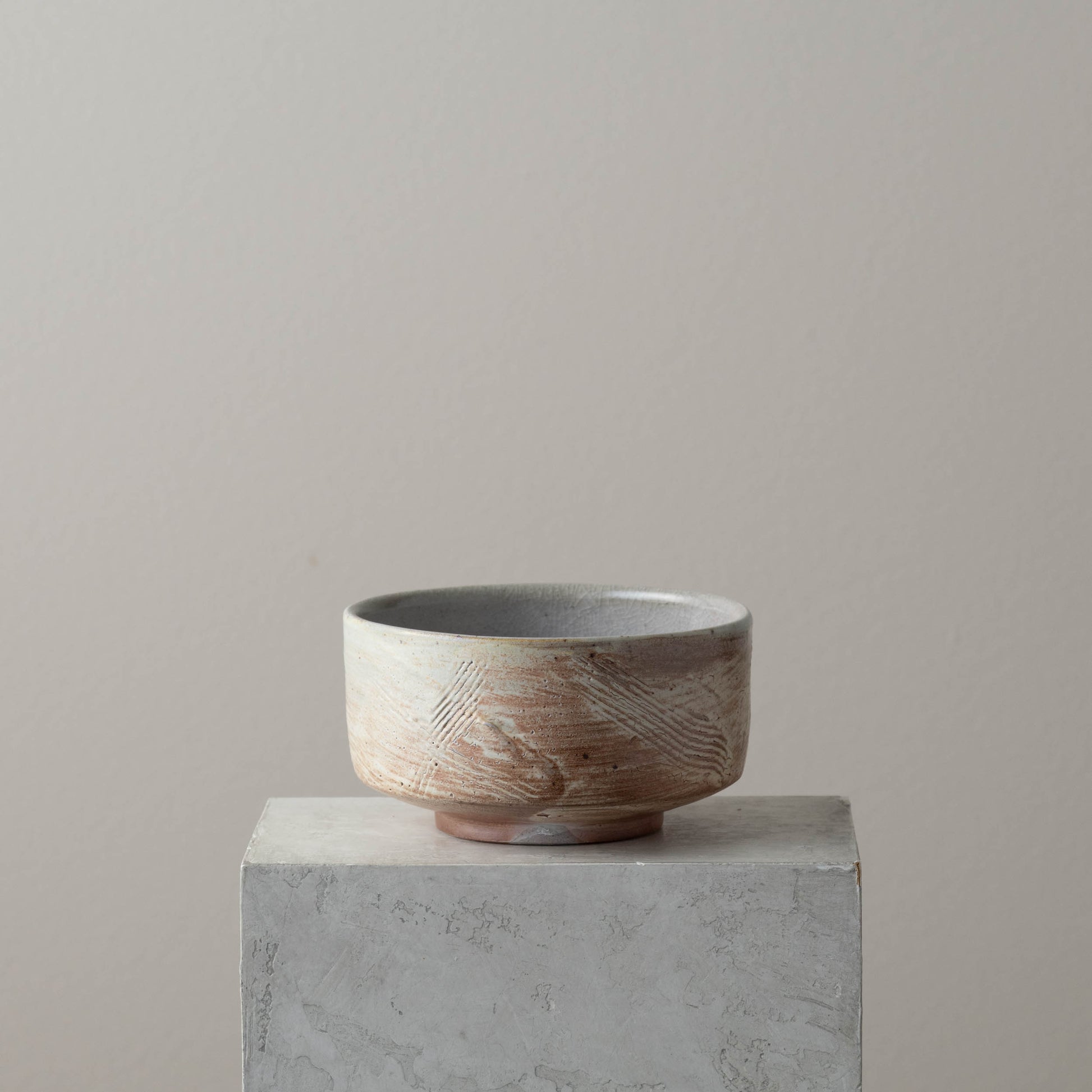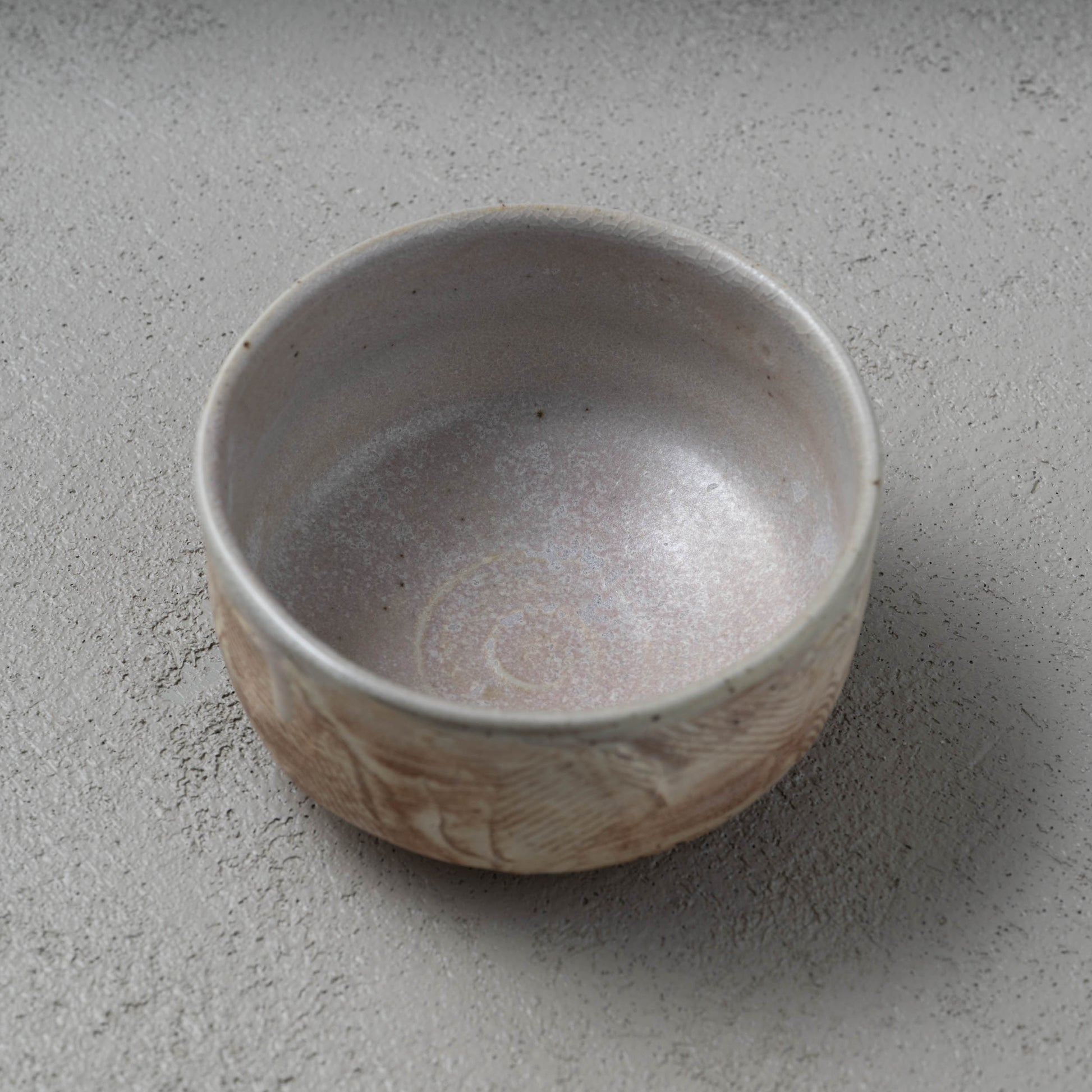 Wheel thrown stoneware chawan with textured slip decoration on the outside. Finished with flashing slip, flame, ash, and salt on the exterior. Glazed in shino glaze on the interior.