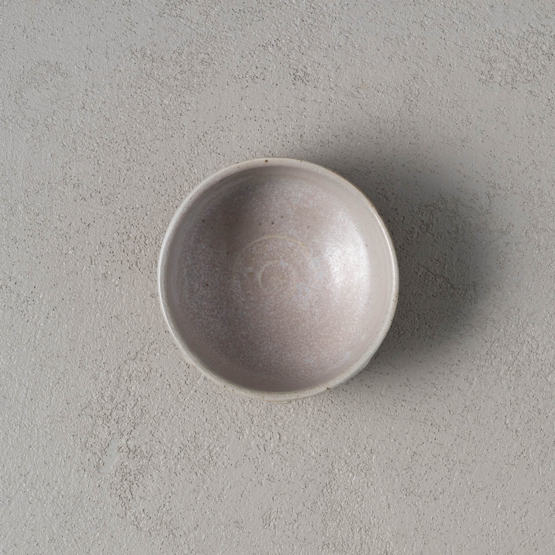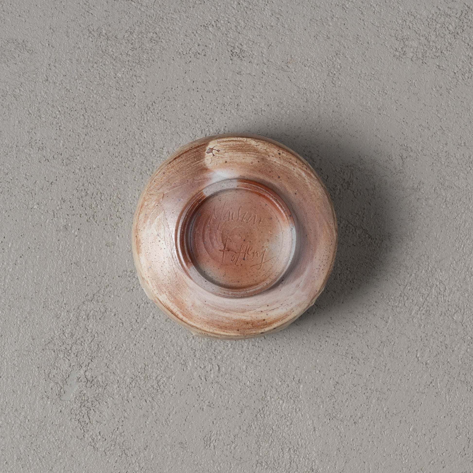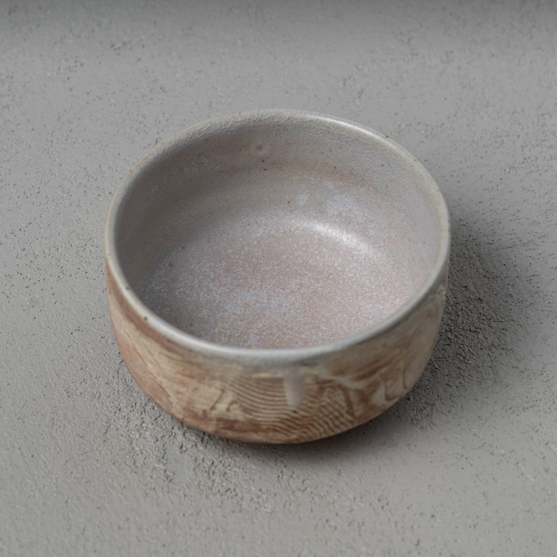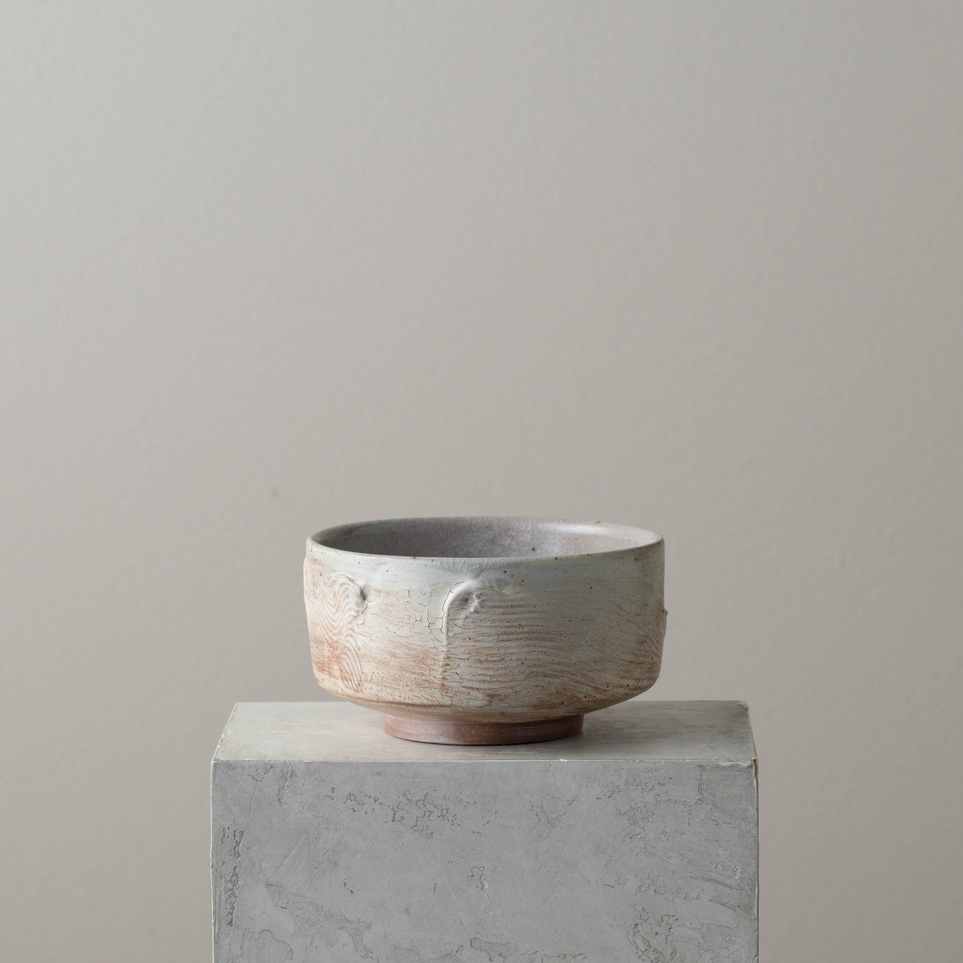 Wheel thrown stoneware chawan with textured slip decoration on the outside. Finished with flashing slip, flame, ash, and salt on the exterior. Glazed in shino glaze on the interior.