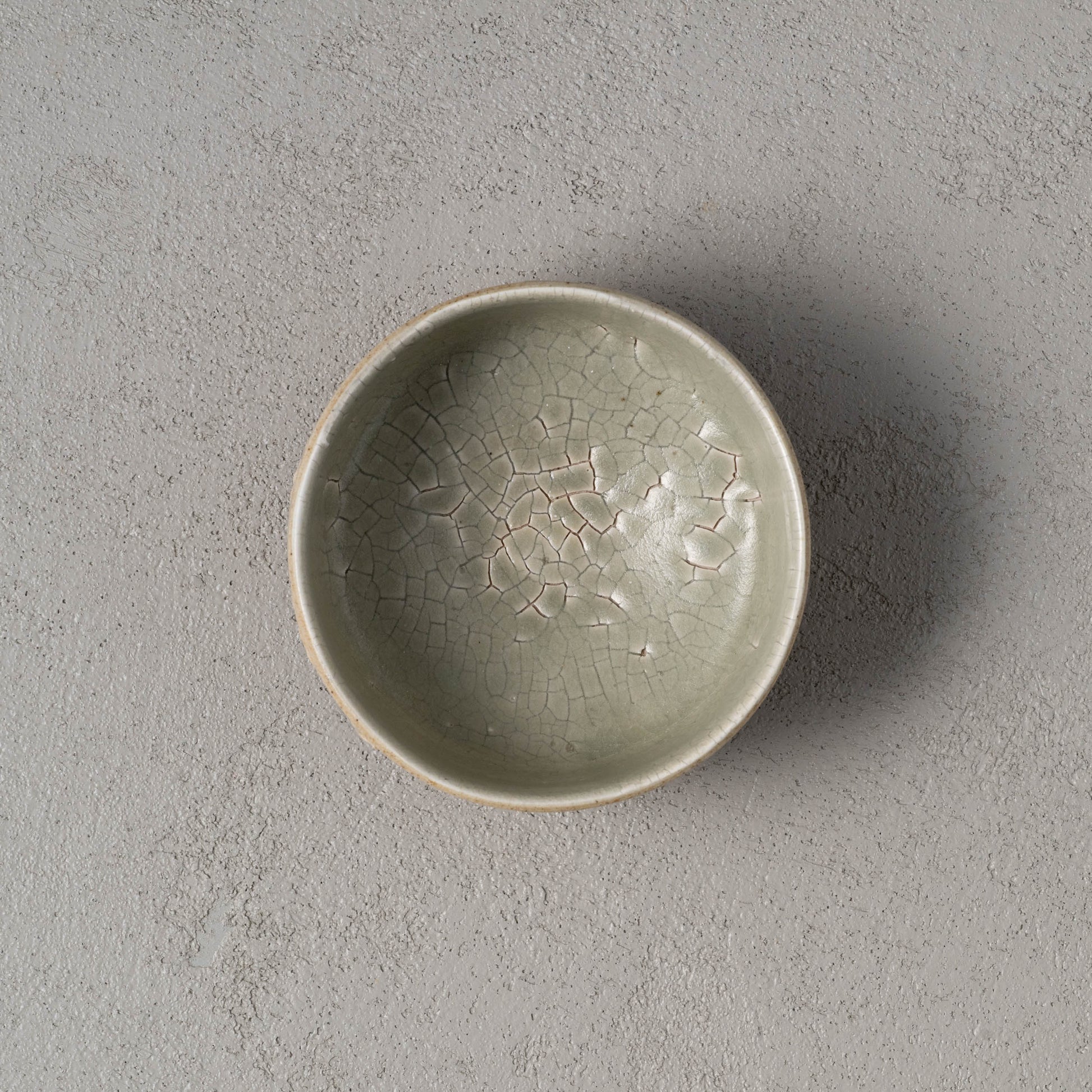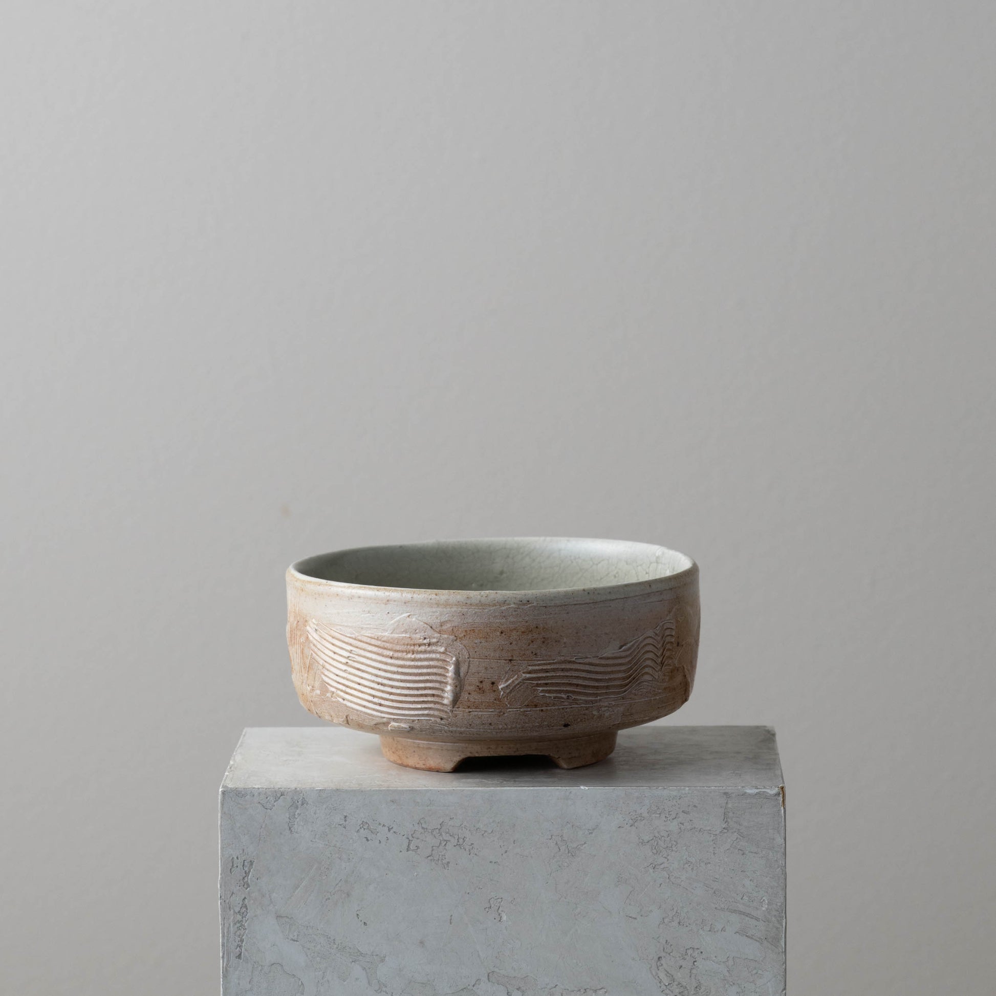 Wheel thrown stoneware chawan with textured slip decoration on the outside. Finished with flashing slip, flame, ash, and salt on the exterior. Coated with a crackle slip and glazed in a celadon glaze on the interior.
