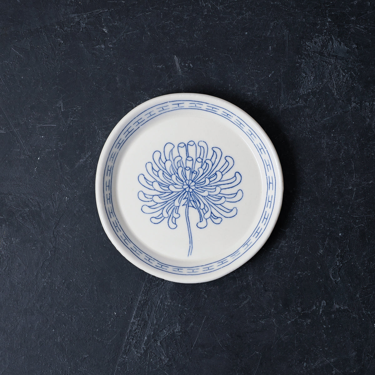A small round dish with a chrysanthemum motif bordered by an inset-i-fret motif.