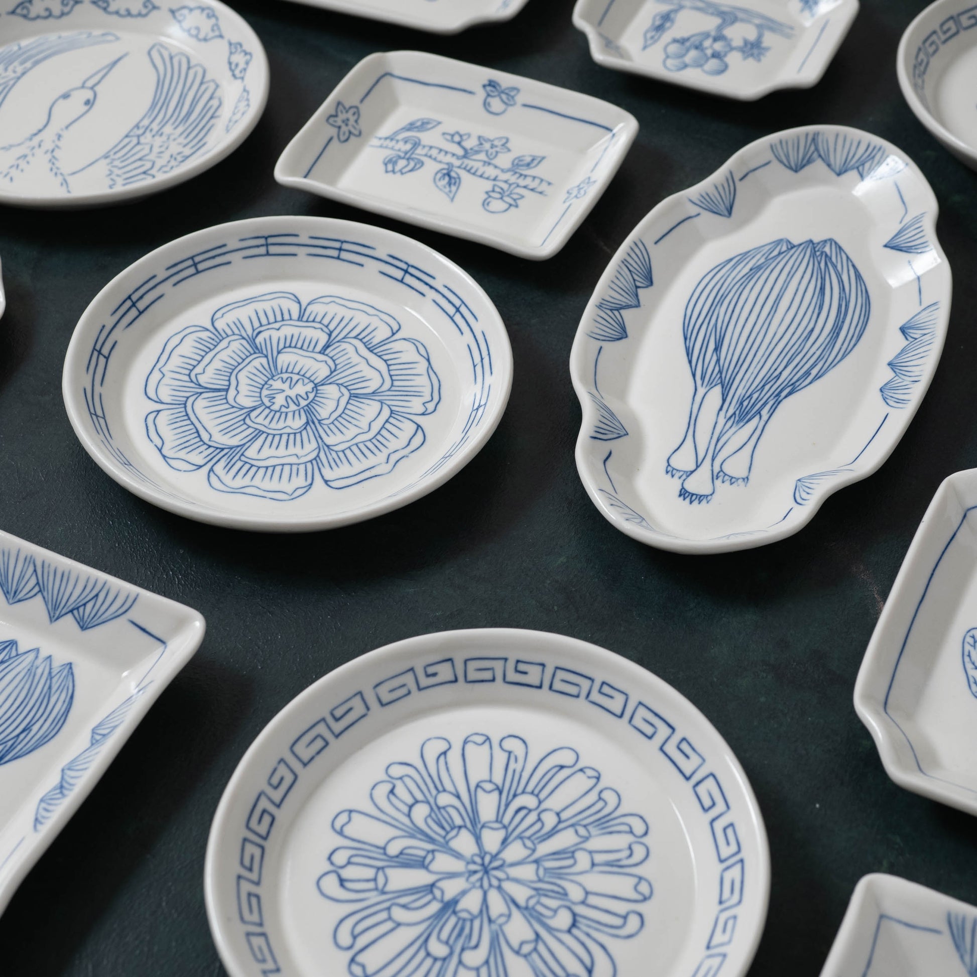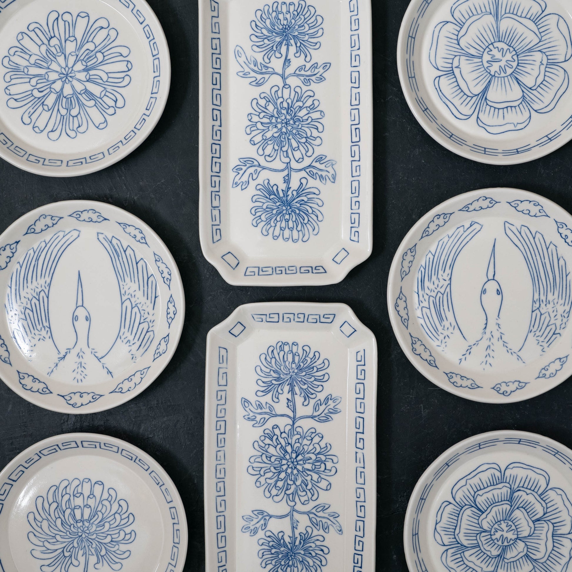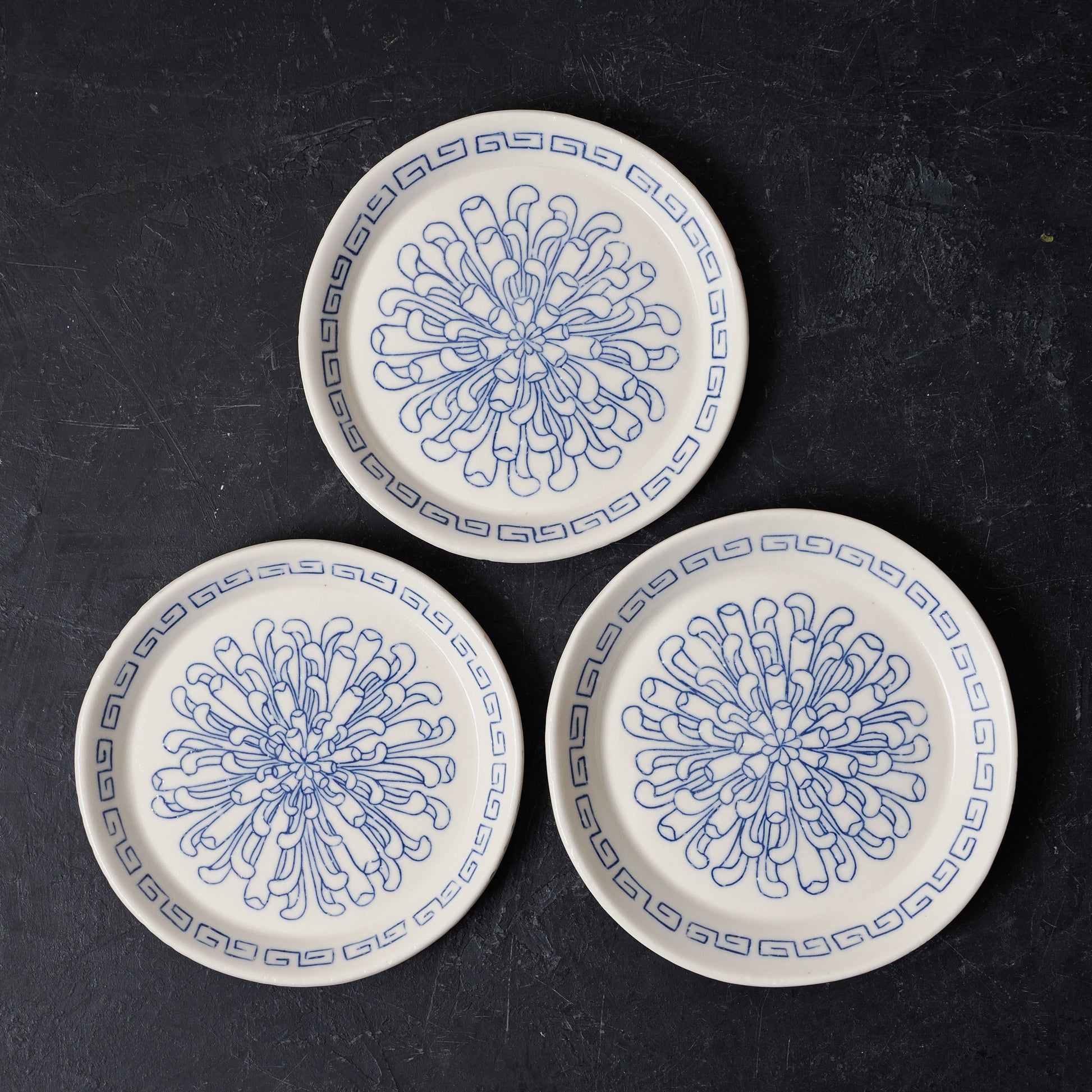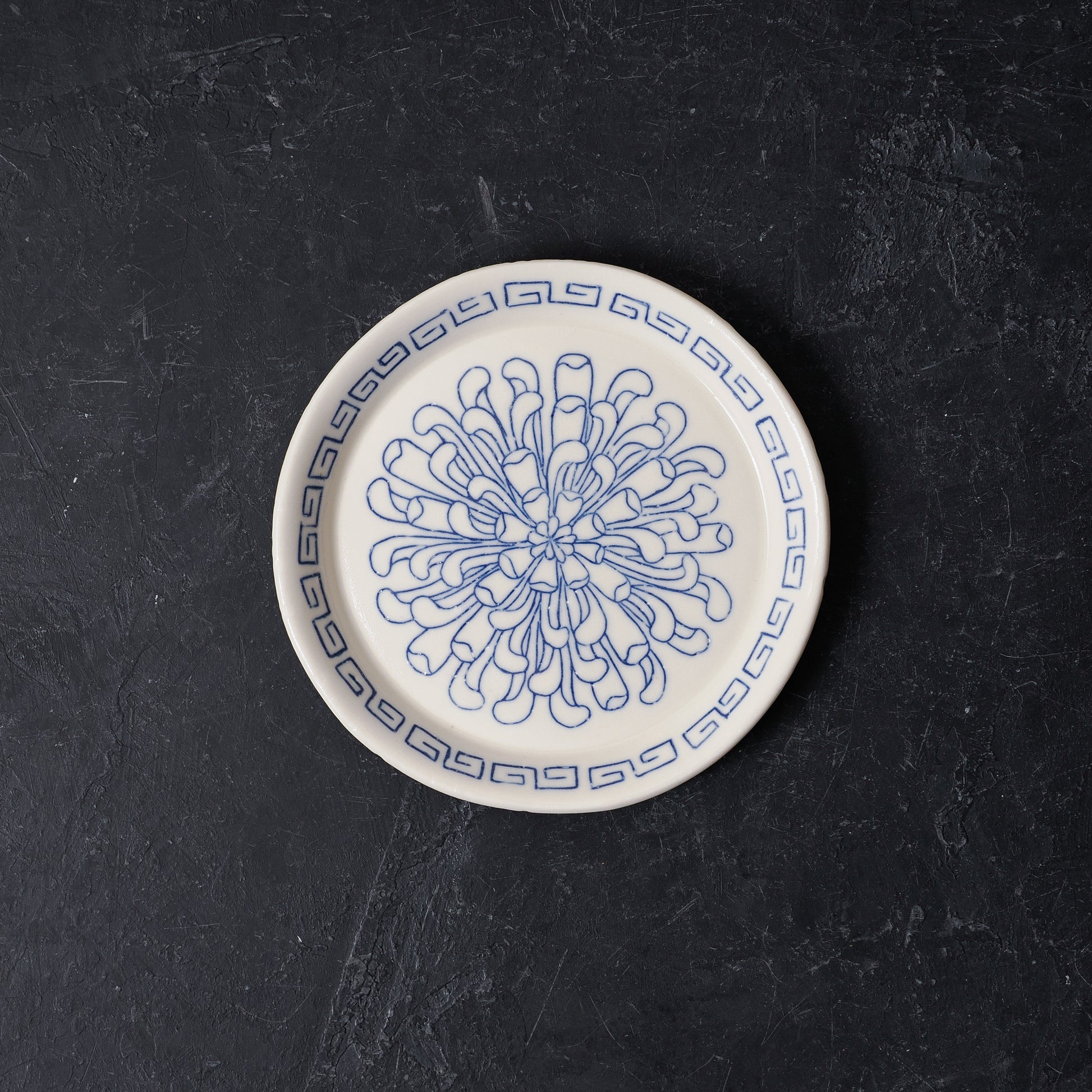 A round dish with a chrysanthemum in full bloom surrounded by an S-Fret motif.