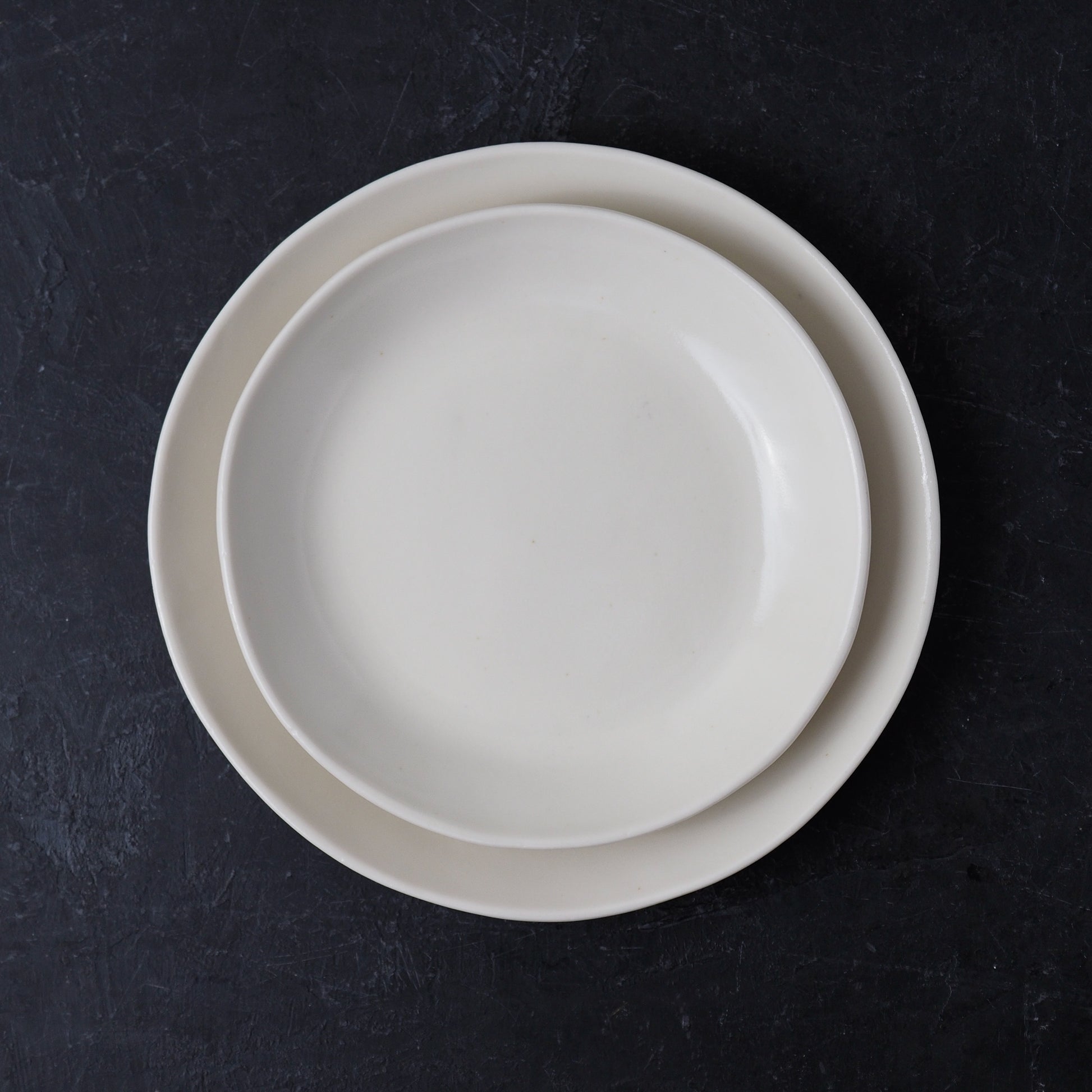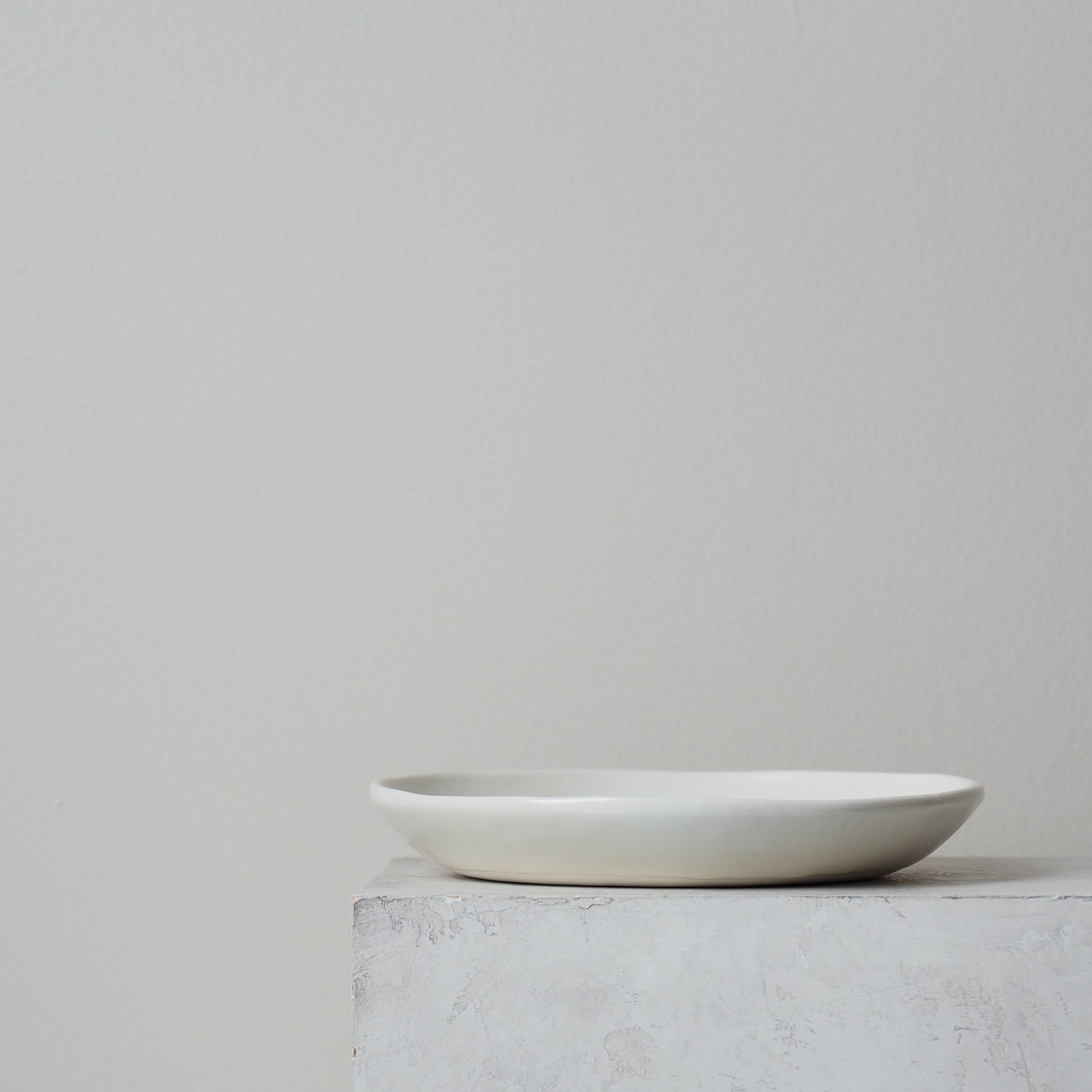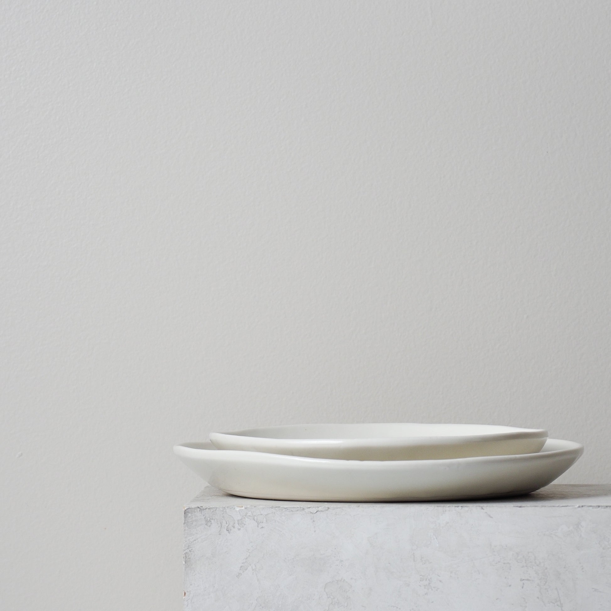 Slab-draped porcelain coupe style plates finished in a clear glaze--all you see is the beauty of the material. Porcelain is elastic and we love how it almost has a mind of its own. We created this line to celebrate the wabi sabi nature of porcelain while bringing an easy elegance to your home.