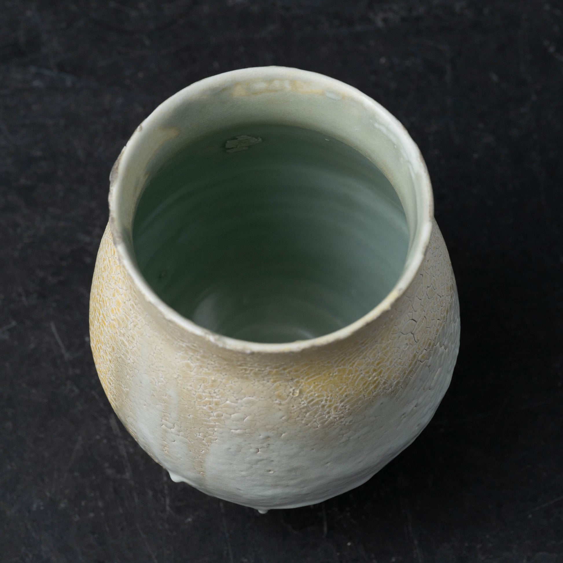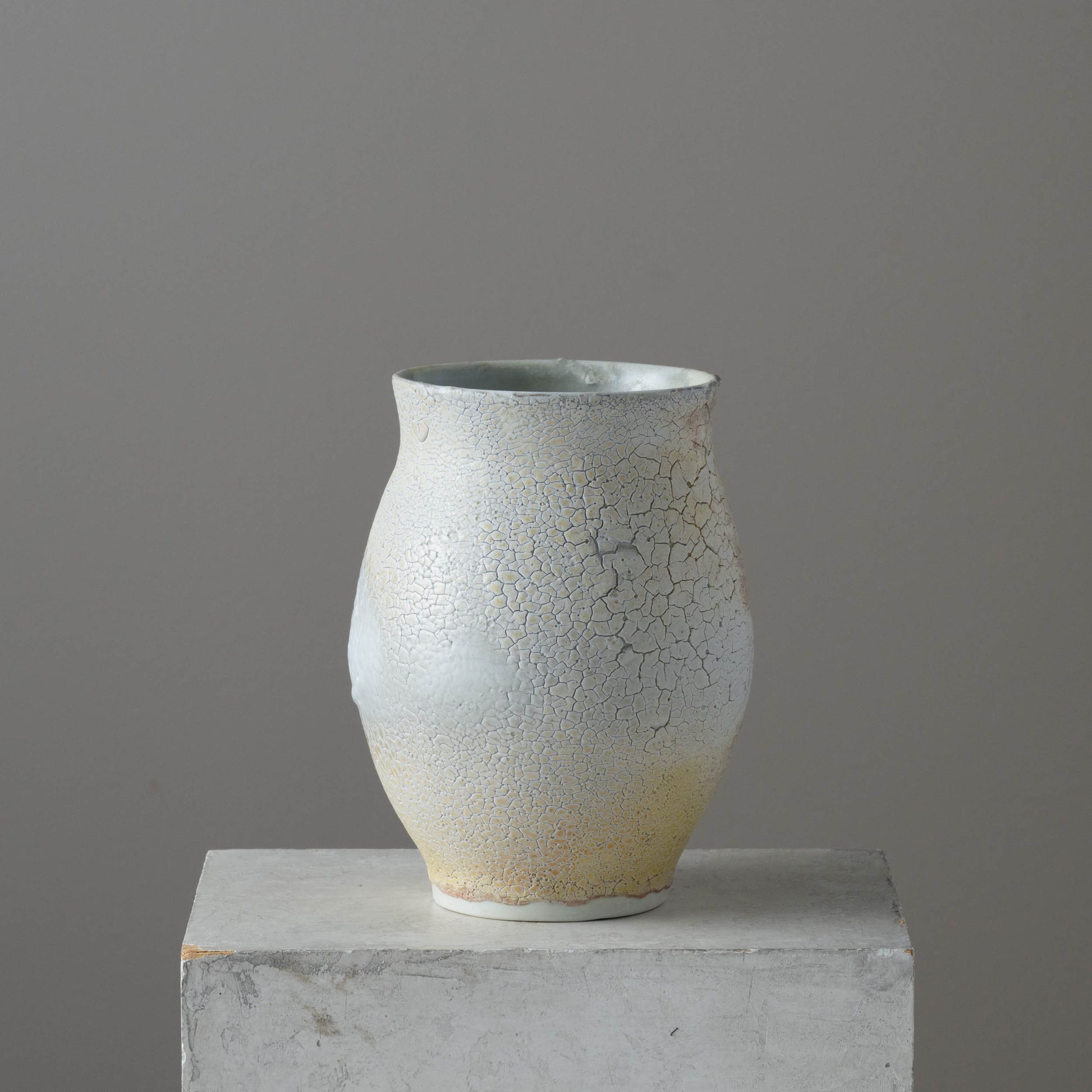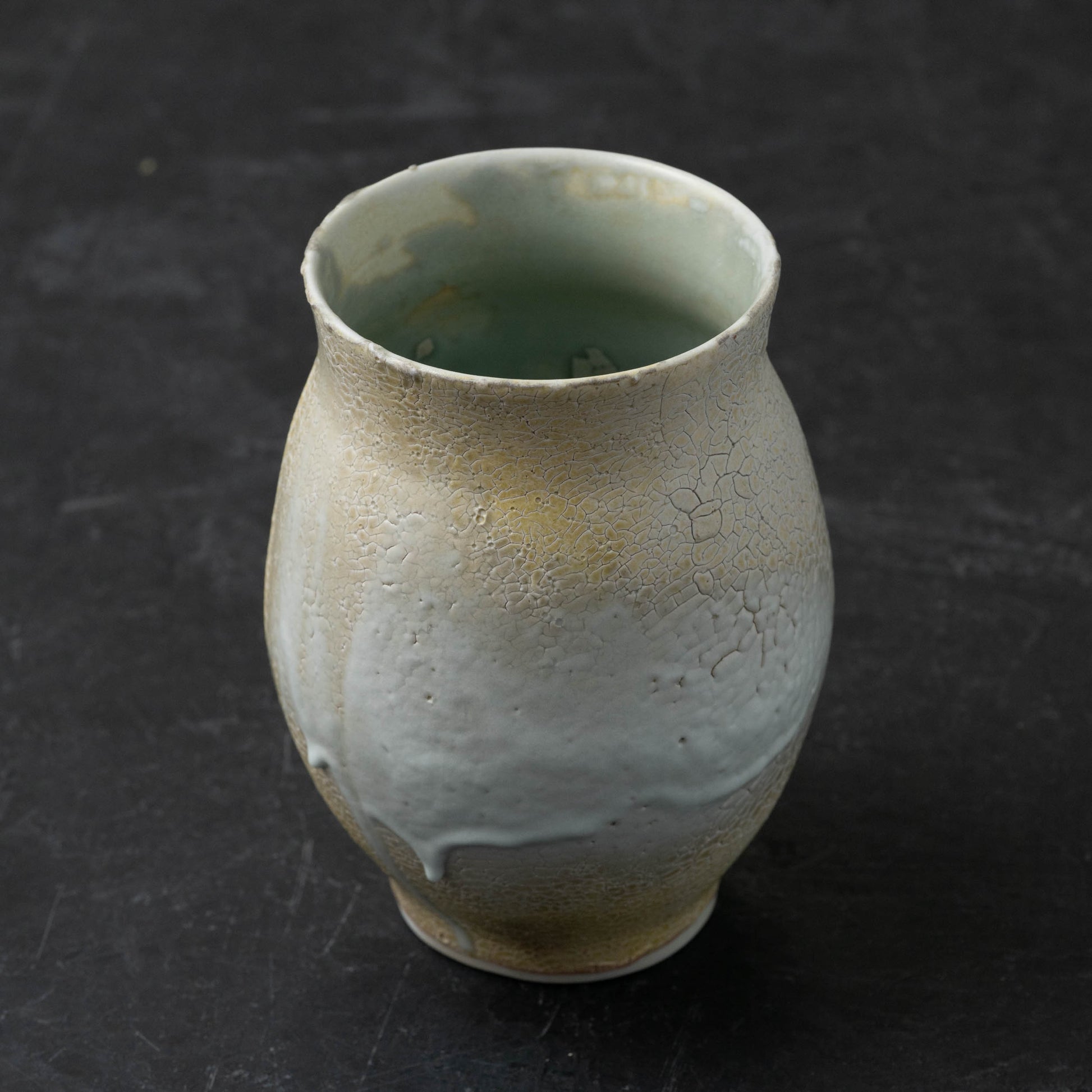 Wheel thrown narrow vase. Dipped in a crackle slip and layered with a celadon glaze. Fired in Dodgeville, WI.