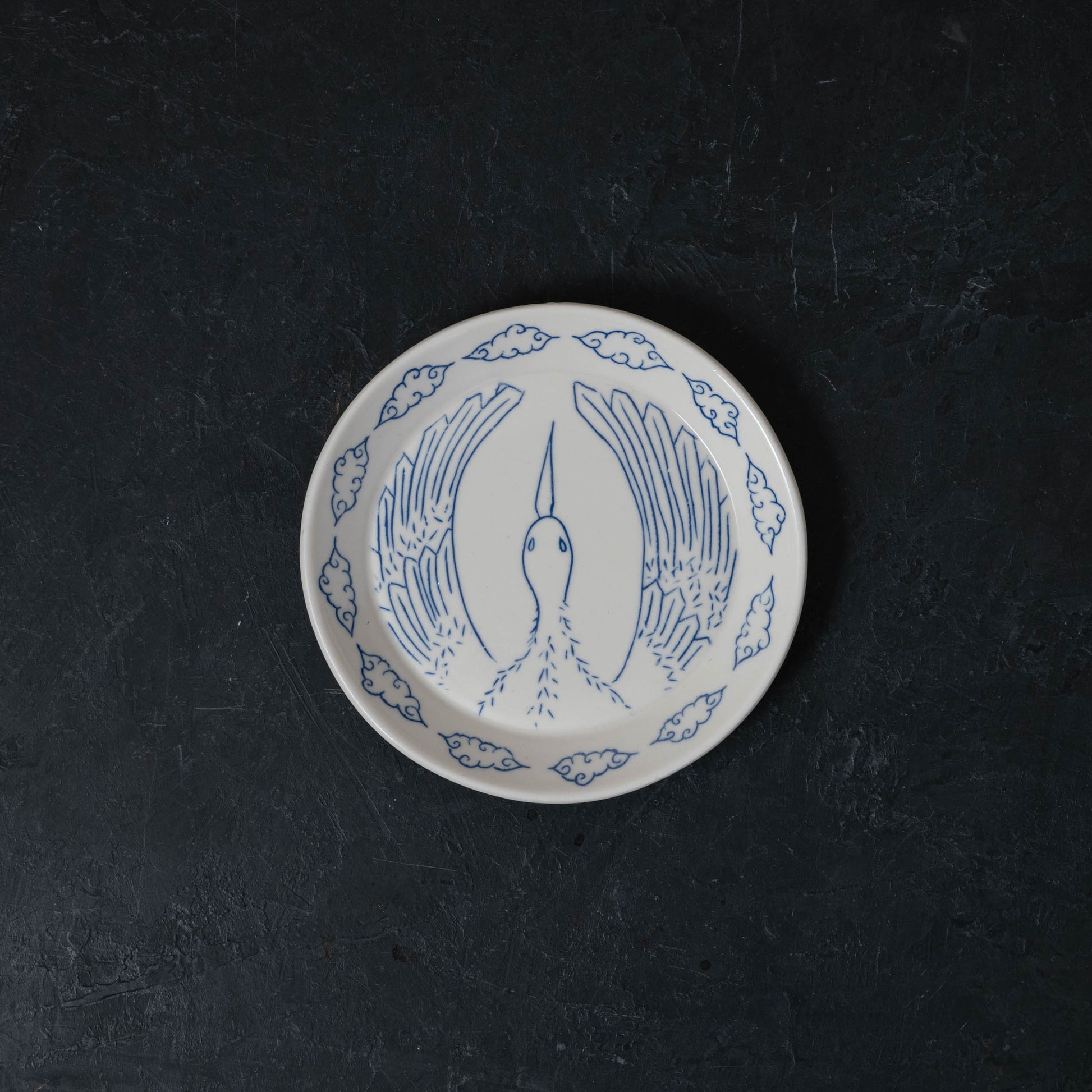 A small round dish decorated with a crane motif and surrounded by clouds. Cranes have come to symbolize longevity and peace in Chinese culture and clouds represent hope for a bright future.