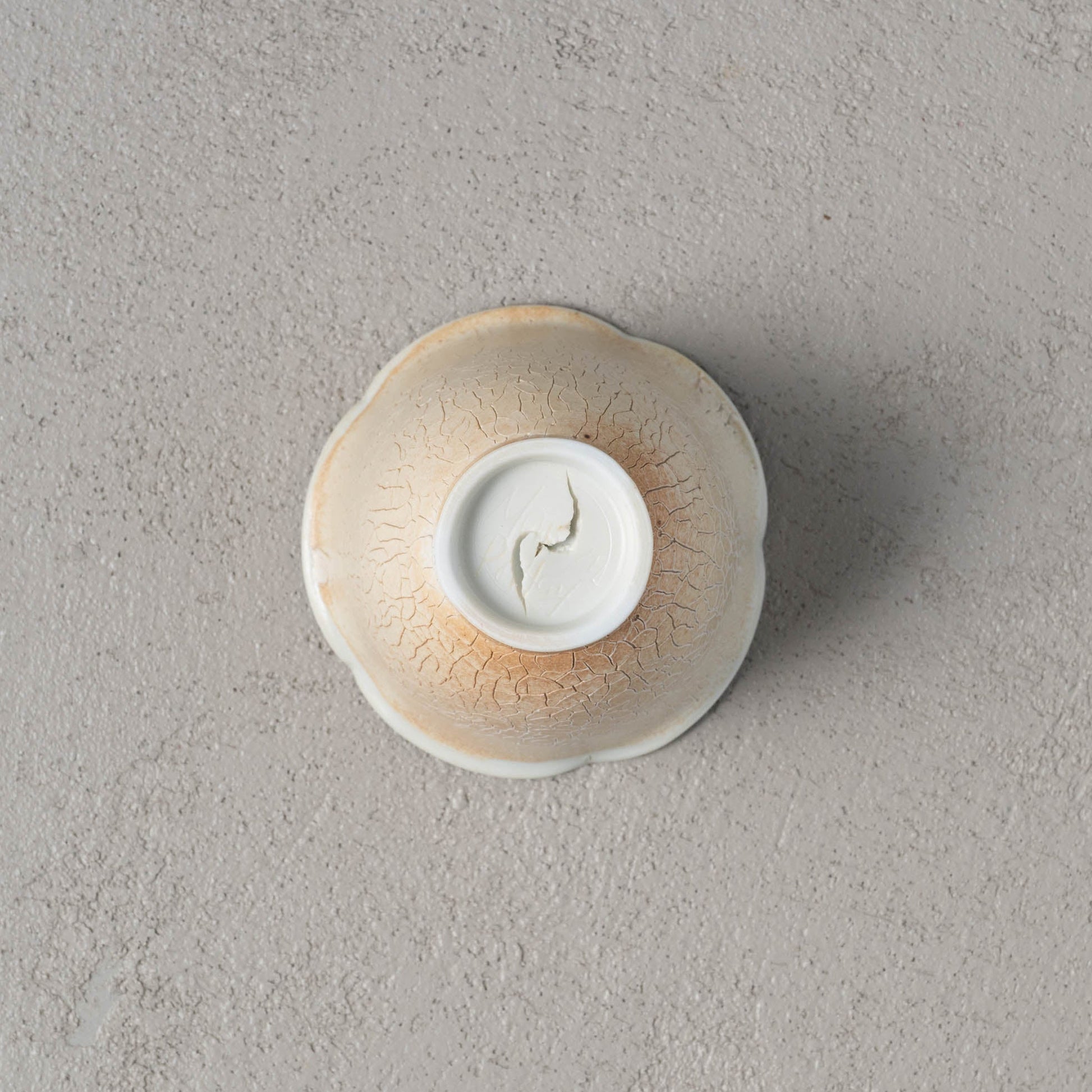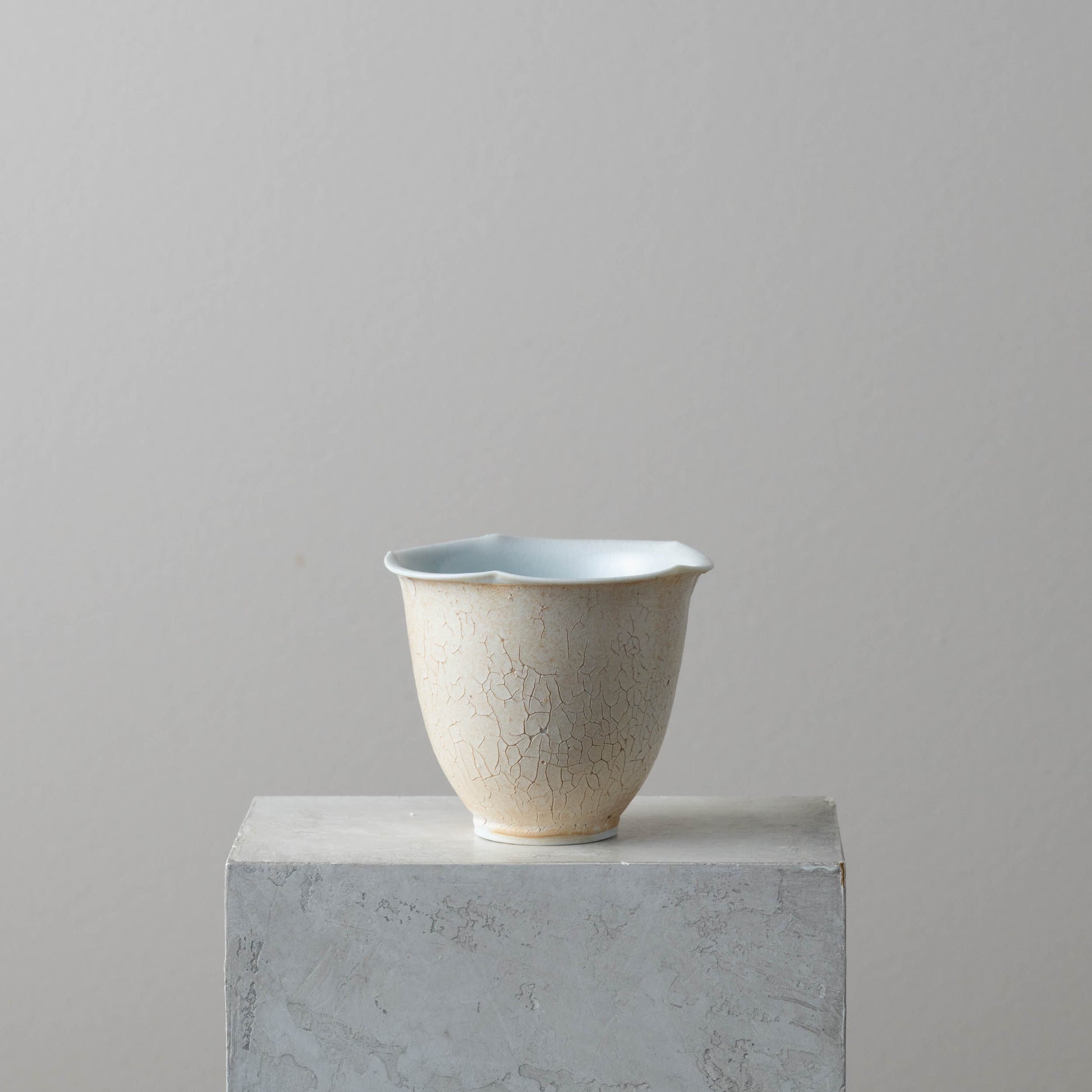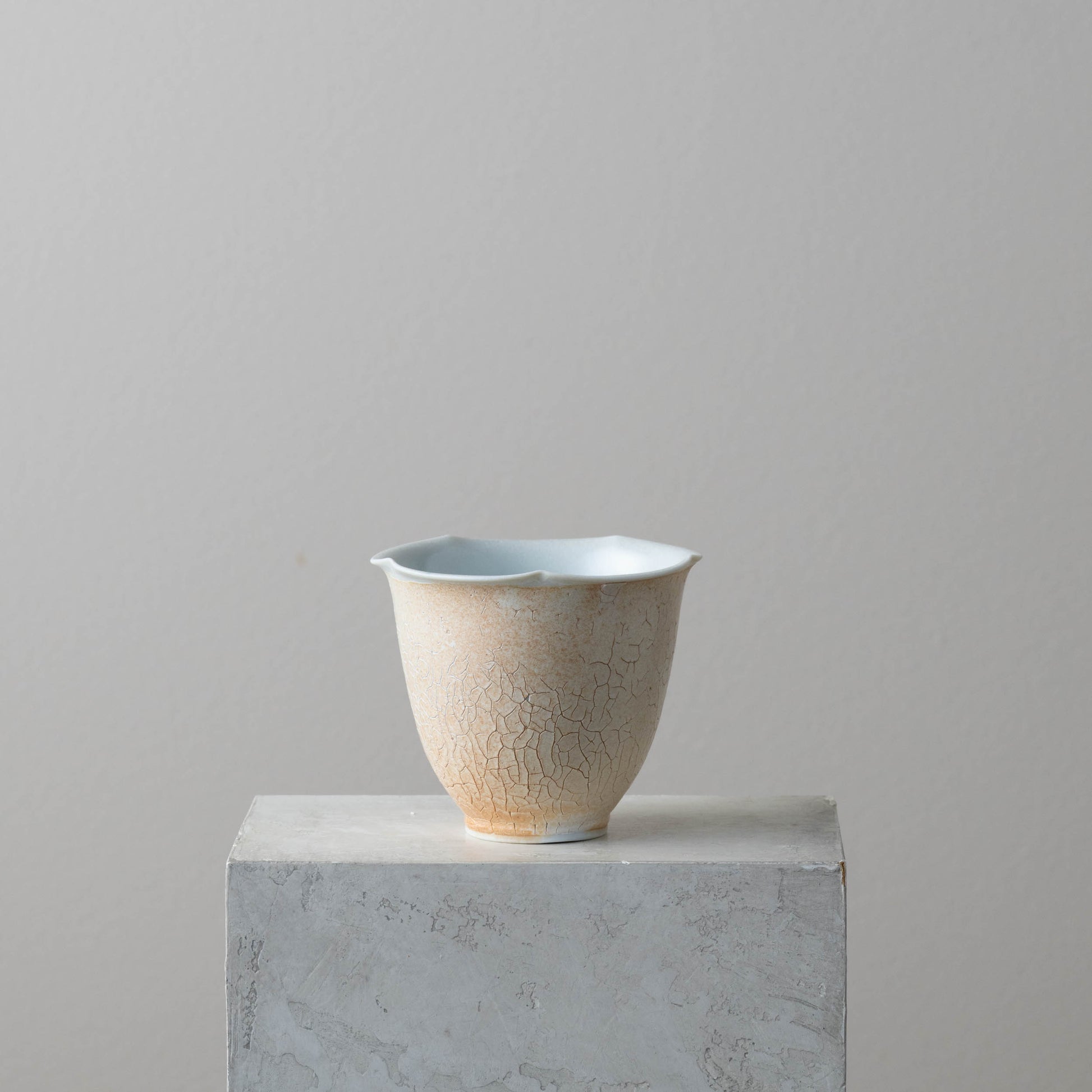 Wheel thrown stoneware cup with petal details. Glazed with a clear glaze on the interior and dipped in a crackle slip on the outside. Medium sized and would make a nice pair with Cup 6.