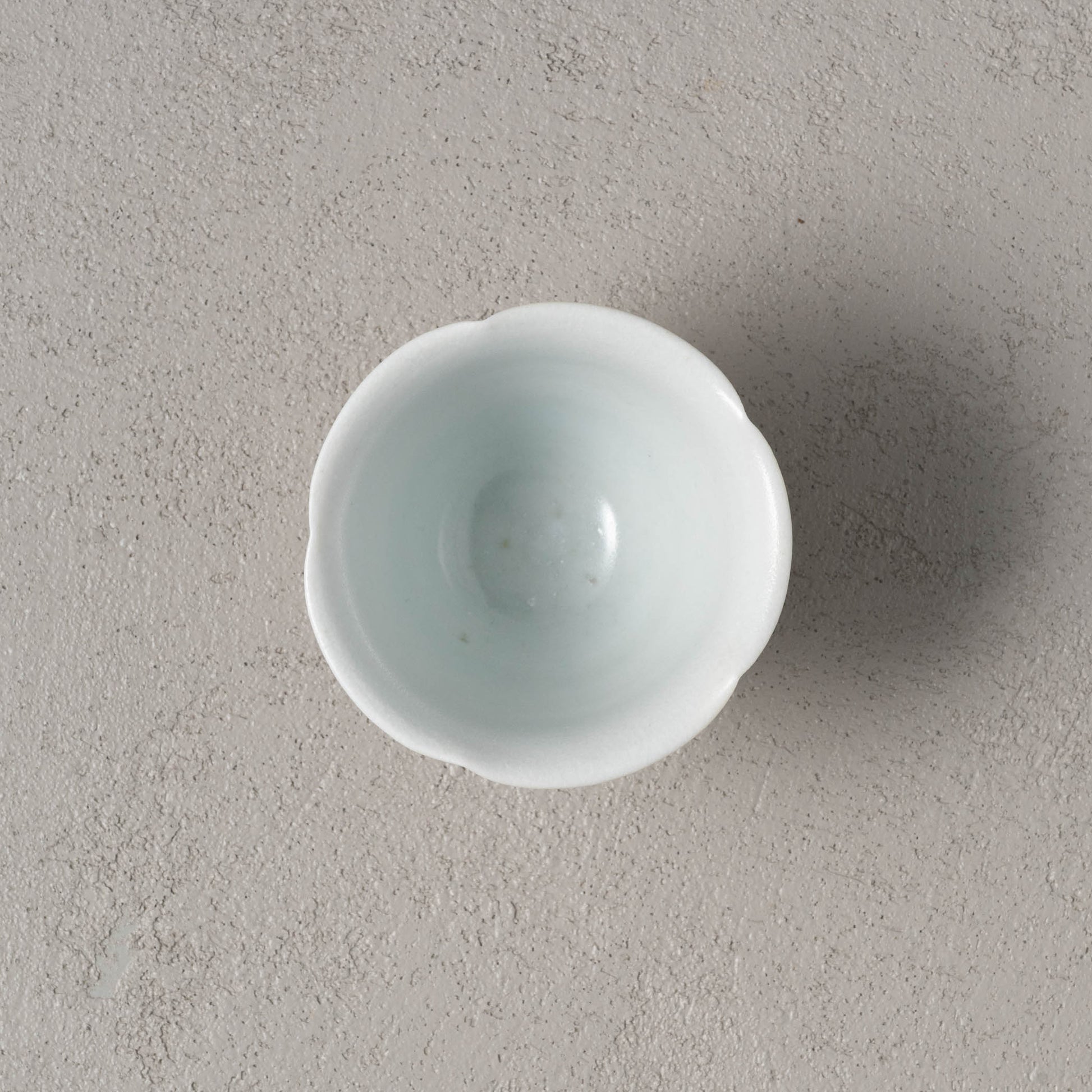 Wheel thrown stoneware cup with petal details. Glazed with a clear glaze on the interior and dipped in a crackle slip on the outside. Medium sized and would make a nice pair with Cup 5.