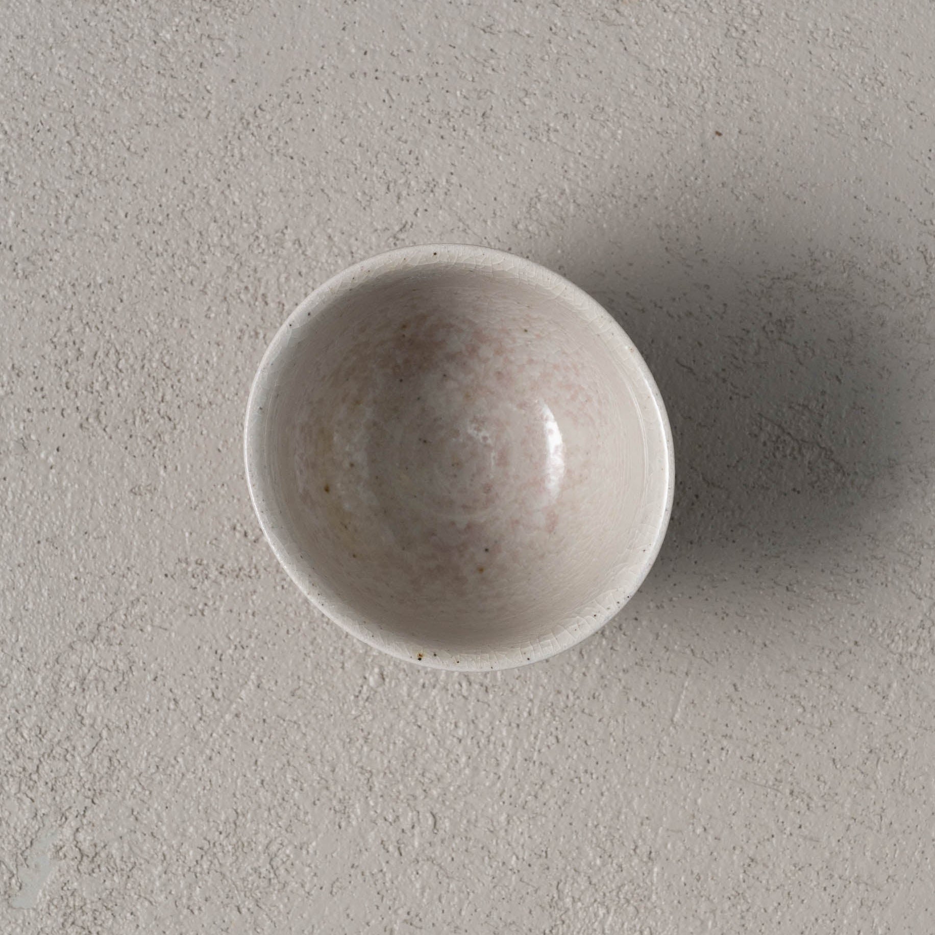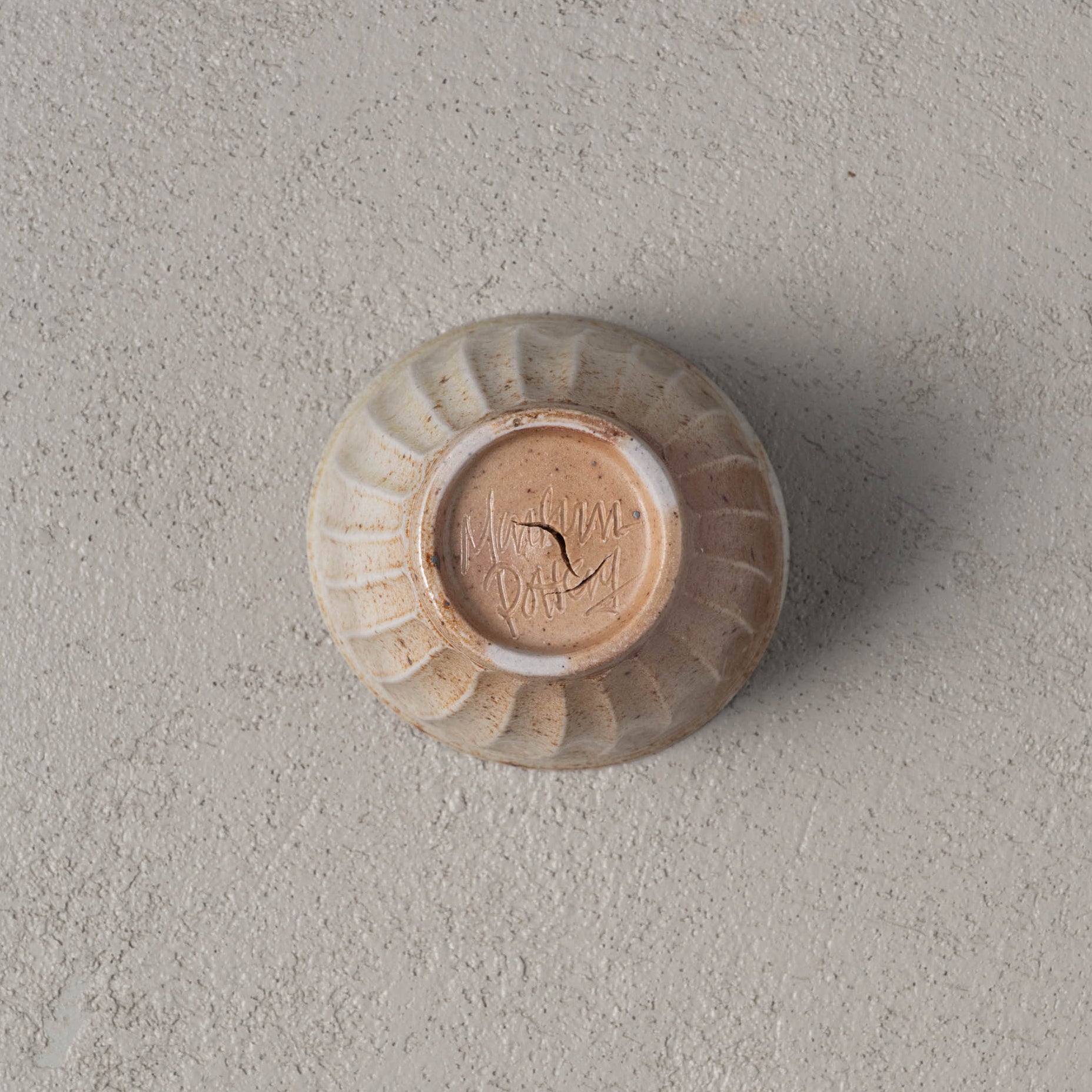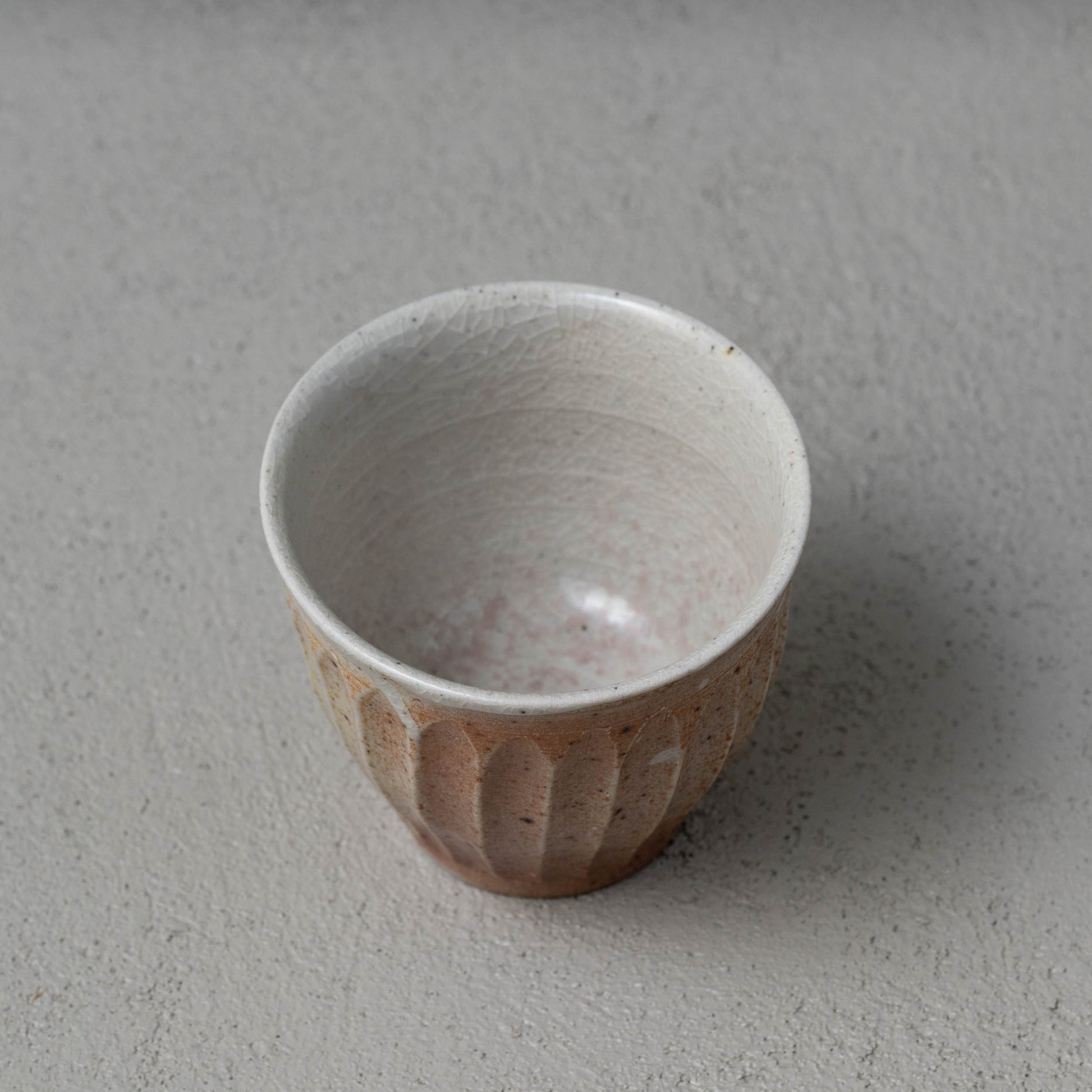 Wheel thrown stoneware cup with hand-fluted exterior. Decorated only with ash, flame, and salt on the exterior and glazed with a shino glaze on the inside. Medium sized.