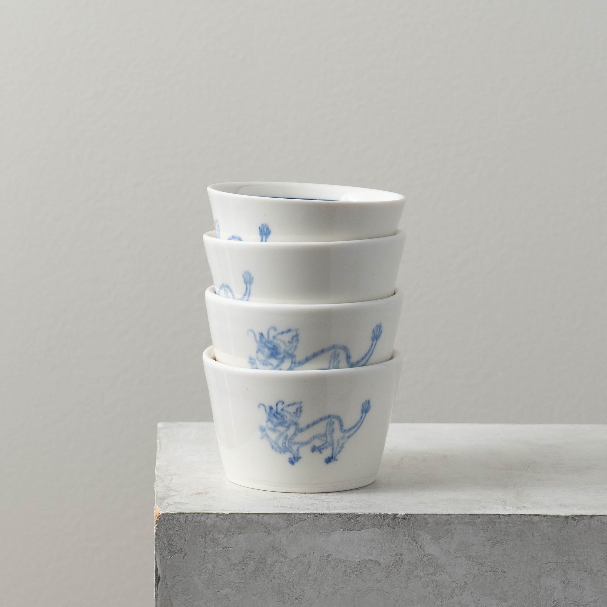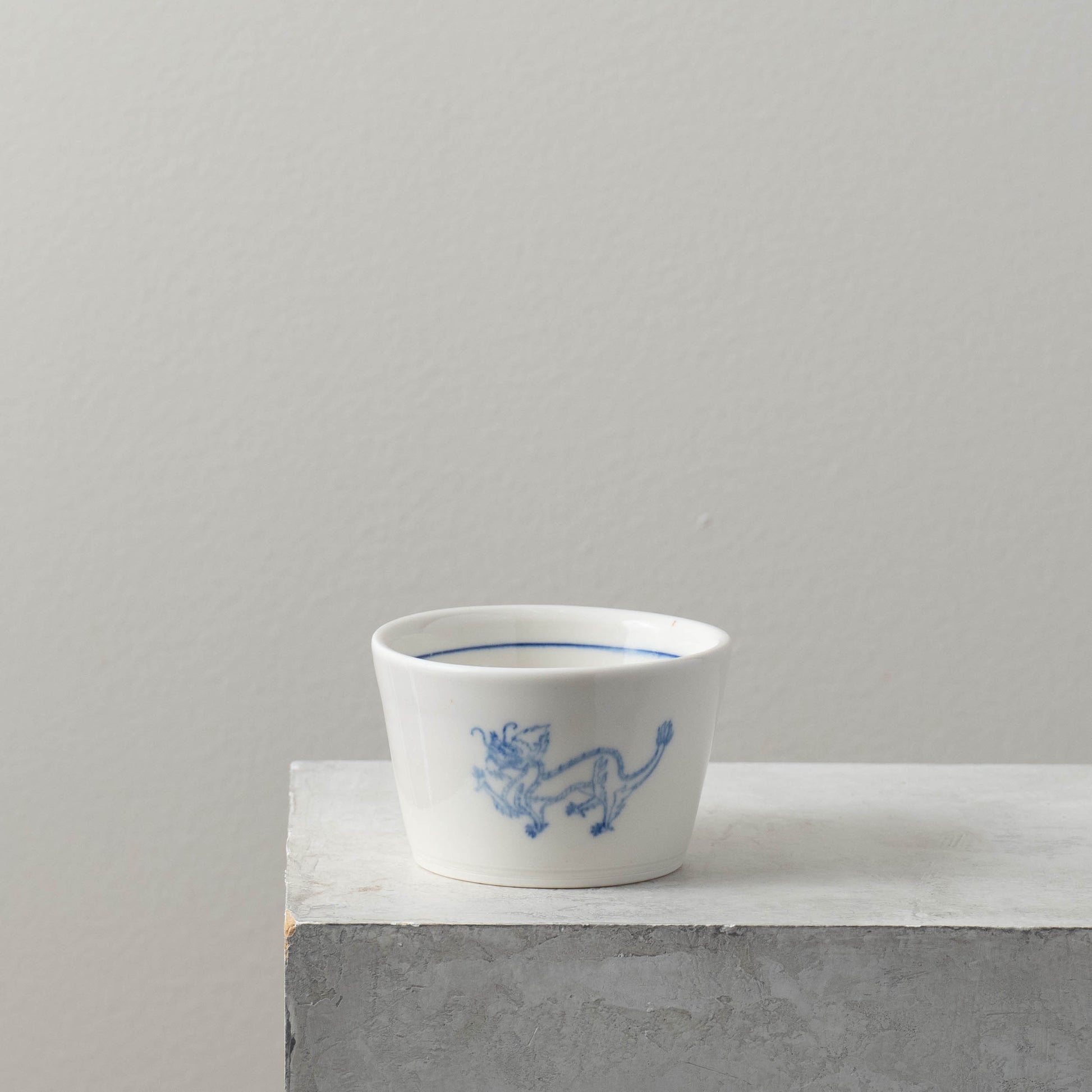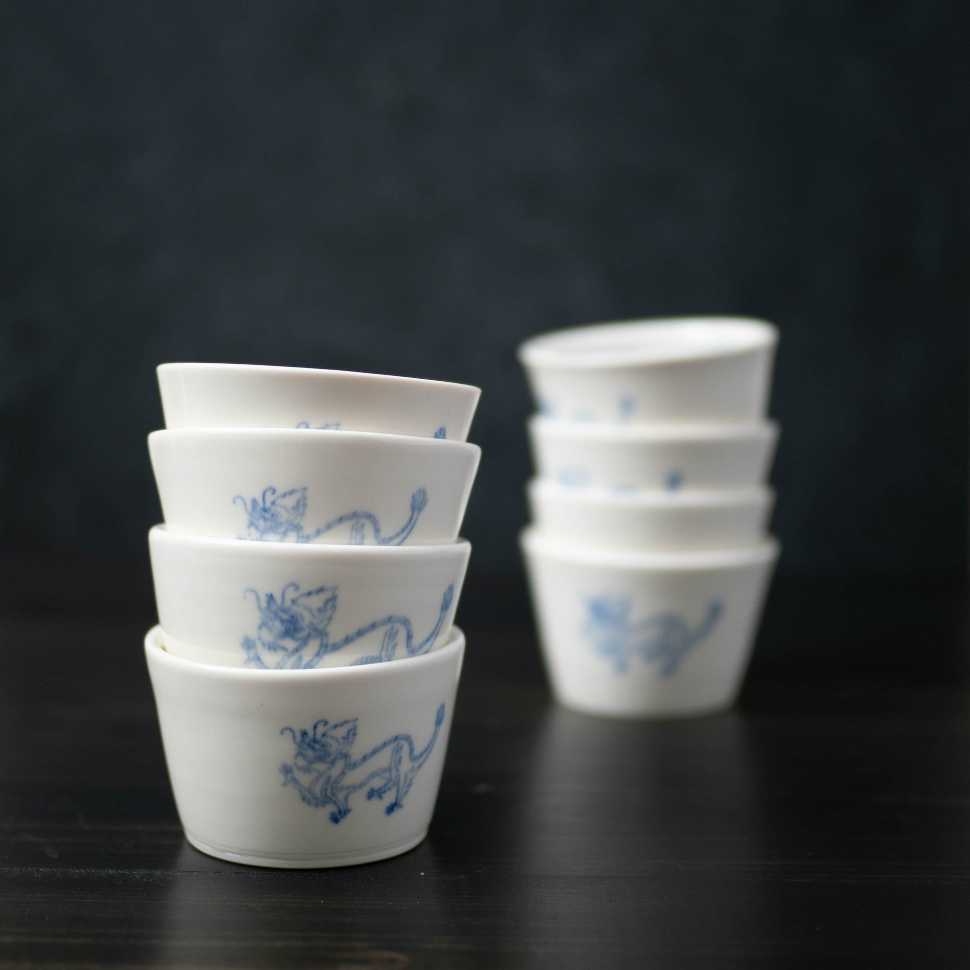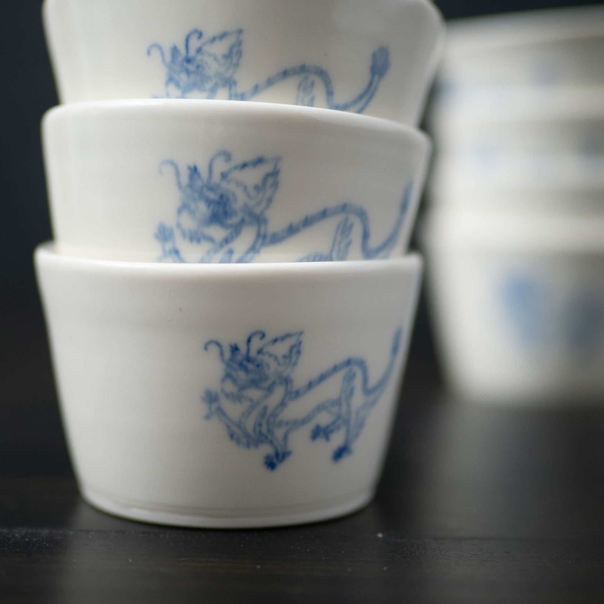 Wheel thrown porcelain cup decorated with a dragon motif. Each cup has a blue line on the inside of the rim. Designed for juice, whiskey, and/or soba dipping. Discounted due to a bad firing. Dragon is a bit blurry. The quality of the cup itself remains very high. We find the form successful and it will function beautifully.