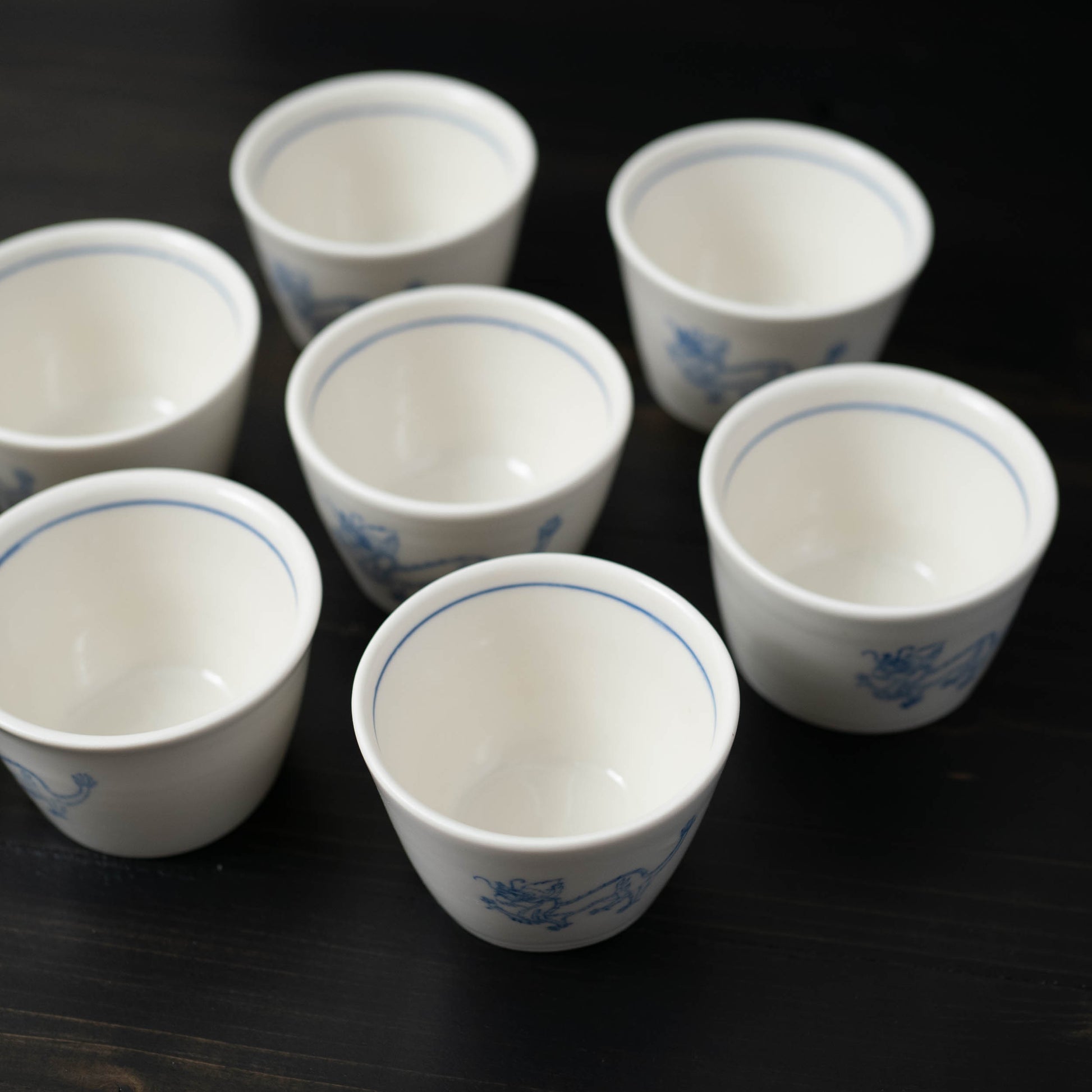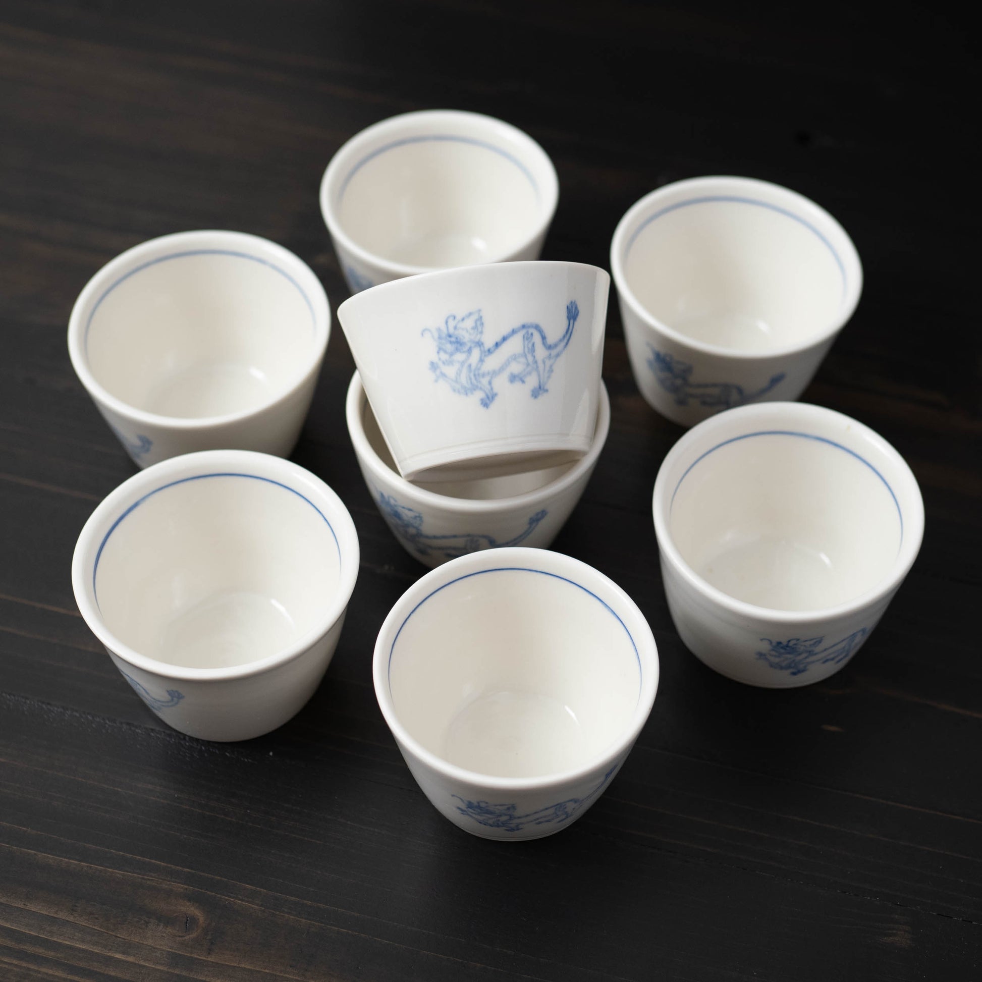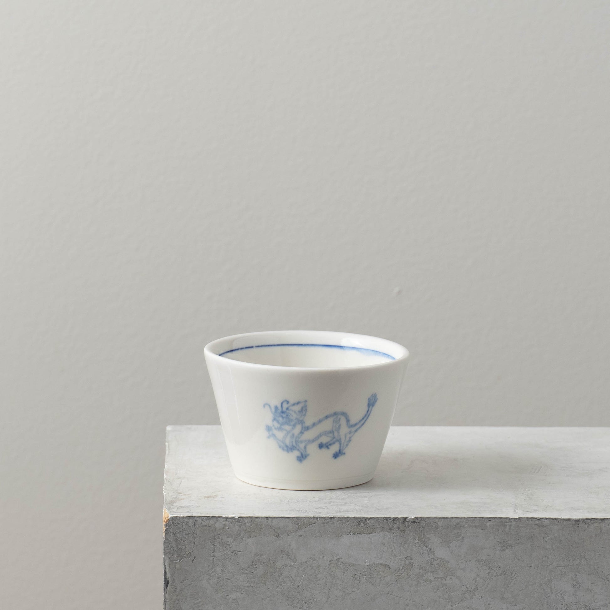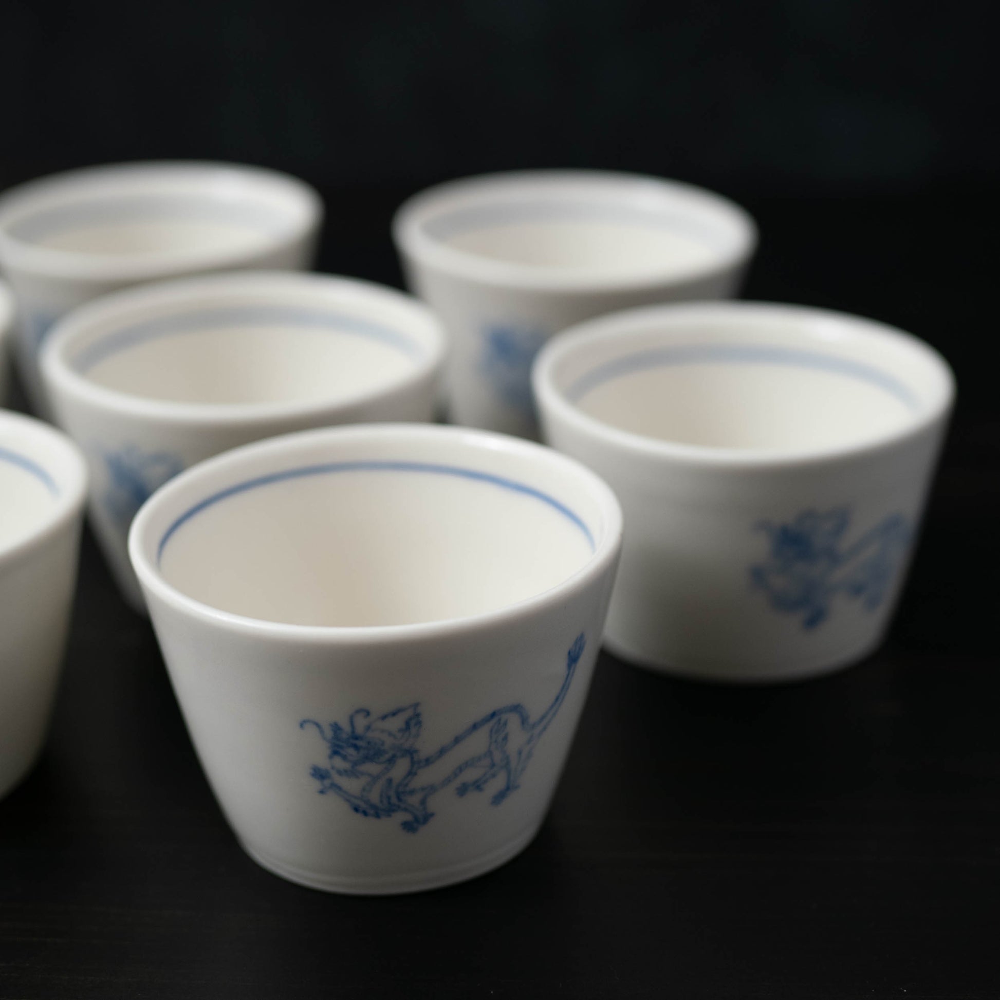 Wheel thrown porcelain cup decorated with a dragon motif. Each cup has a blue line on the inside of the rim. Designed for juice, whiskey, and/or soba dipping. Discounted due to a bad firing. Dragon is a bit blurry. The quality of the cup itself remains very high. We find the form successful and it will function beautifully.