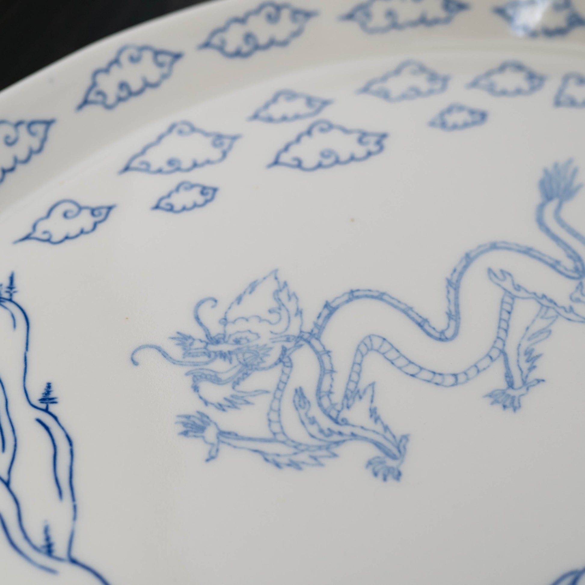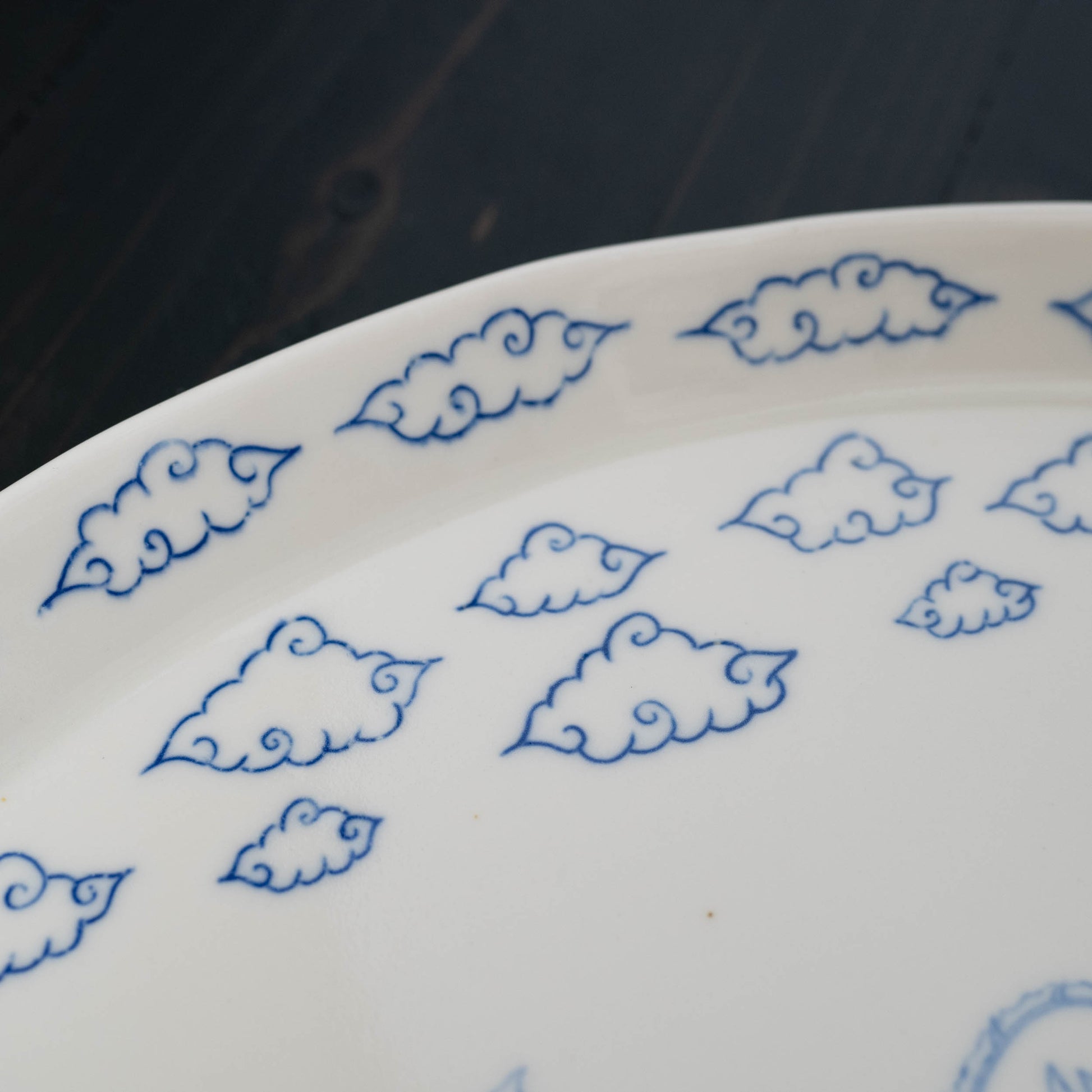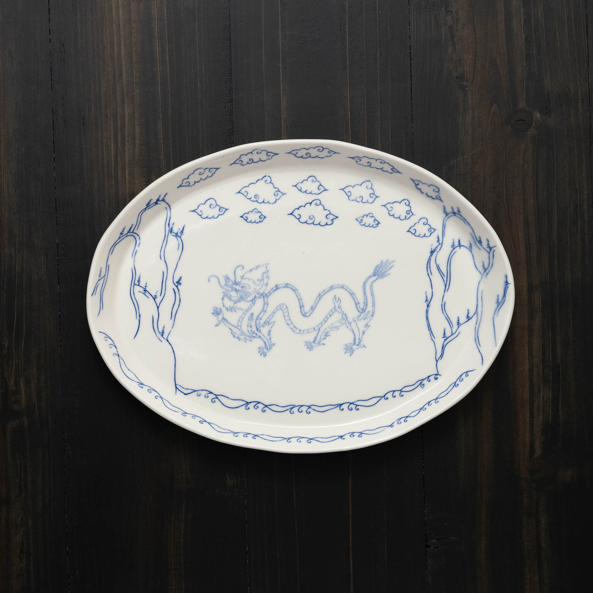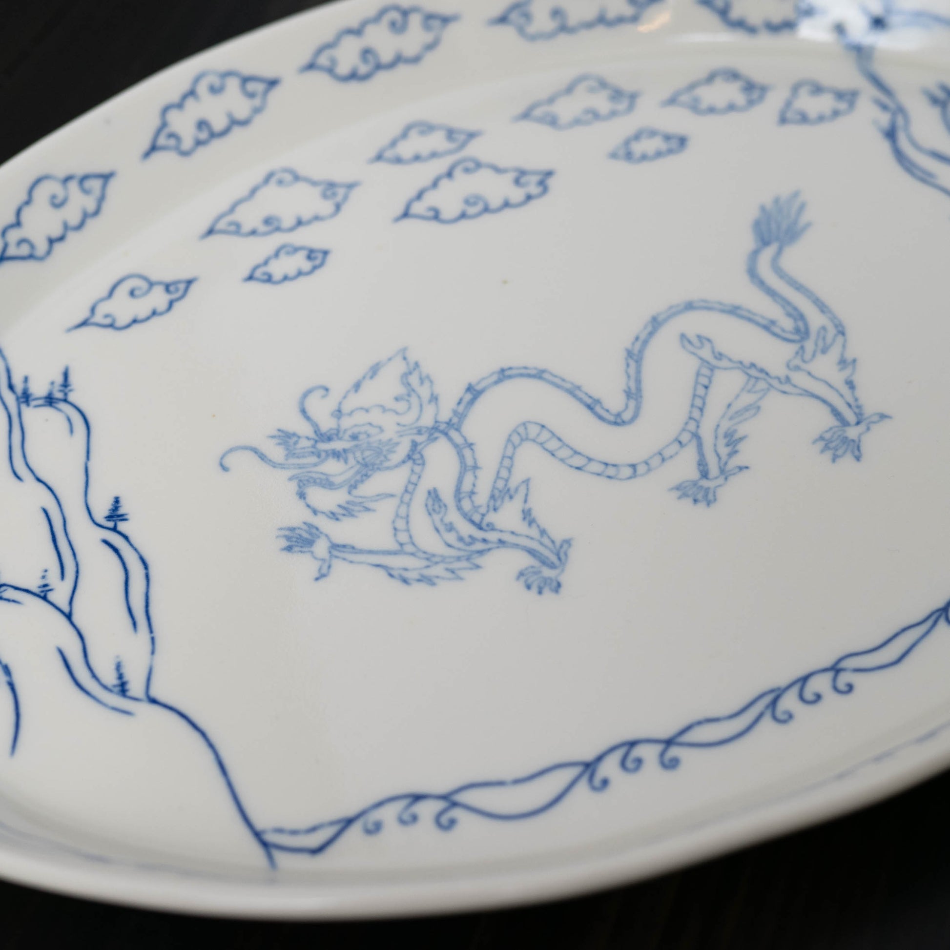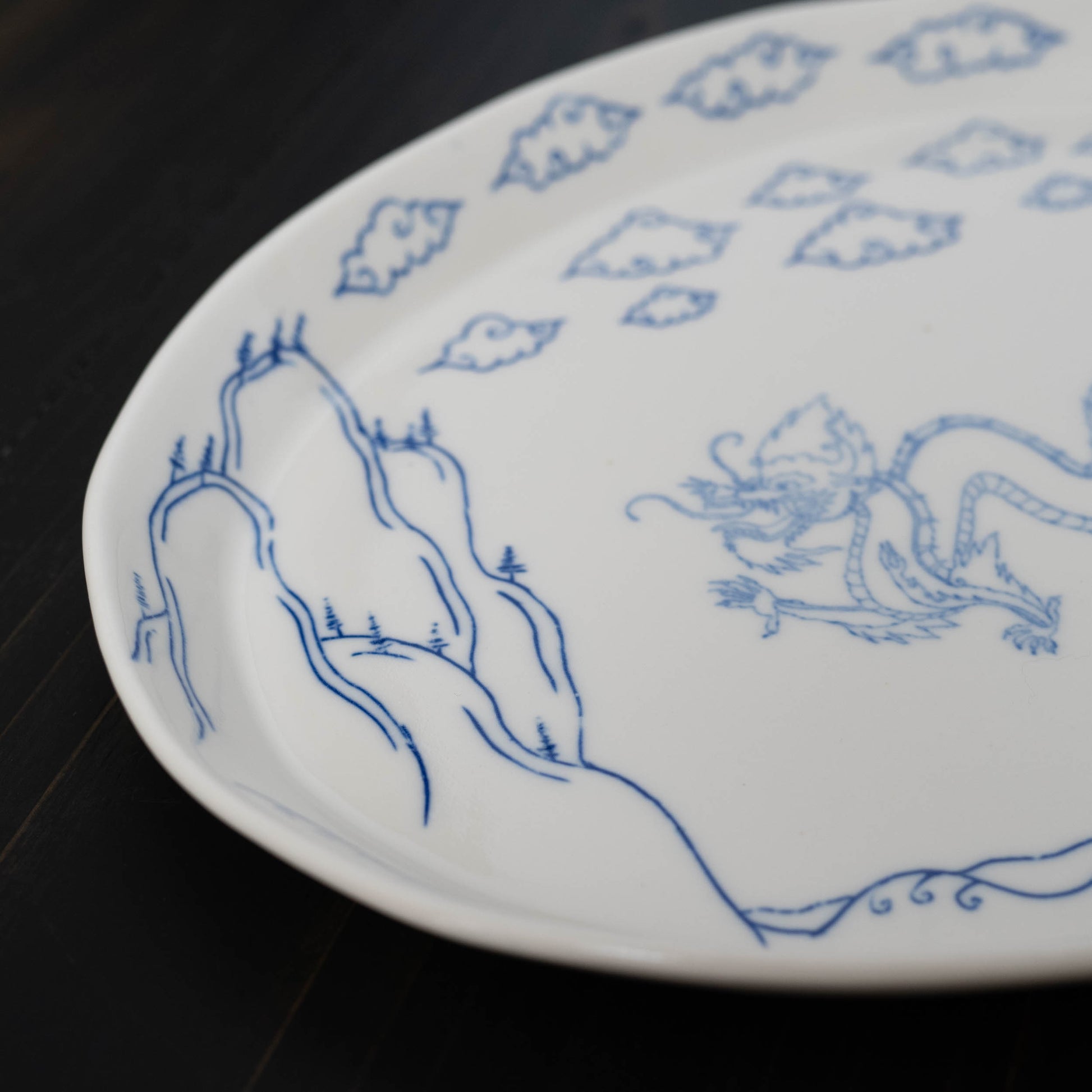 Large oval porcelain platter decorated with a dragon amidst could, mountains and waves. The mountains and waves are hand-carved into each plate using a modern mishima technique. The dragon is hand silk-screened and the whole platter dipped into a clear glaze. In the Qing Dynasty, a motif that included dragons, mountains, waves, and clouds married the heavens, earth, and sea to represent longevity and abundance.
