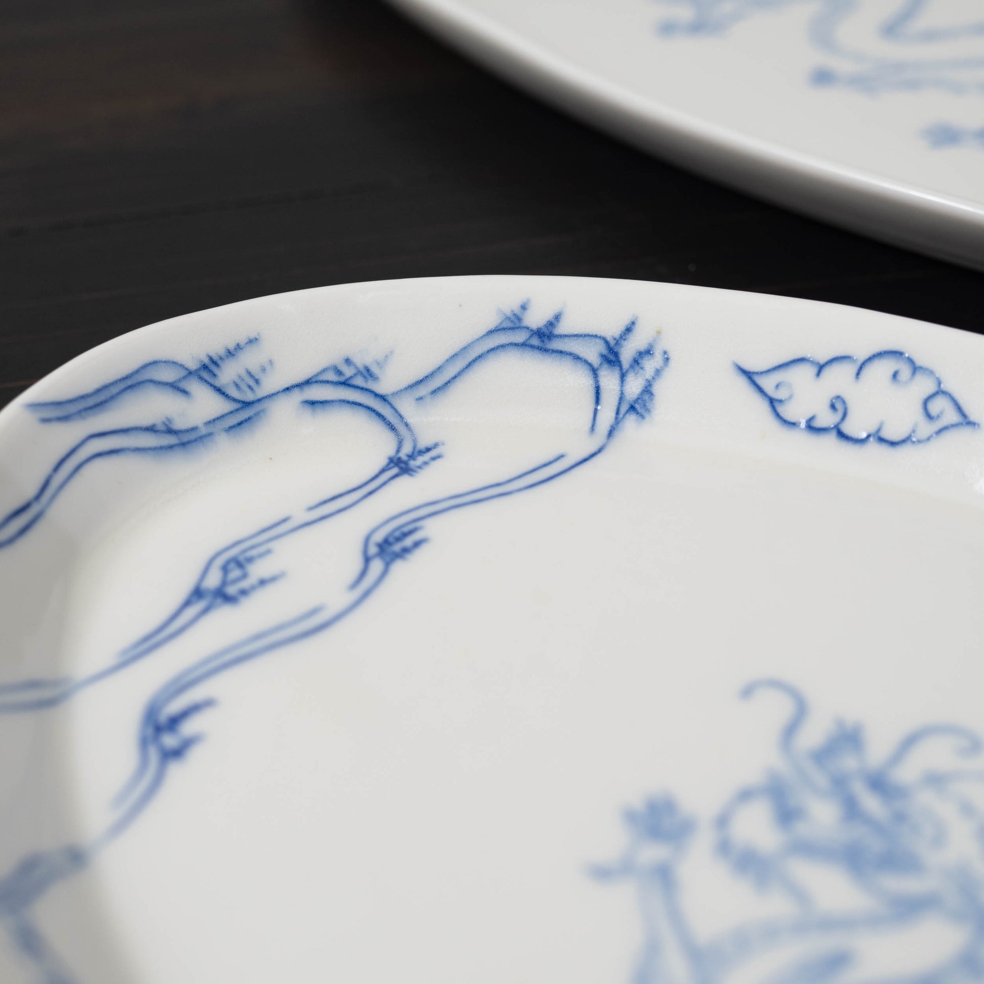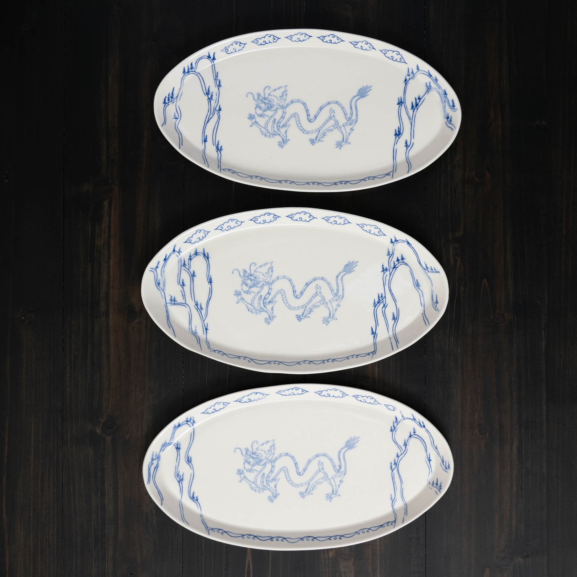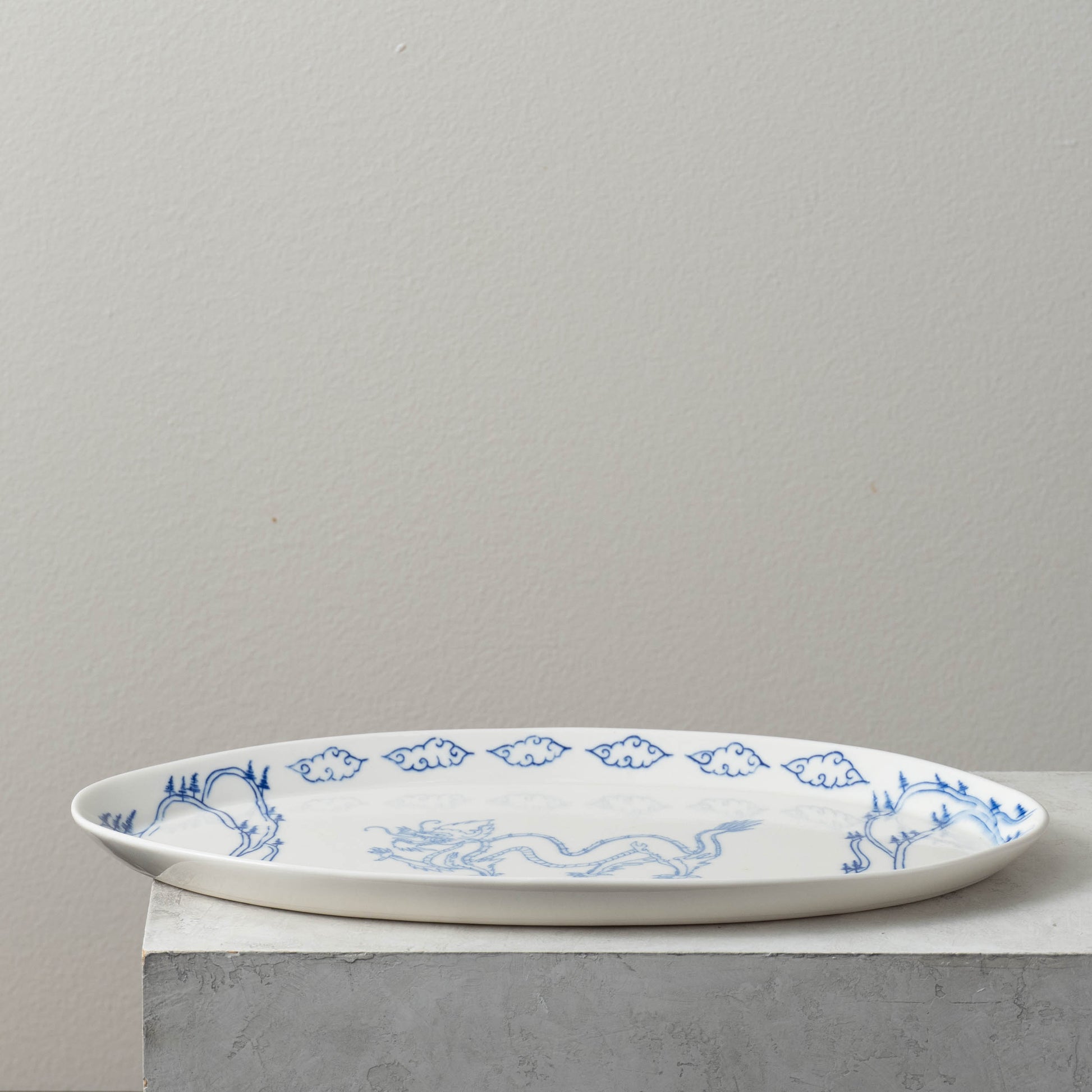 Narrow oval porcelain platter decorated with a dragon amidst could, mountains and waves. The mountains and waves are hand-carved into each plate using a modern mishima technique. The dragon is hand silk-screened and the whole platter dipped into a clear glaze. In the Qing Dynasty, a motif that included dragons, mountains, waves, and clouds married the heavens, earth, and sea to represent longevity and abundance.
