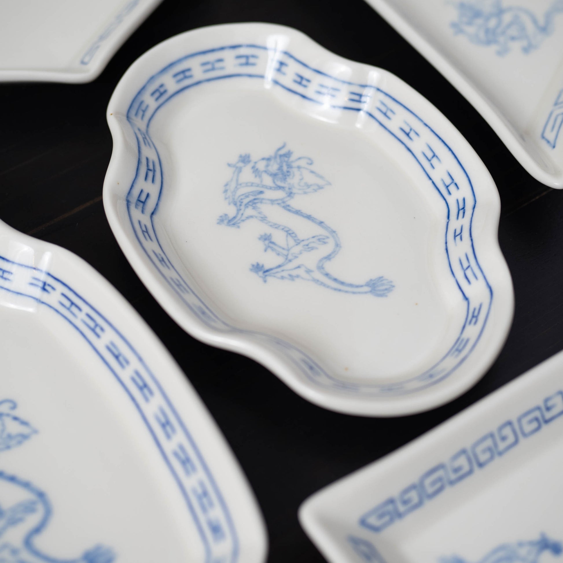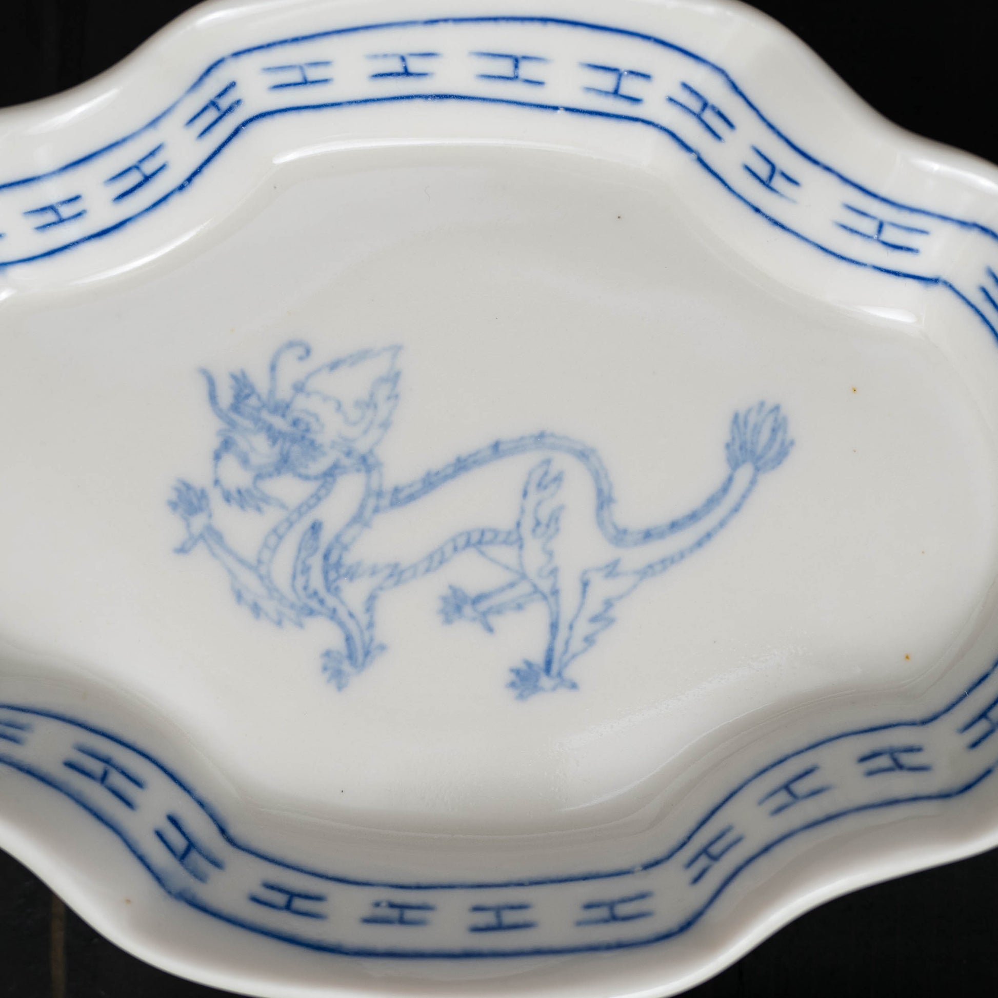 Beveled porcelain plaque dish decorated with a dragon surrounded by an inset I-Fret motif, representing infinite wealth. The dragon is hand silk-screened and dipped into a clear glaze. Discounted 15% due to a bad firing. Dragon is a little faded.
