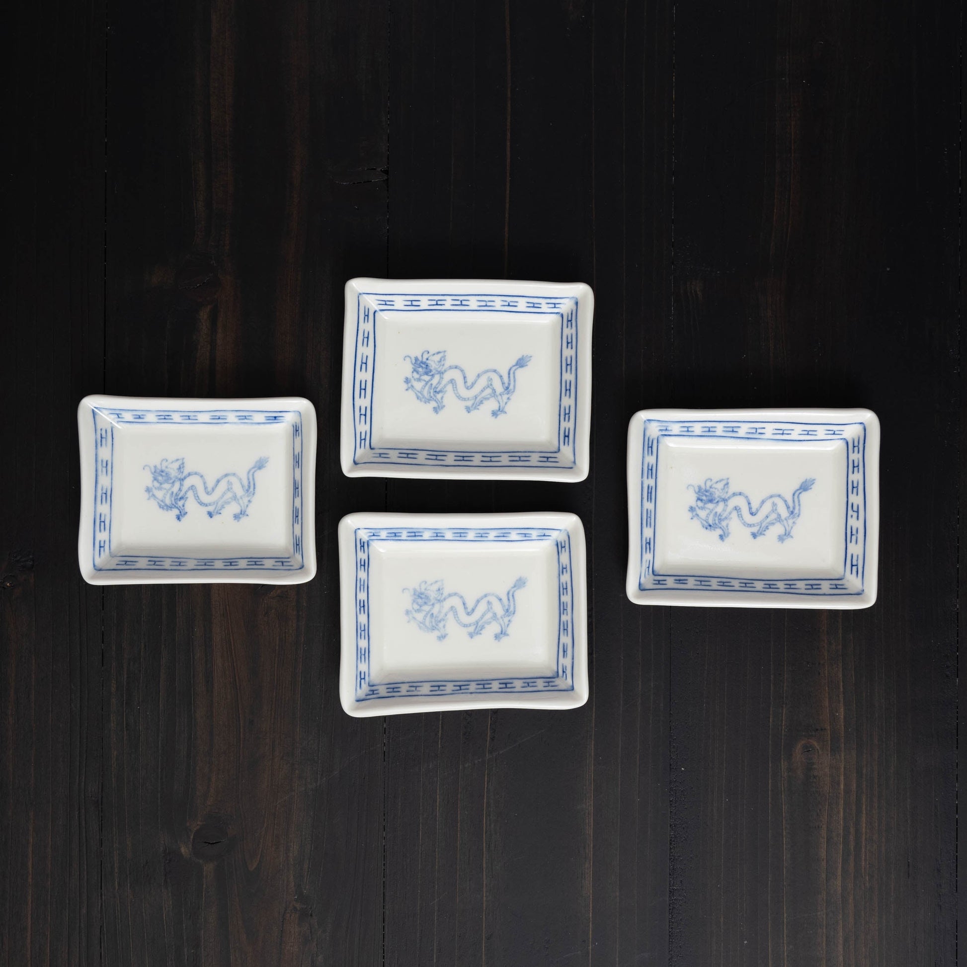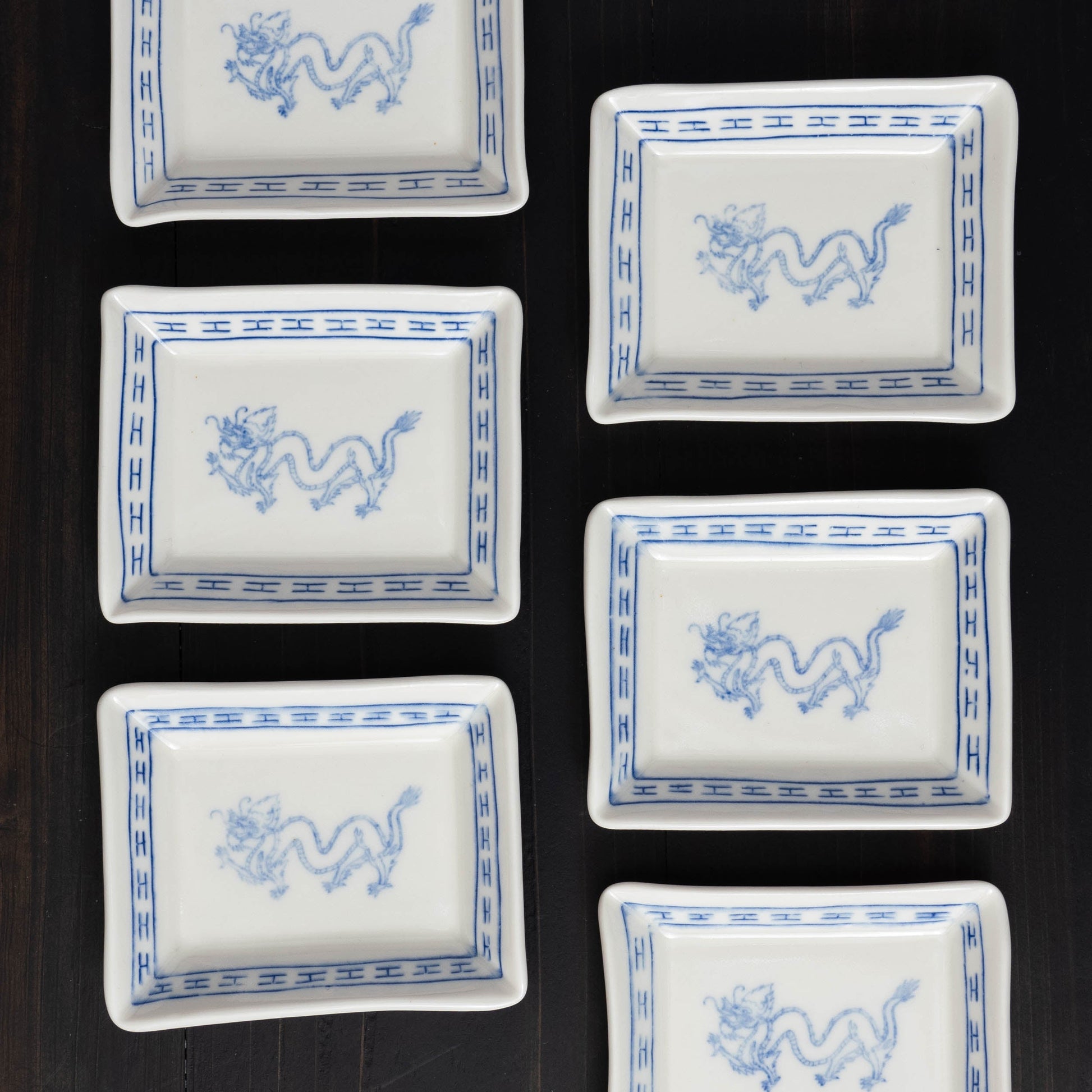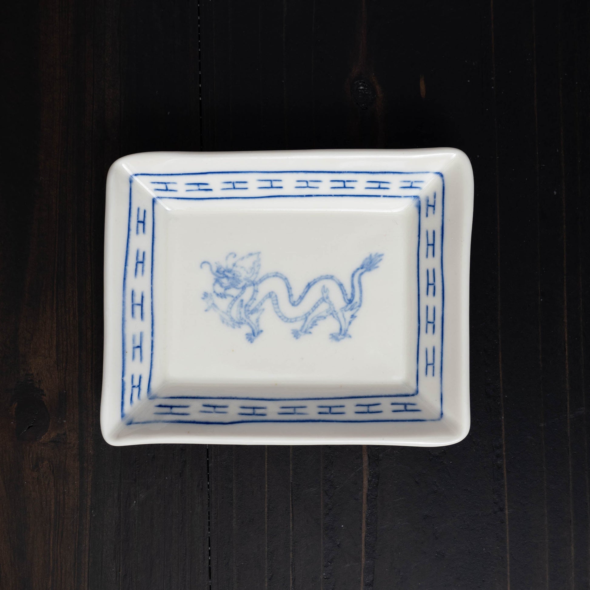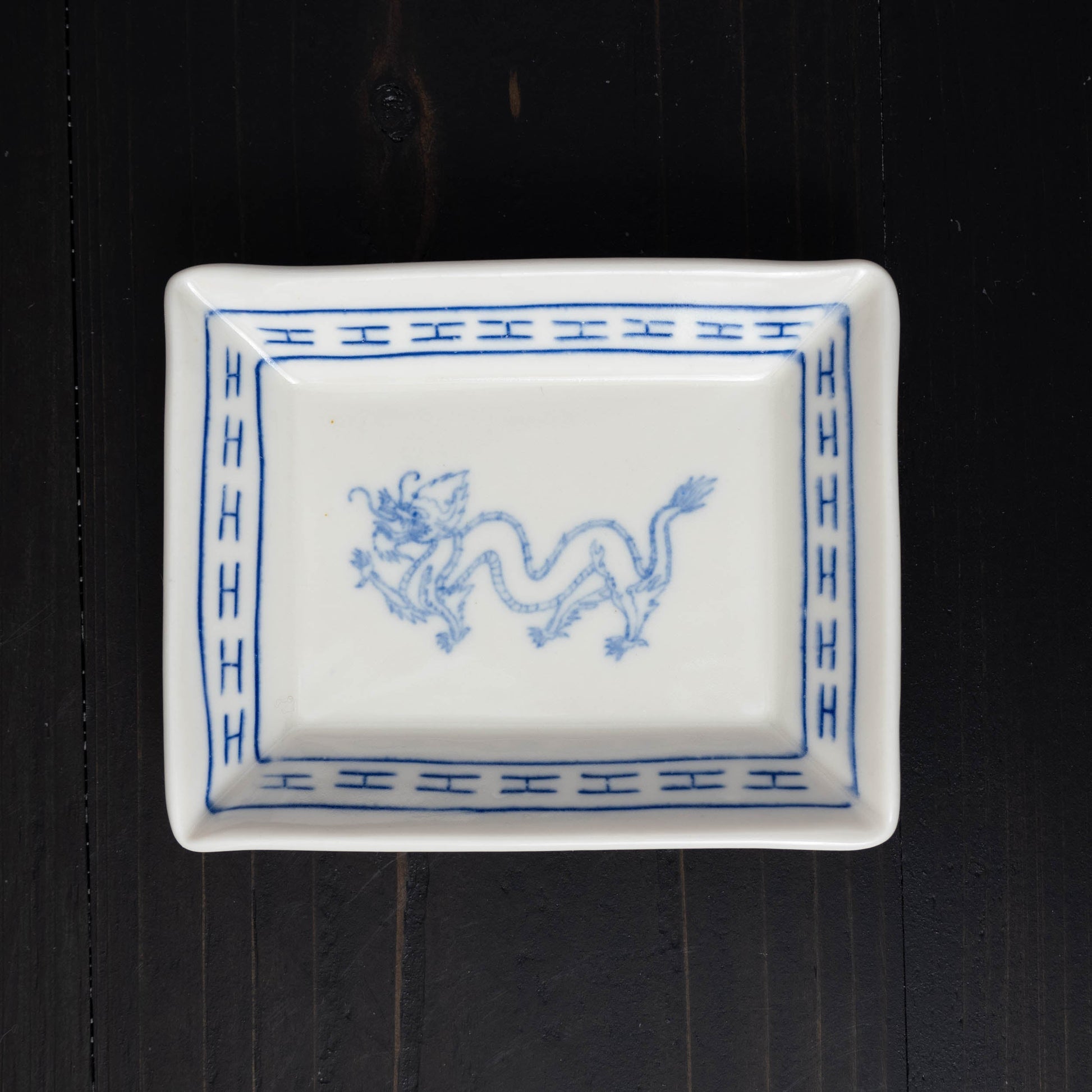 Small porcelain rectangle dish decorated with a dragon surrounded by an inset-I Fret motif, representing infinite wealth. The dragon is hand silk-screened and dipped into a clear glaze. Discounted 10% due to a bad firing. Dragons are a little faded.