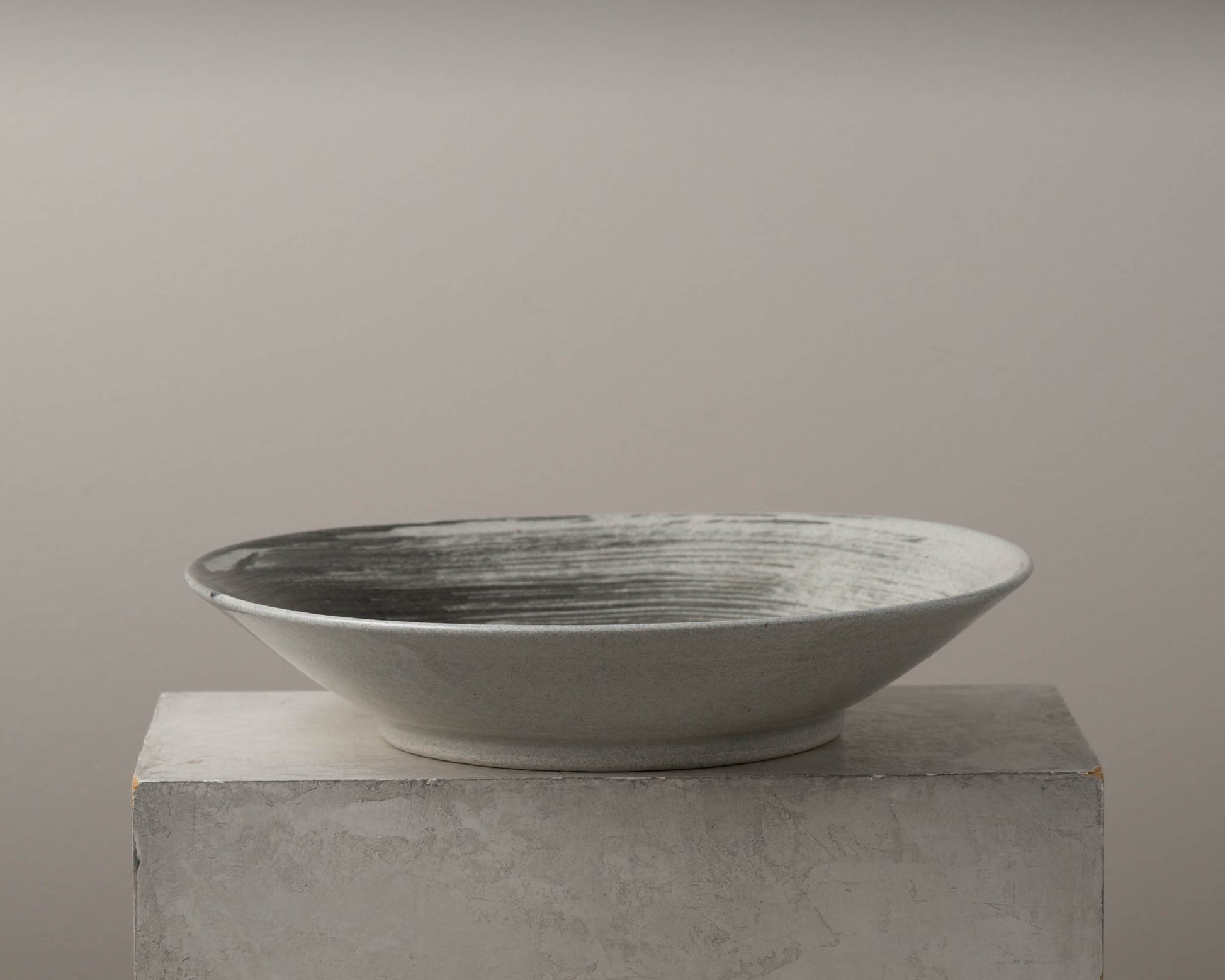 Wheel thrown granite stoneware serving dish decorated with a big, bold brushstroke. In one confident movement, a black brushstroke is hand-painted onto the surface using a Japanese sheep hair brush. I love decorating ceramics with brushstrokes because I can make ephemeral moments last forever.