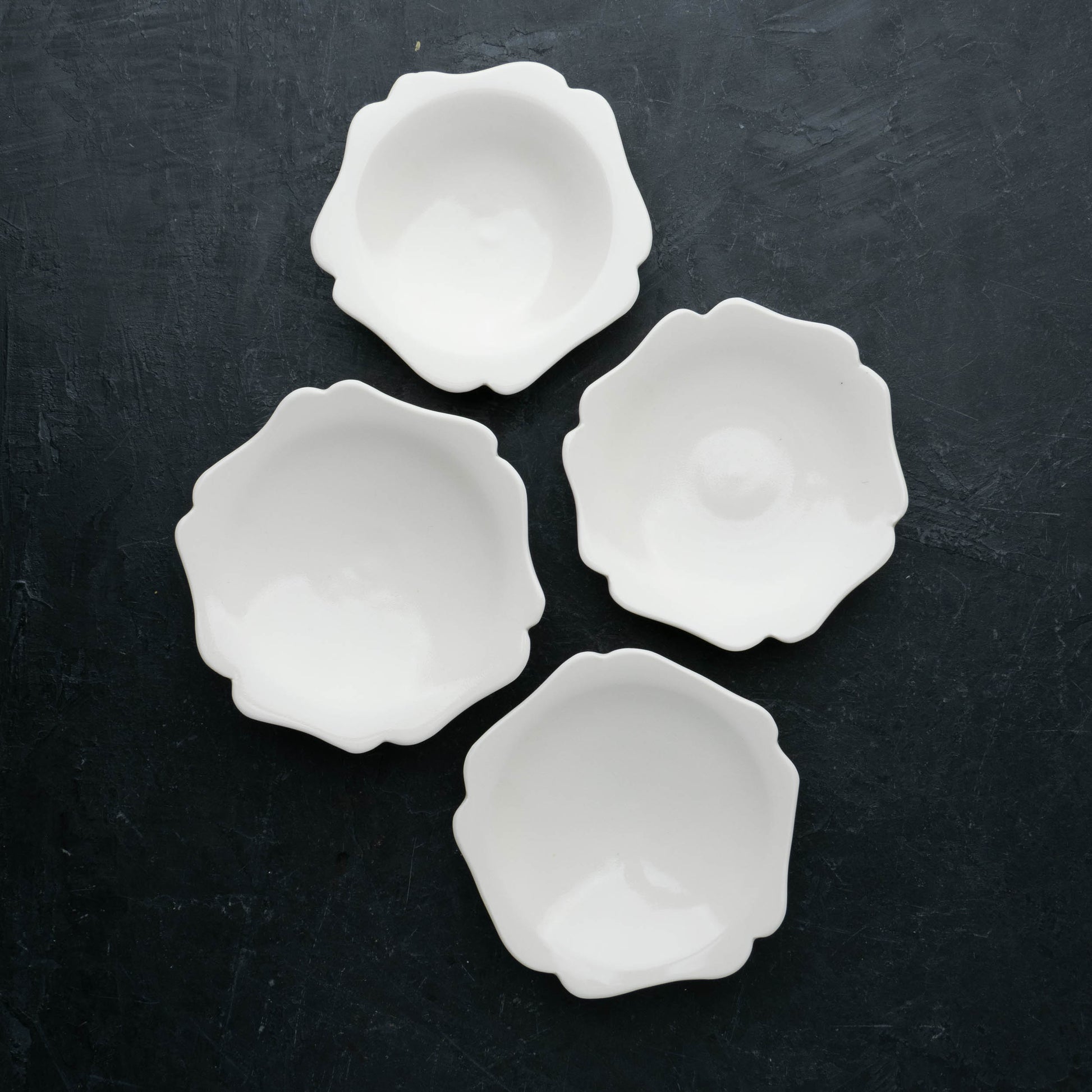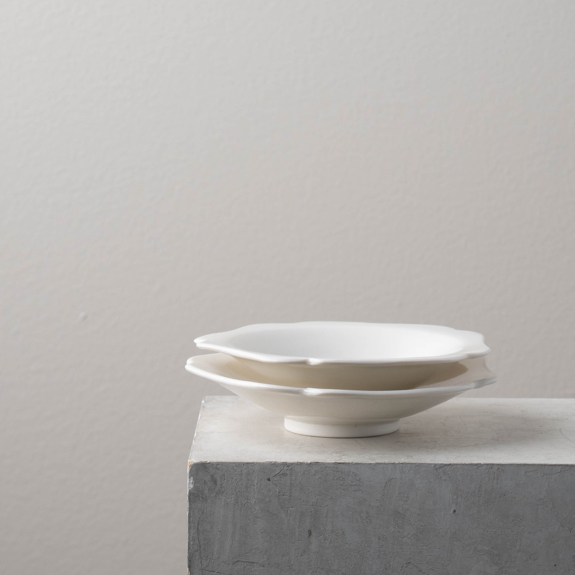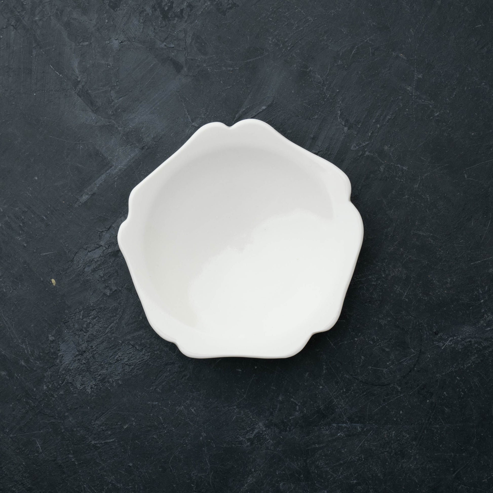 Wheel thrown porcelain dish finished with a hand-cut foliate rim. Made for a wagashi-tea pairing event for Sugoi Sweets. There are five-sided dishes and six-sided dishes available.