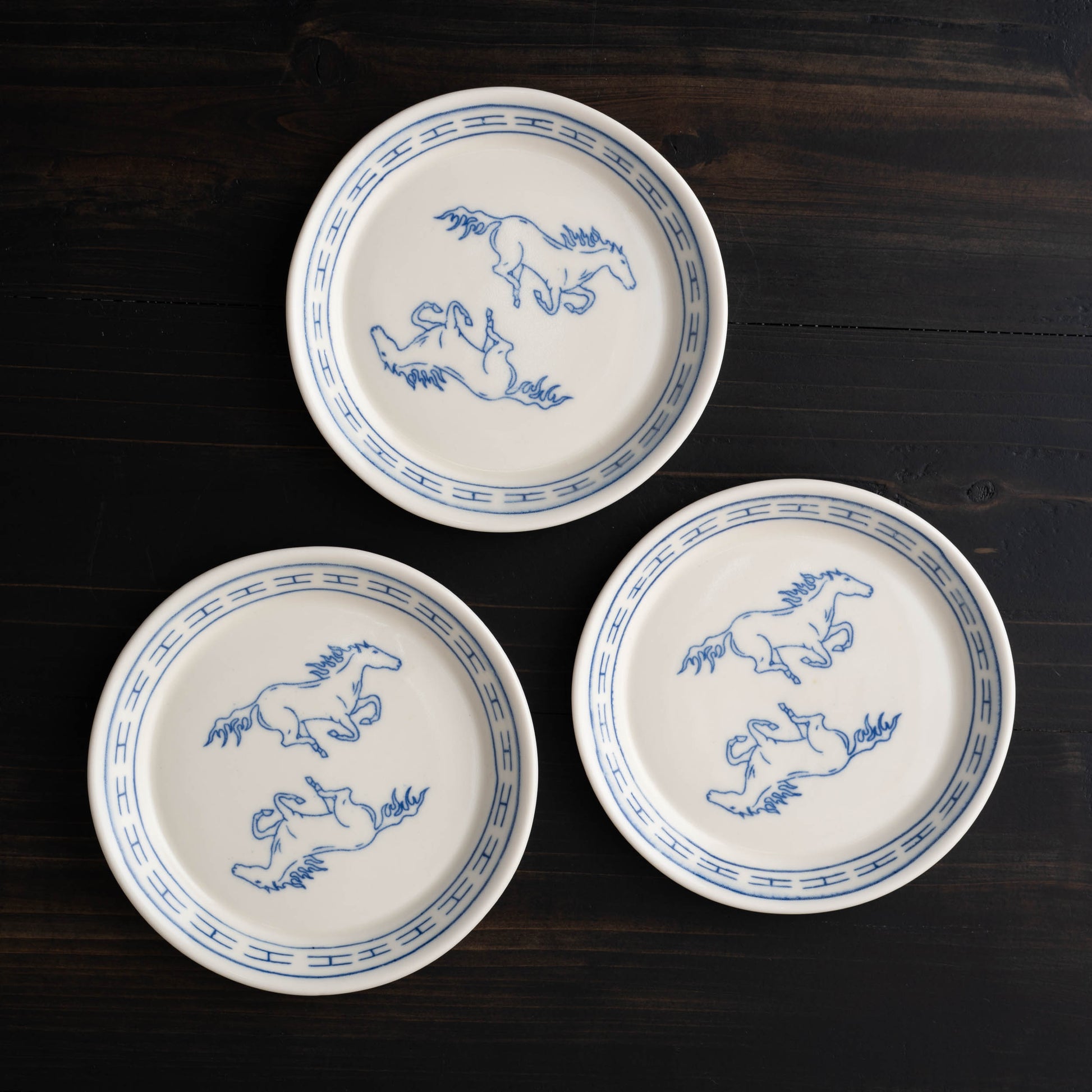 Small porcelain slab-built round dish. The hand silk-screened horses are galloping into a brighter future, manes and tails ablaze with line work that echoes traditional Asian motifs. Surrounded by a hand-etched inset-I motif representing infinite wealth.