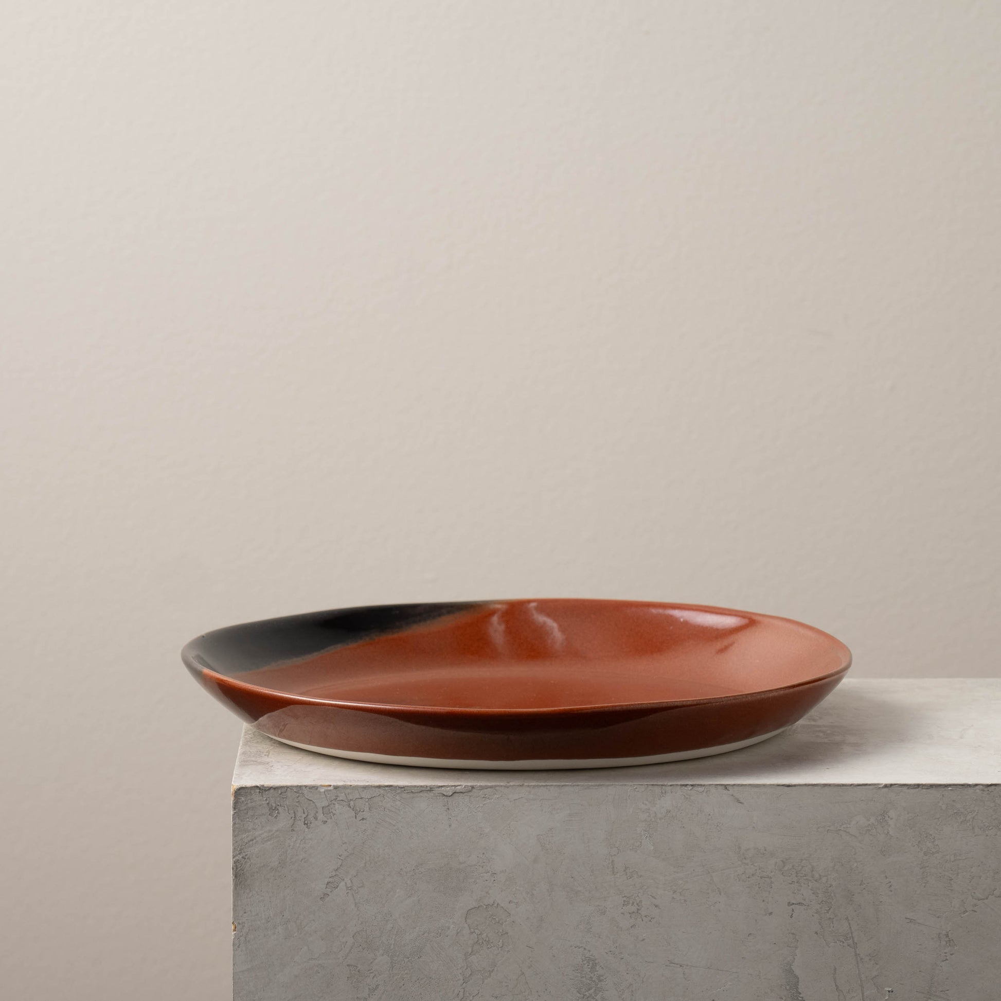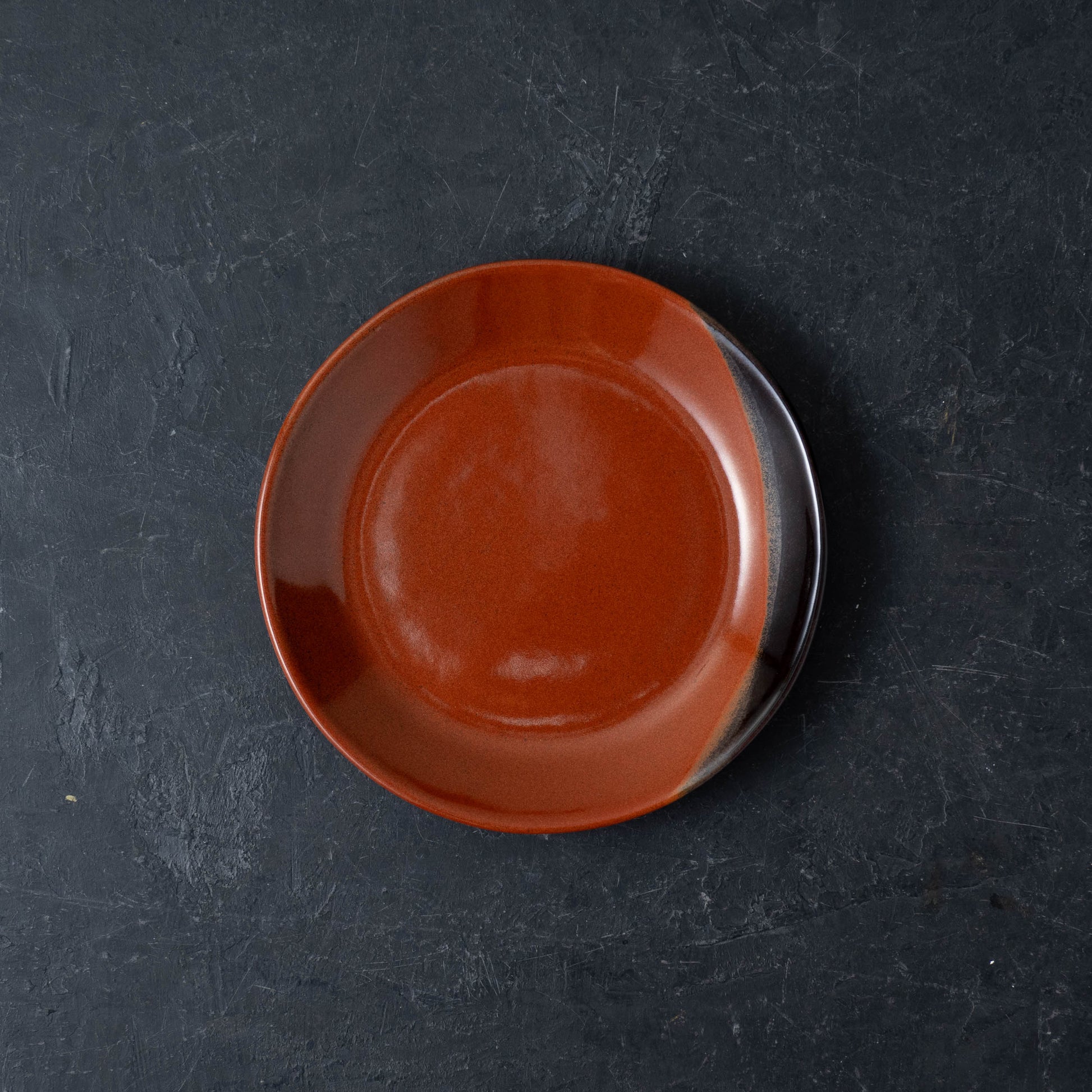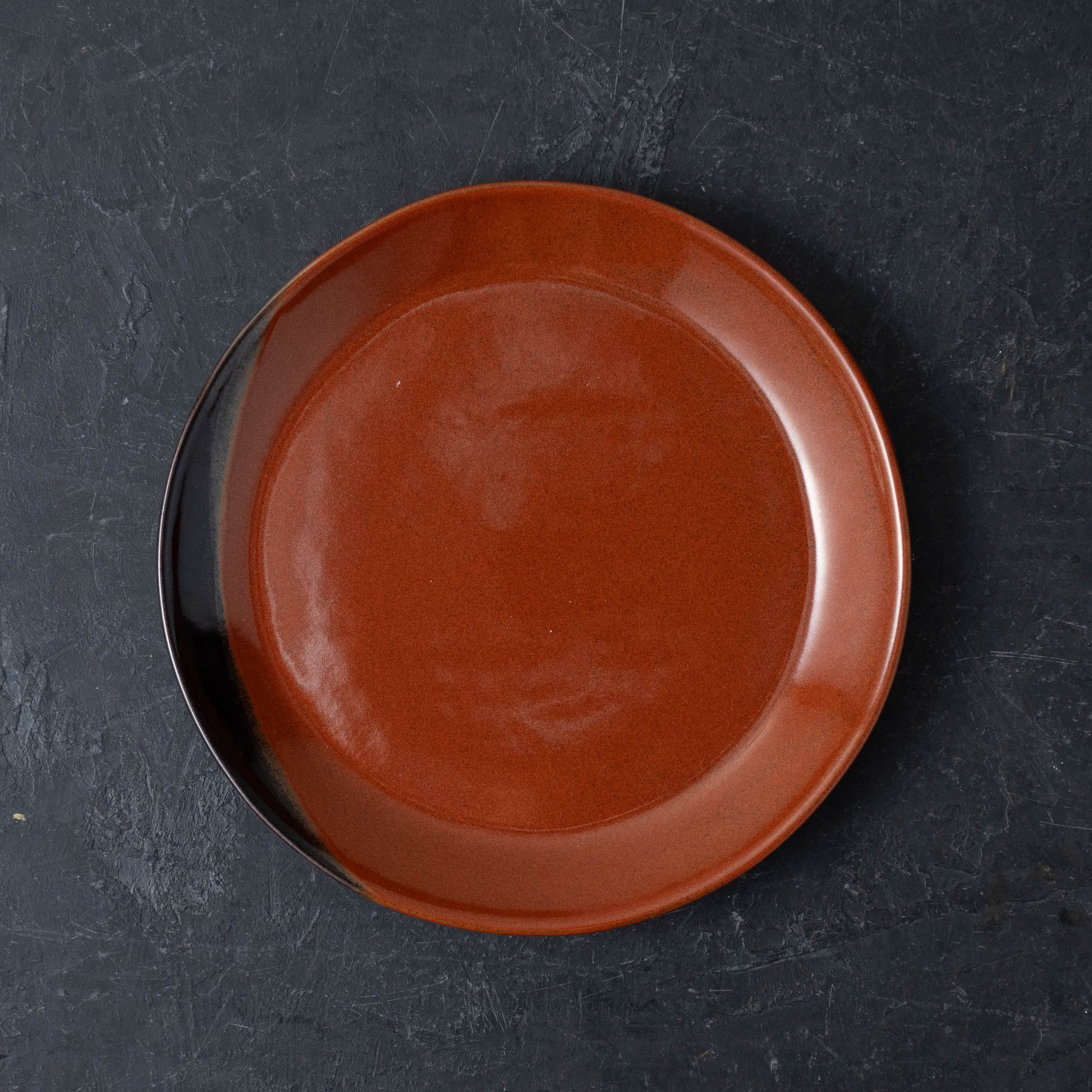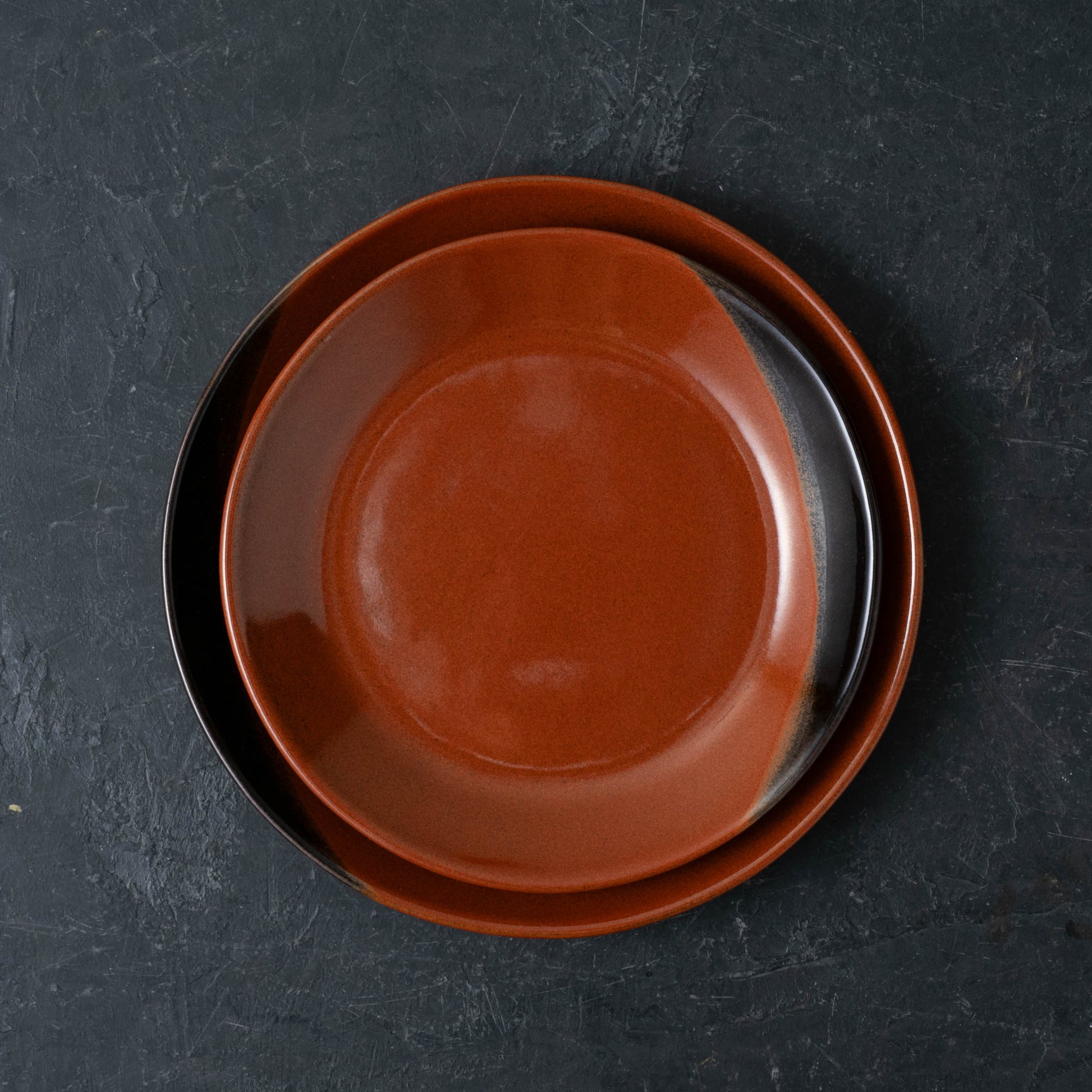 Slab-draped porcelain coupe style plates with a tenmoku accent on an iron red finish. Porcelain is elastic and we love how it almost has a mind of its own. We created this line to celebrate the wabi sabi nature of porcelain while bringing an easy elegance to your home. This color combination reminds me of traditional Japanese lacquerware.
