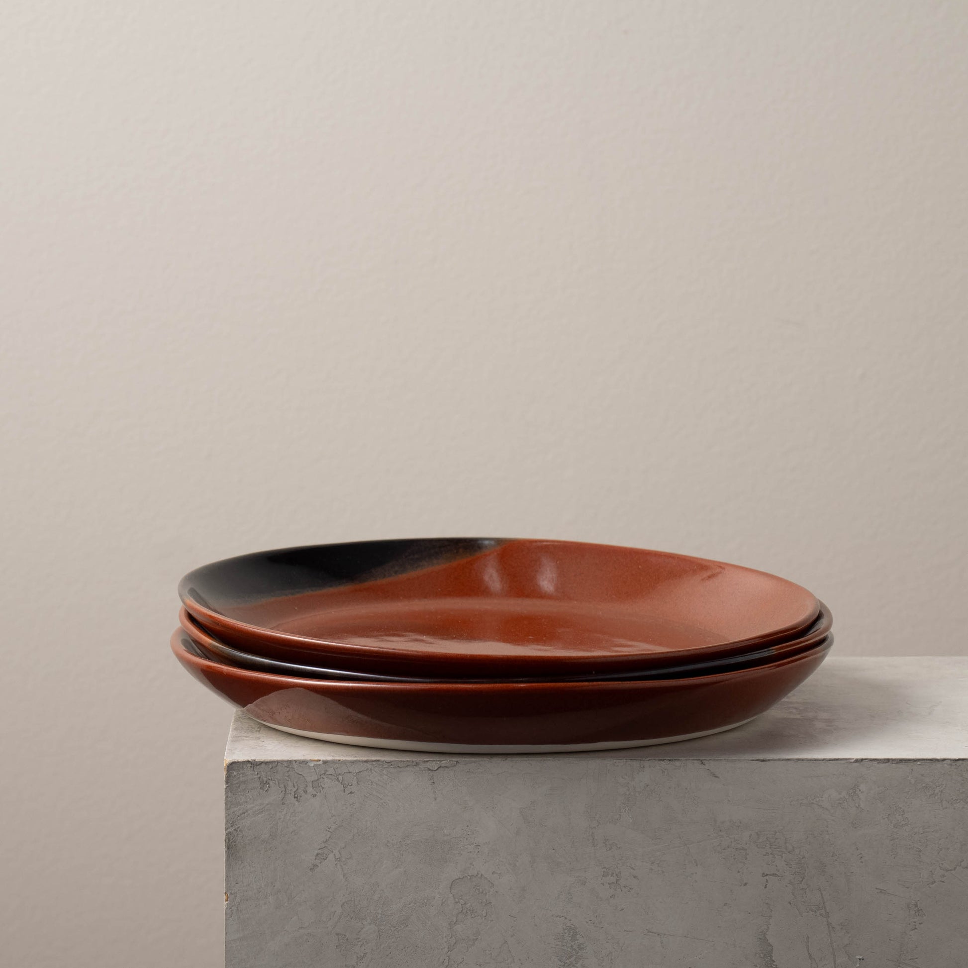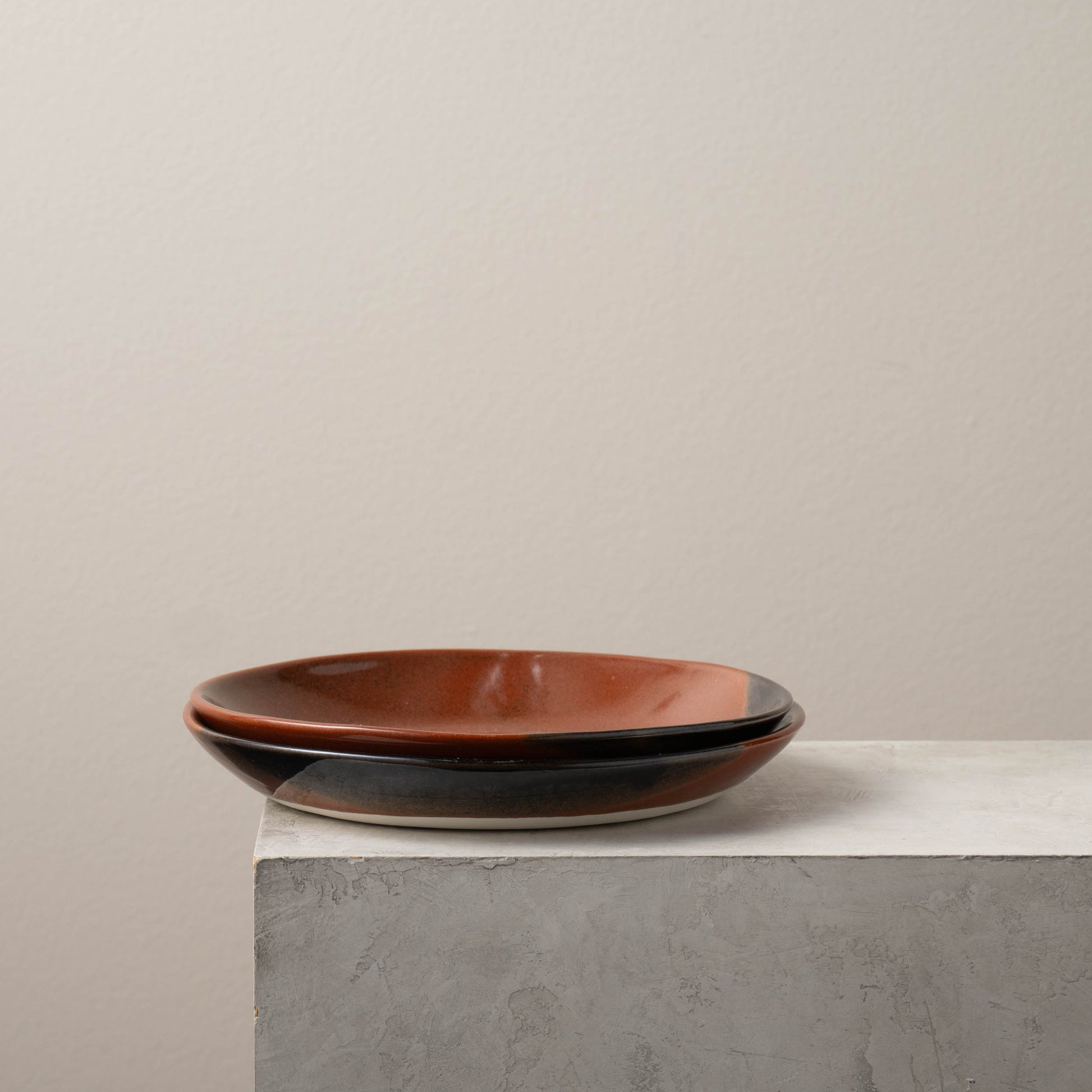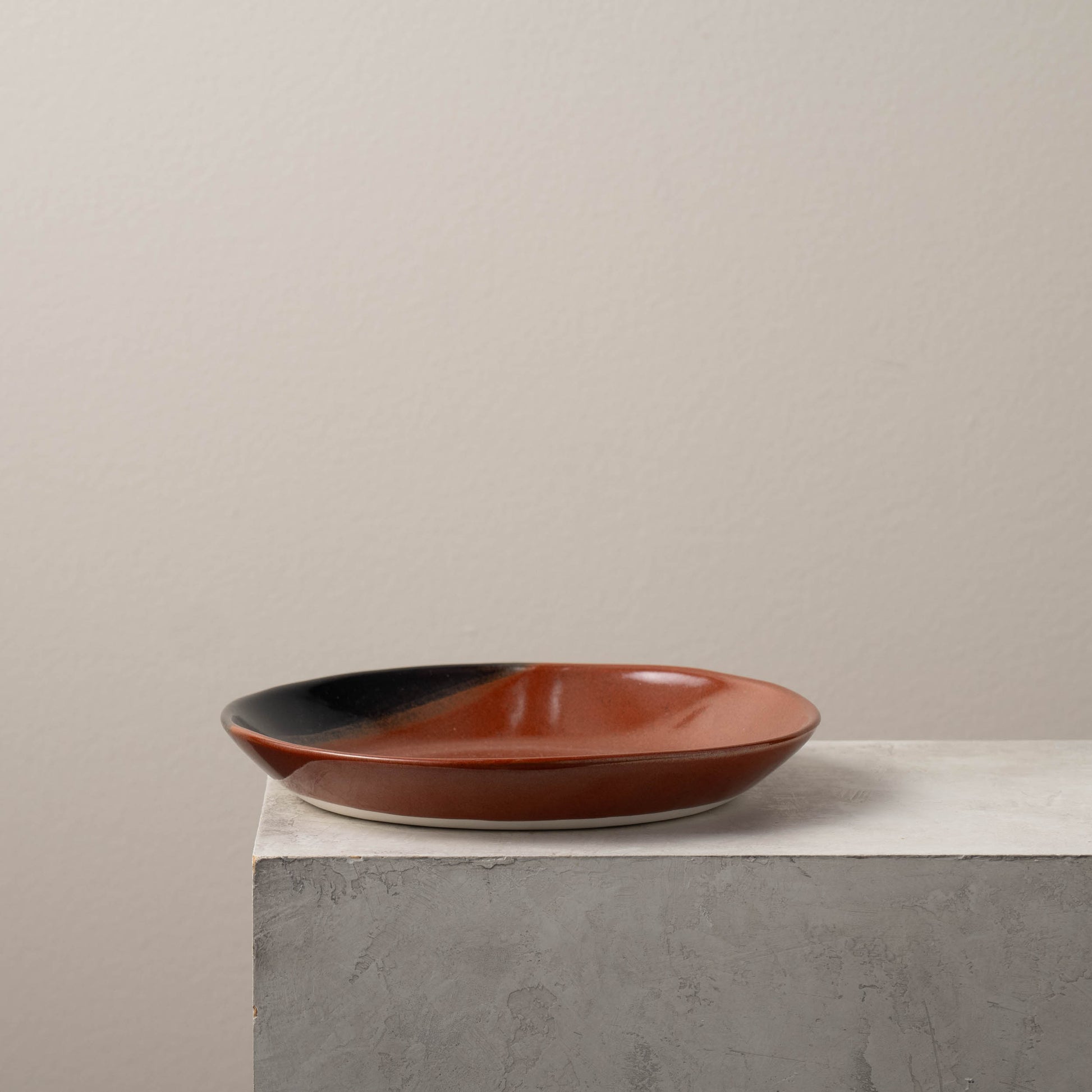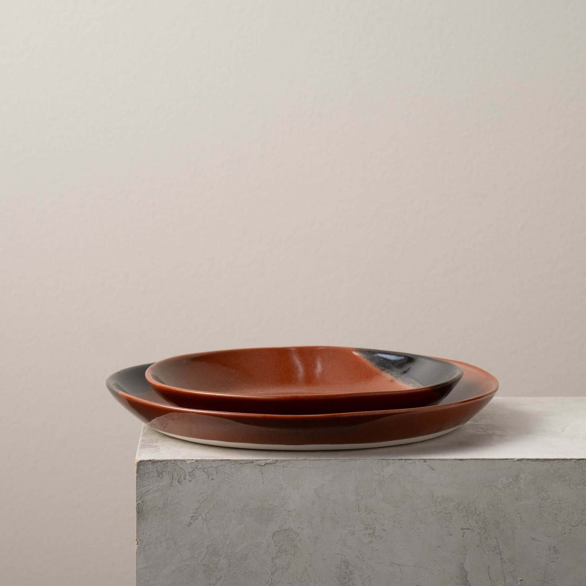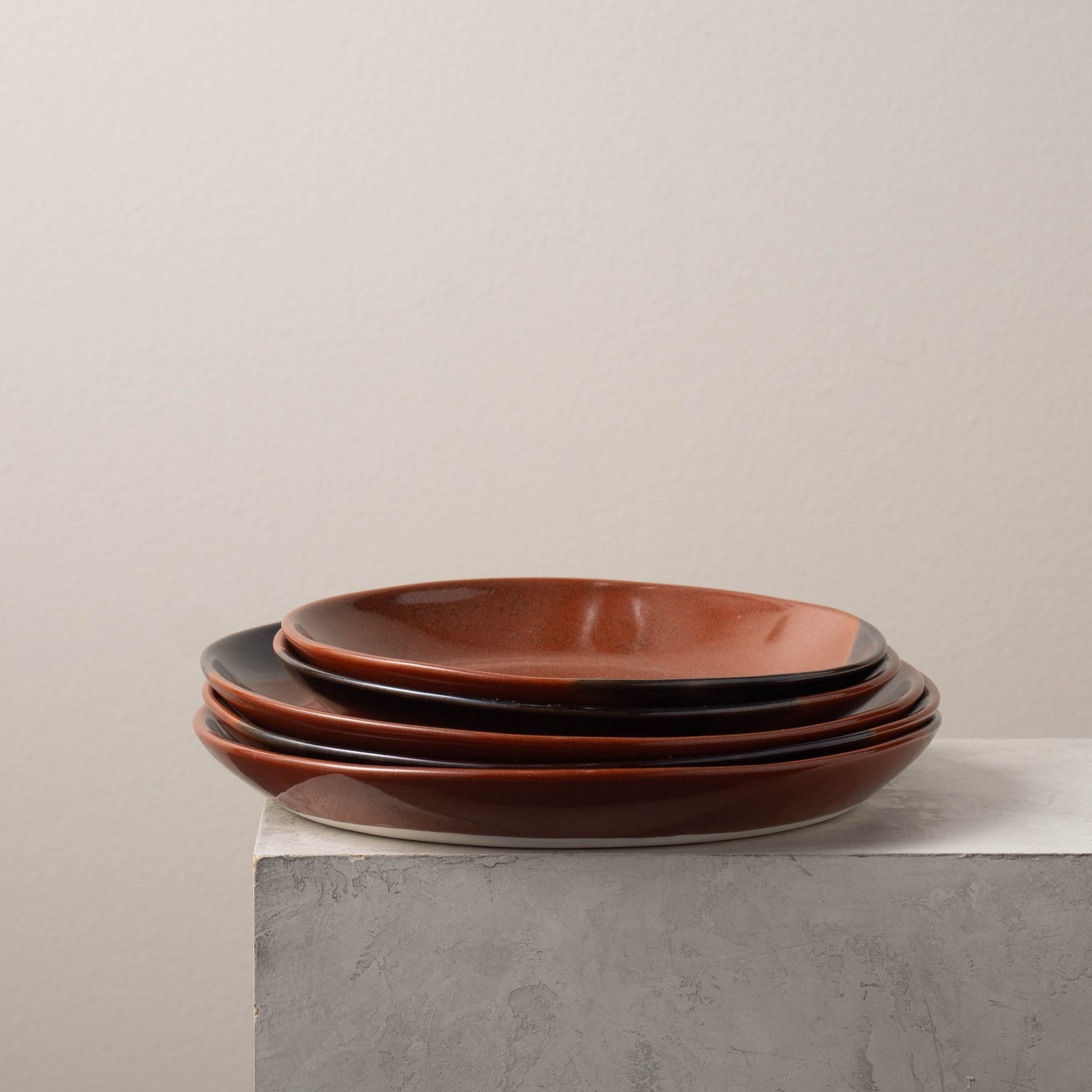 Slab-draped porcelain coupe style plates with a tenmoku accent on an iron red finish. Porcelain is elastic and we love how it almost has a mind of its own. We created this line to celebrate the wabi sabi nature of porcelain while bringing an easy elegance to your home. This color combination reminds me of traditional Japanese lacquerware.