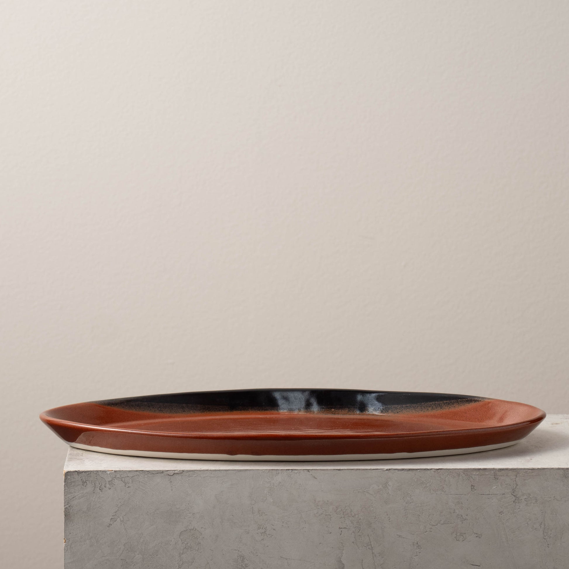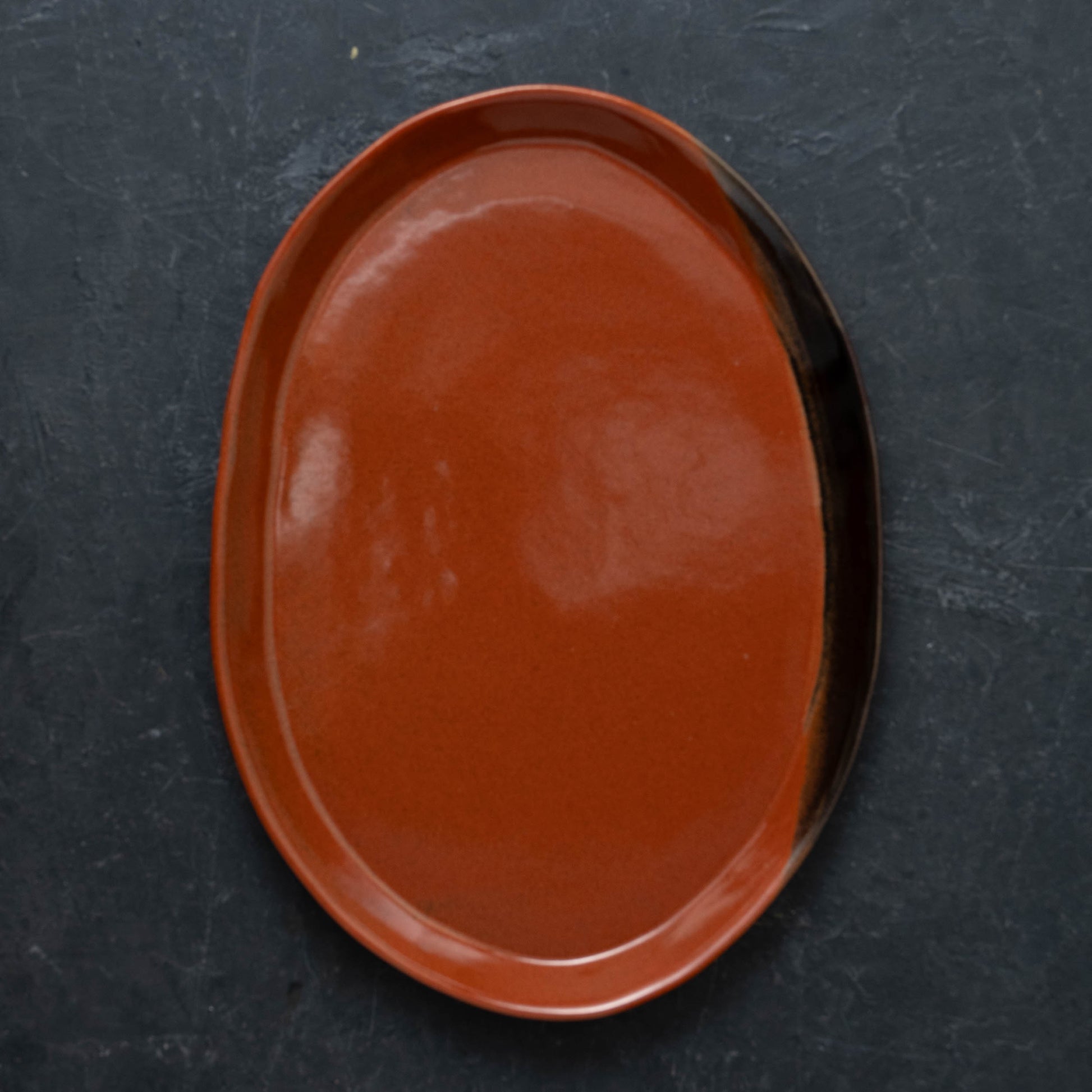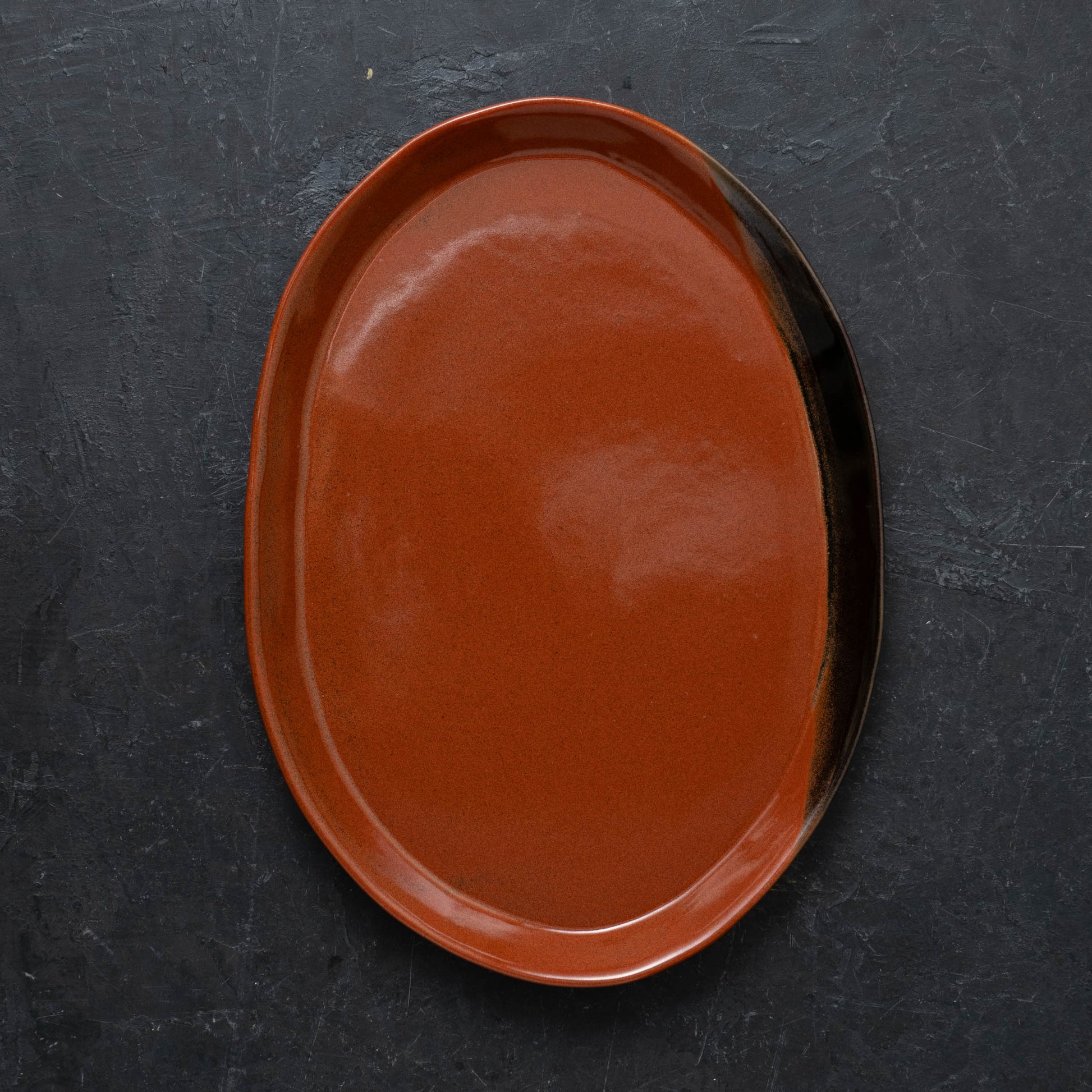 Slump molded porcelain oval platter with a tenmoku accent on an iron red finish. Porcelain is elastic and we love how it almost has a mind of its own. We created this line to celebrate the wabi sabi nature of porcelain while bringing an easy elegance to your home.