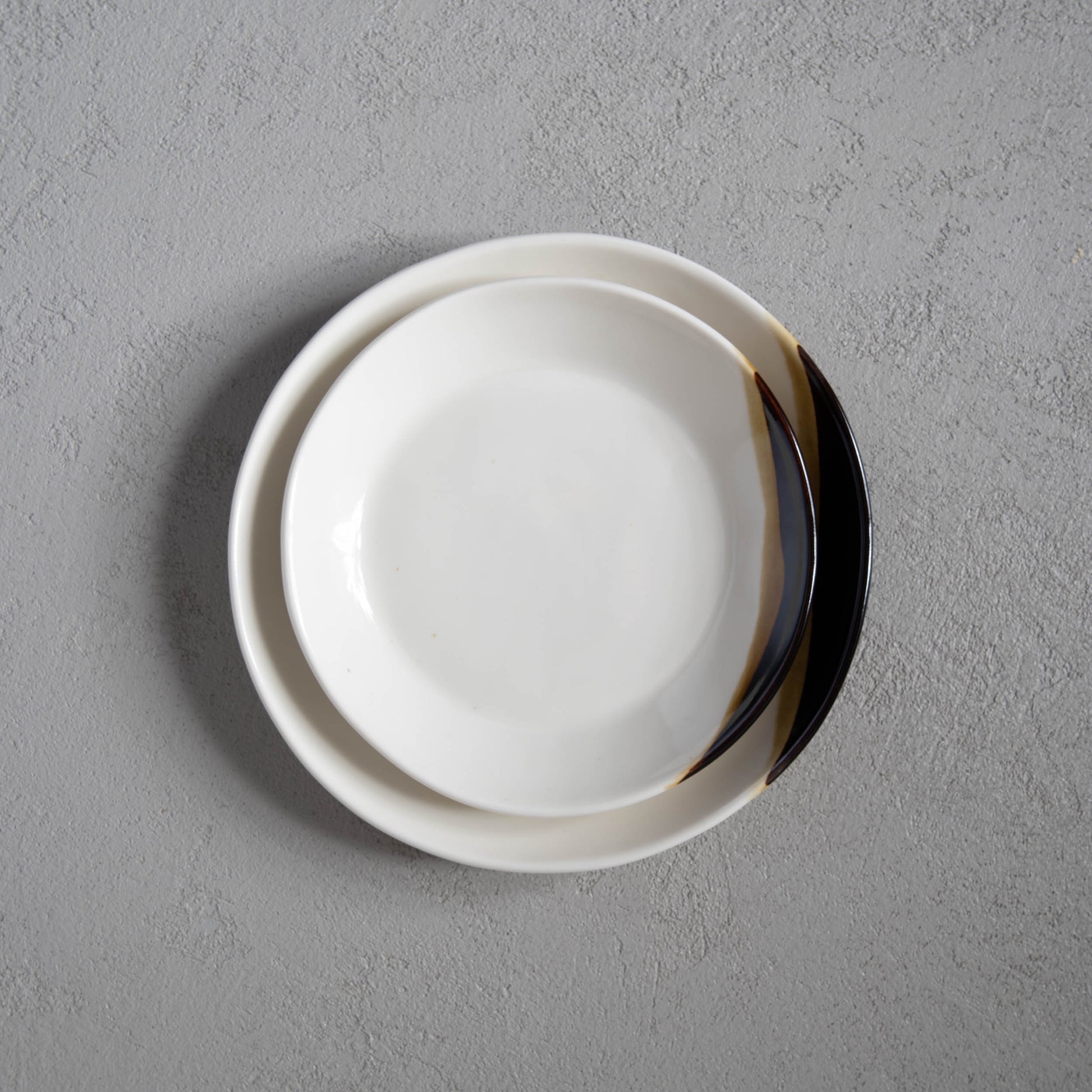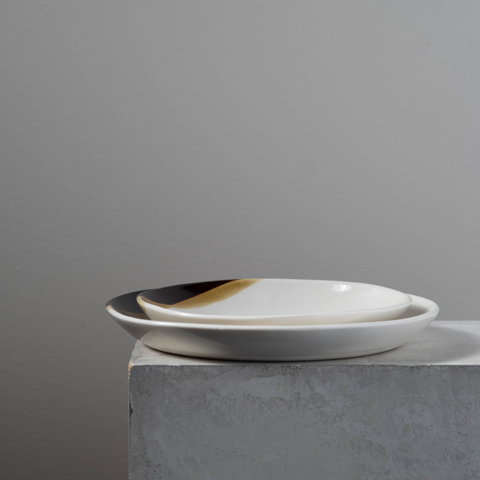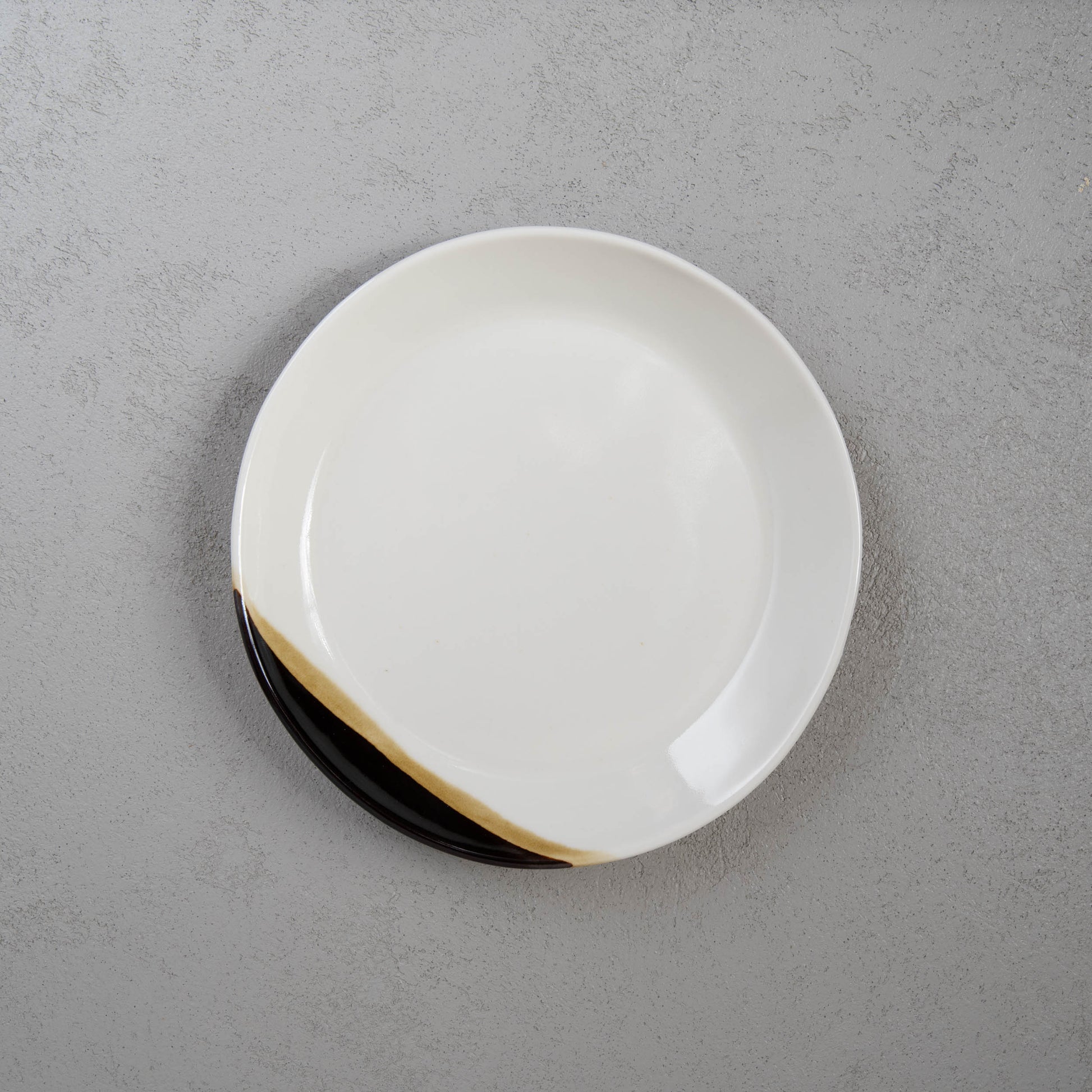 Slab-draped porcelain coupe style plates with a tenmoku accent on a white finish. We love this colorway because it fits seamlessly into the Mid-Century Modern home--a midwest classic. Whether you have amber or etched glass, Lane or McCobb, this set will have you covered.