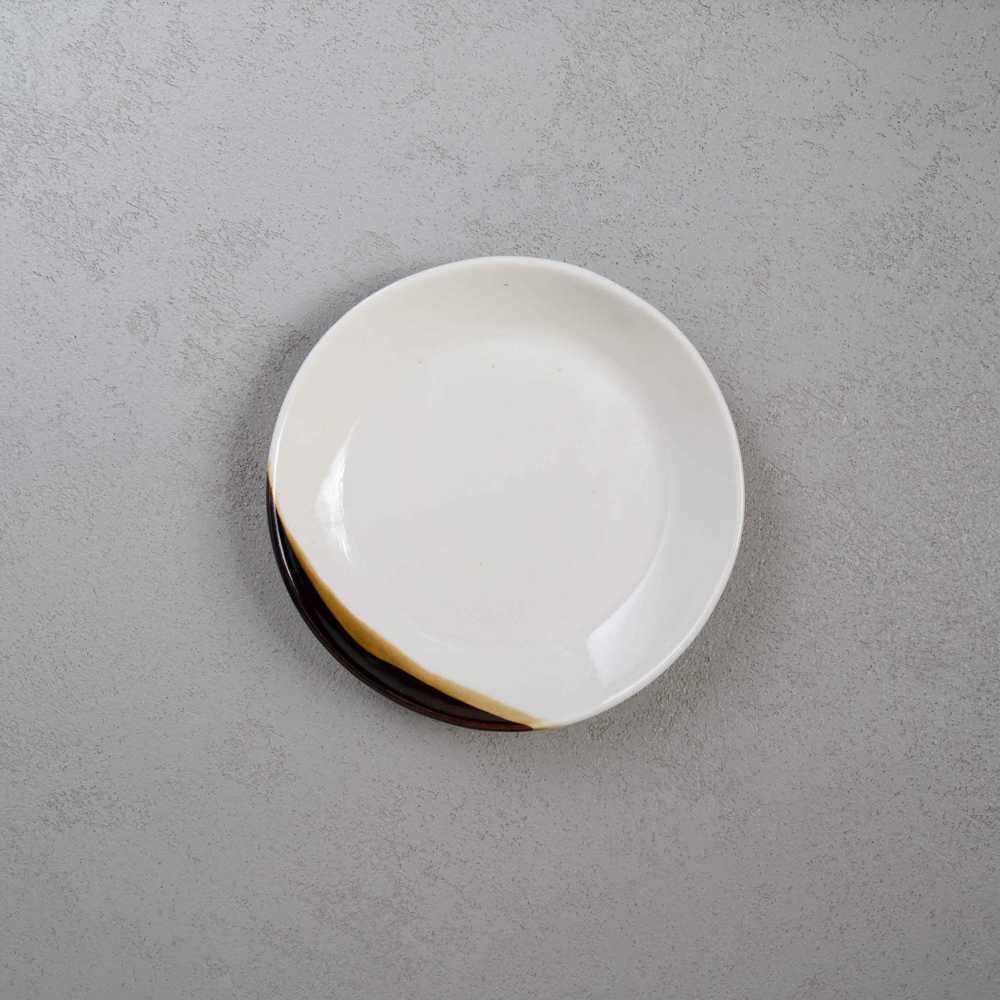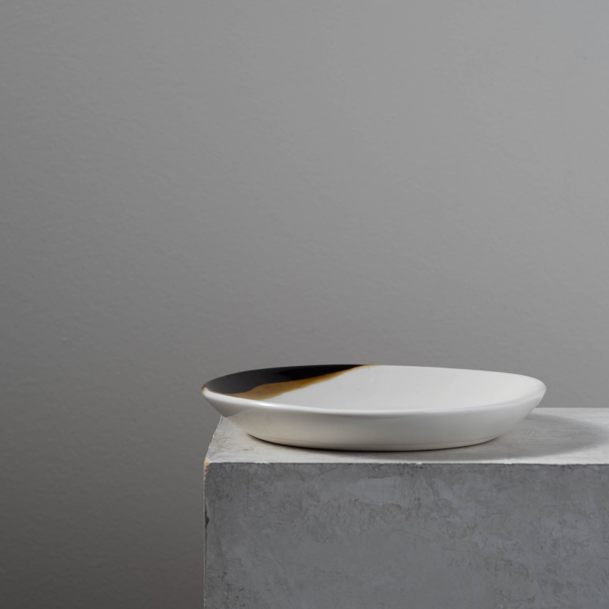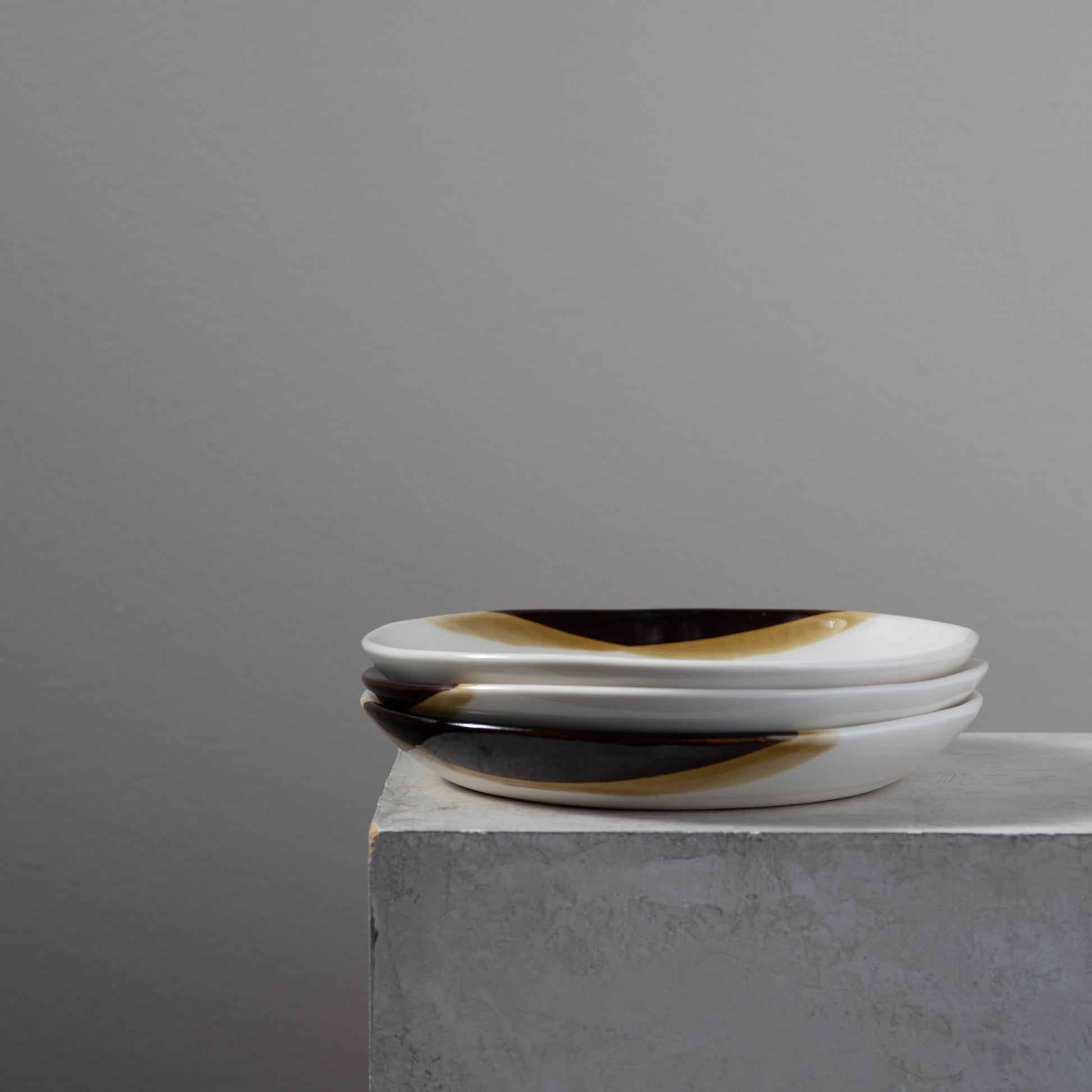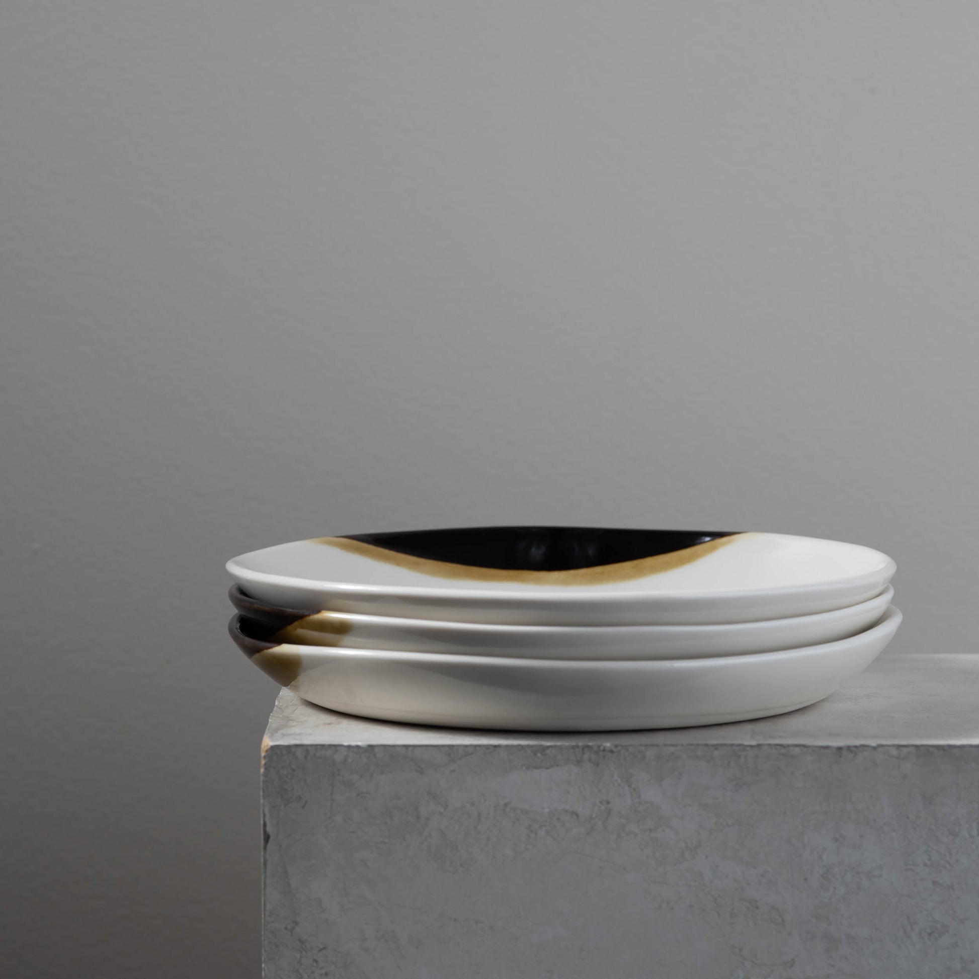 Slab-draped porcelain coupe style plates with a tenmoku accent on a white finish. We love this colorway because it fits seamlessly into the Mid-Century Modern home--a midwest classic. Whether you have amber or etched glass, Lane or McCobb, this set will have you covered.