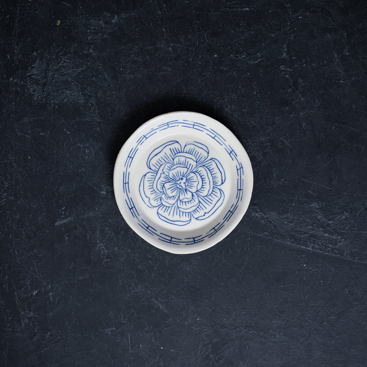 A small round dish with a peony in full bloom surrounded by an I-Fret motif.