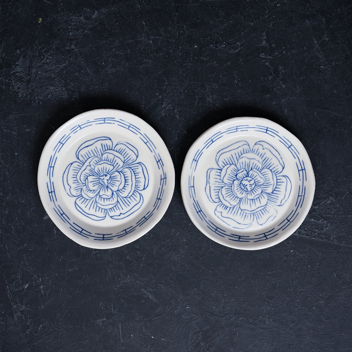 Each piece is decorated using the mishima technique. Every design is etched completely by hand and filled in with pigmented clay and the excess is wiped away.