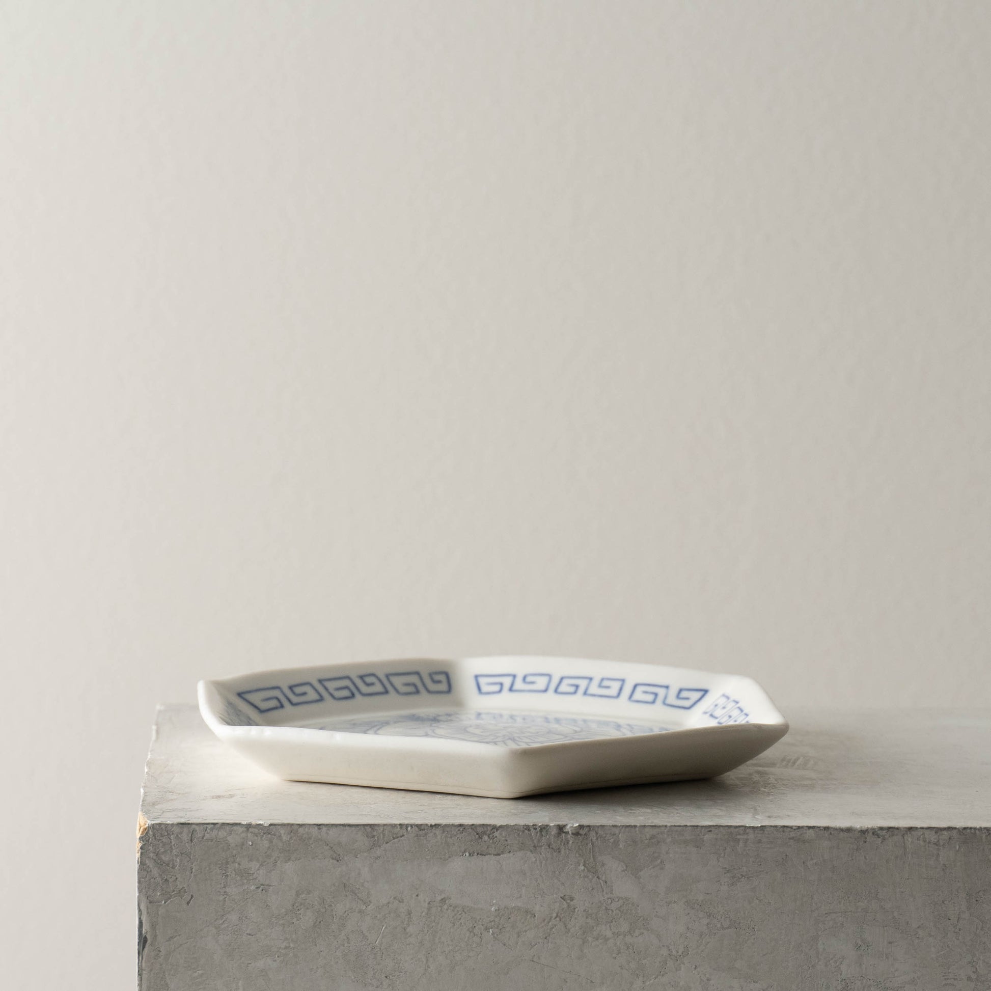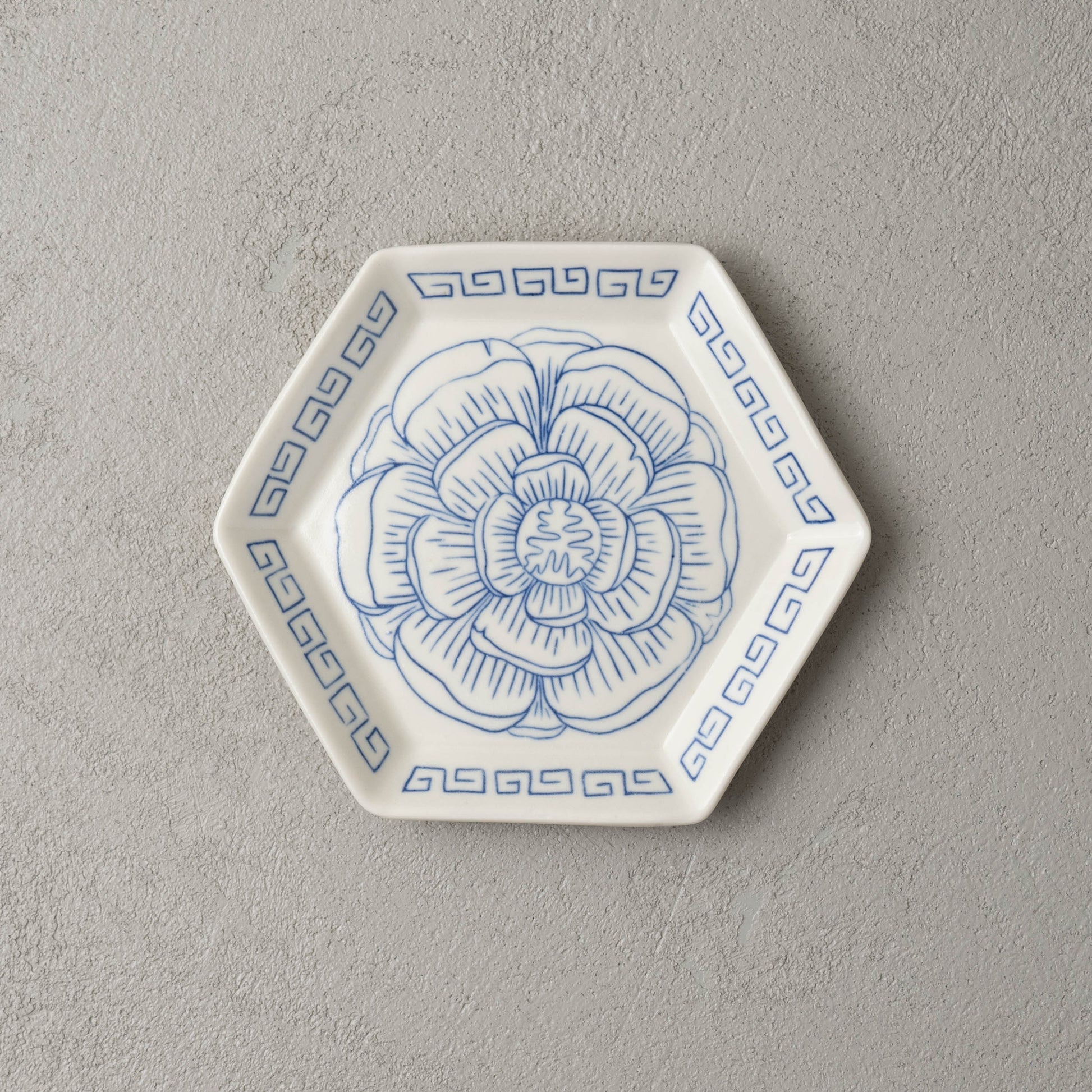 Six-sided porcelain catchall hand-etched with a peony bloom using the mishima technique. The border is decorated with an s-fret, representing infinite wealth.