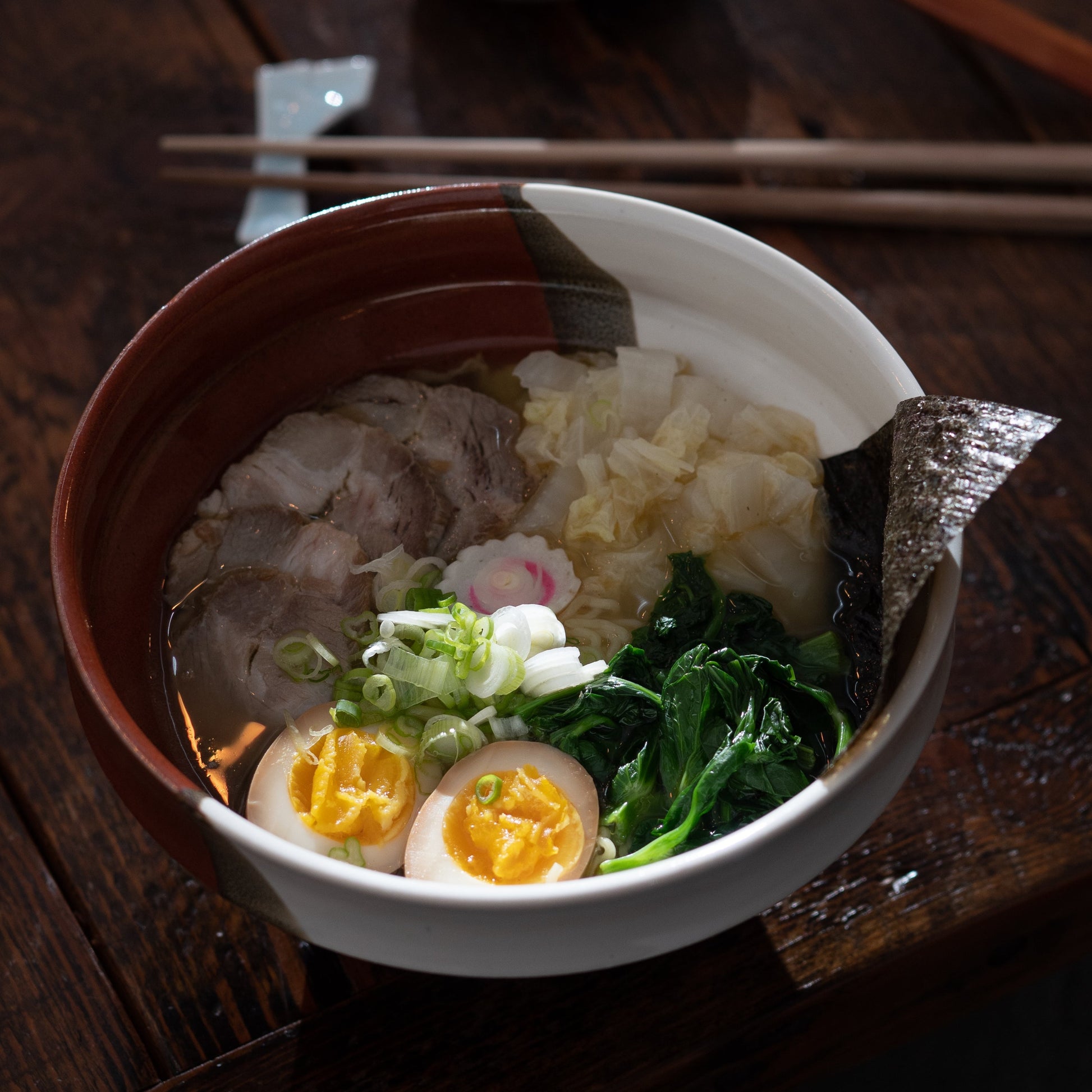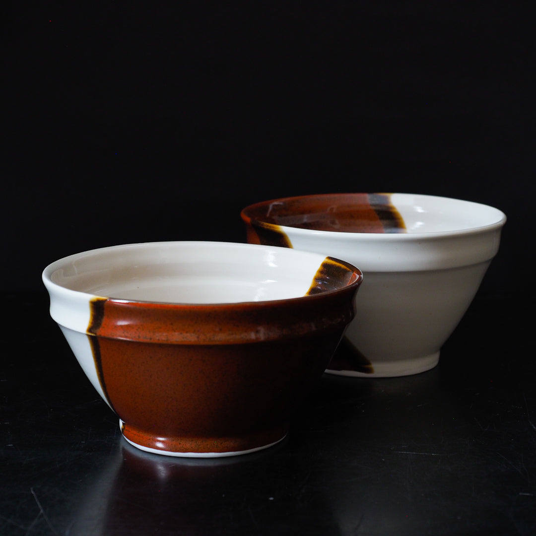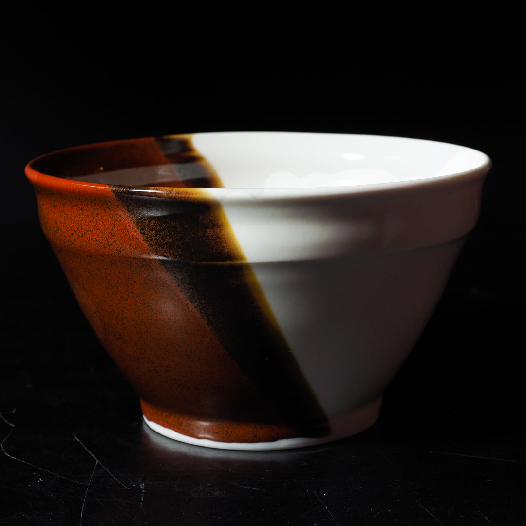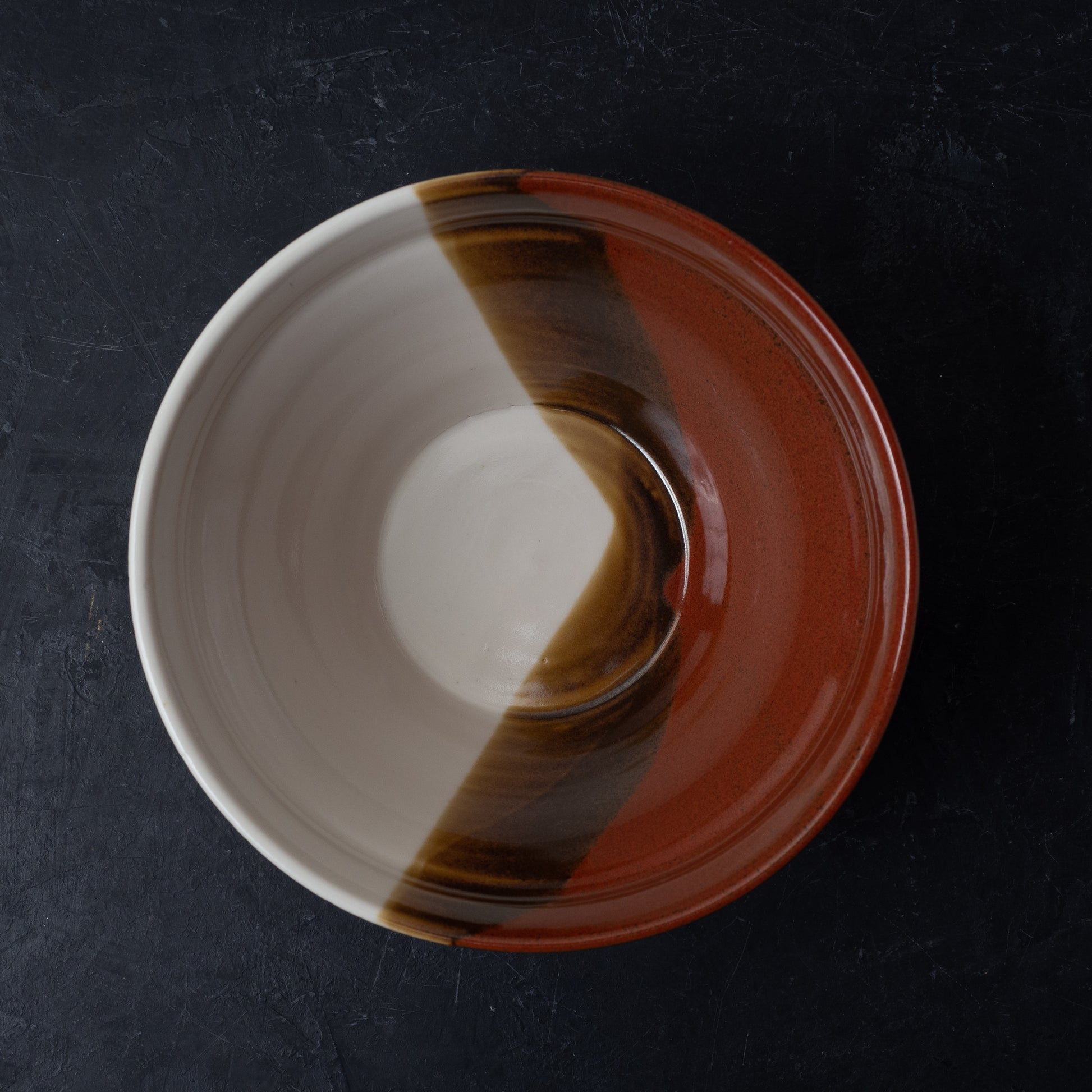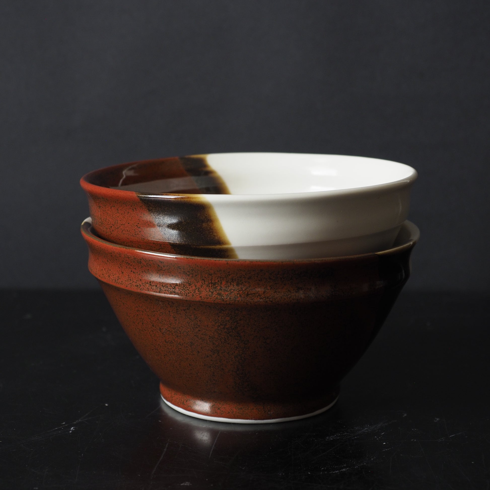 Wheel thrown porcelain ramen bowl finished in clear and iron red glazes. I'm very proud of this one. Designed tall to keep soup hot longer and a lip that is conducive to sipping those last bits of broth. Perfect for the fanciest takeout ramen, pho, Taiwanese beef noodle soup, etc.