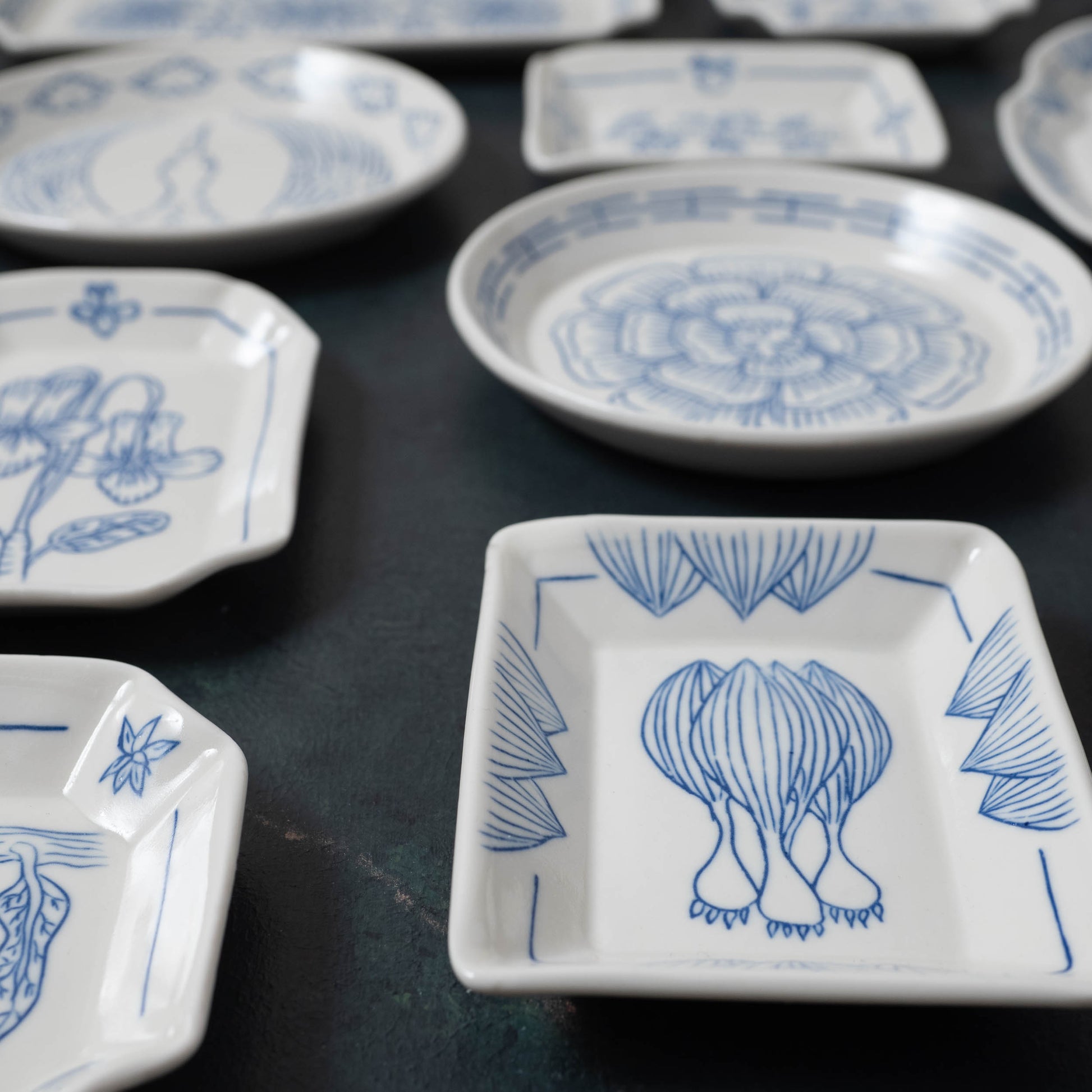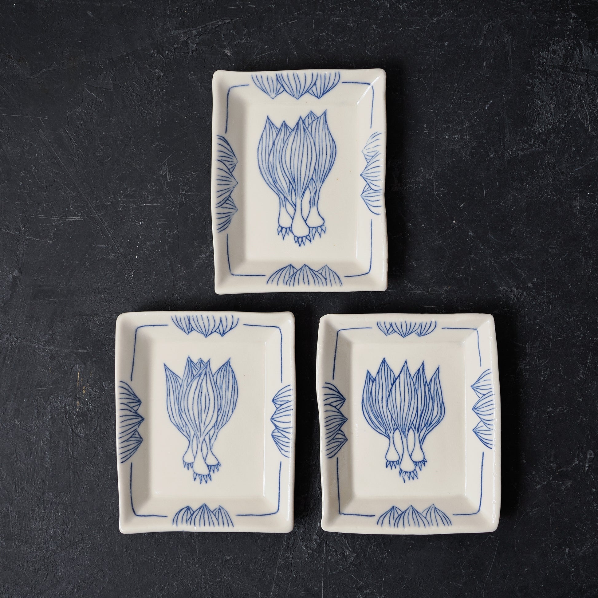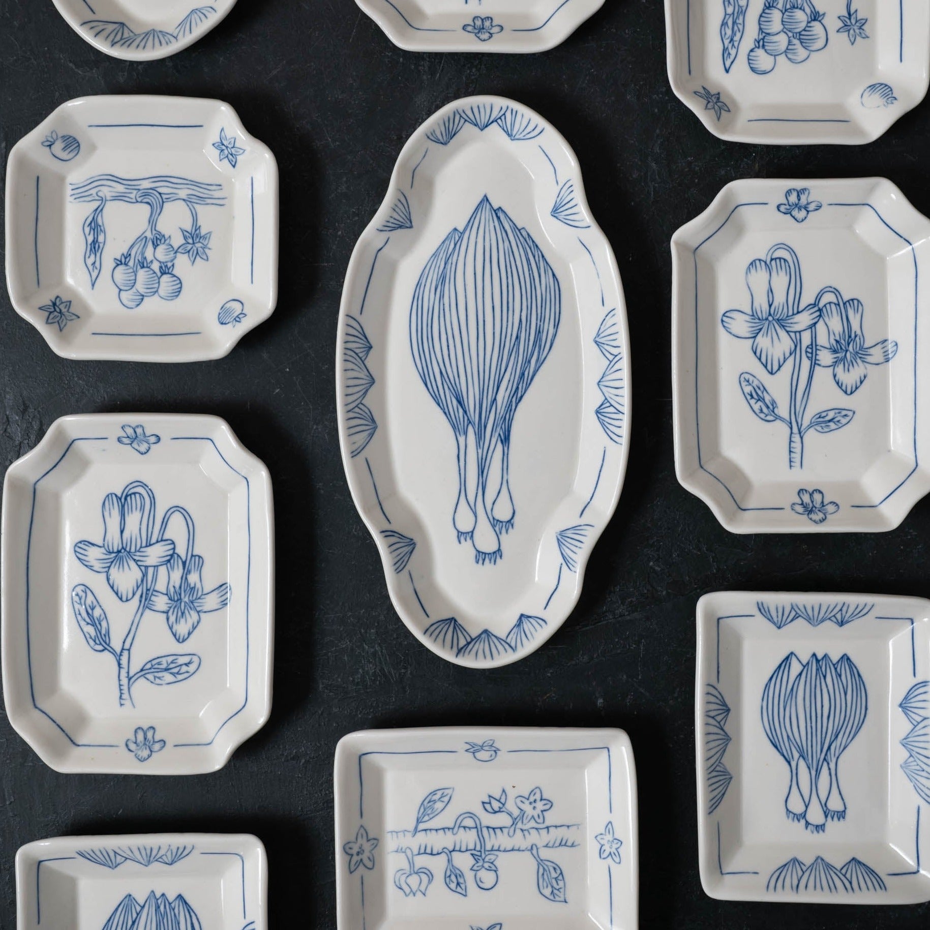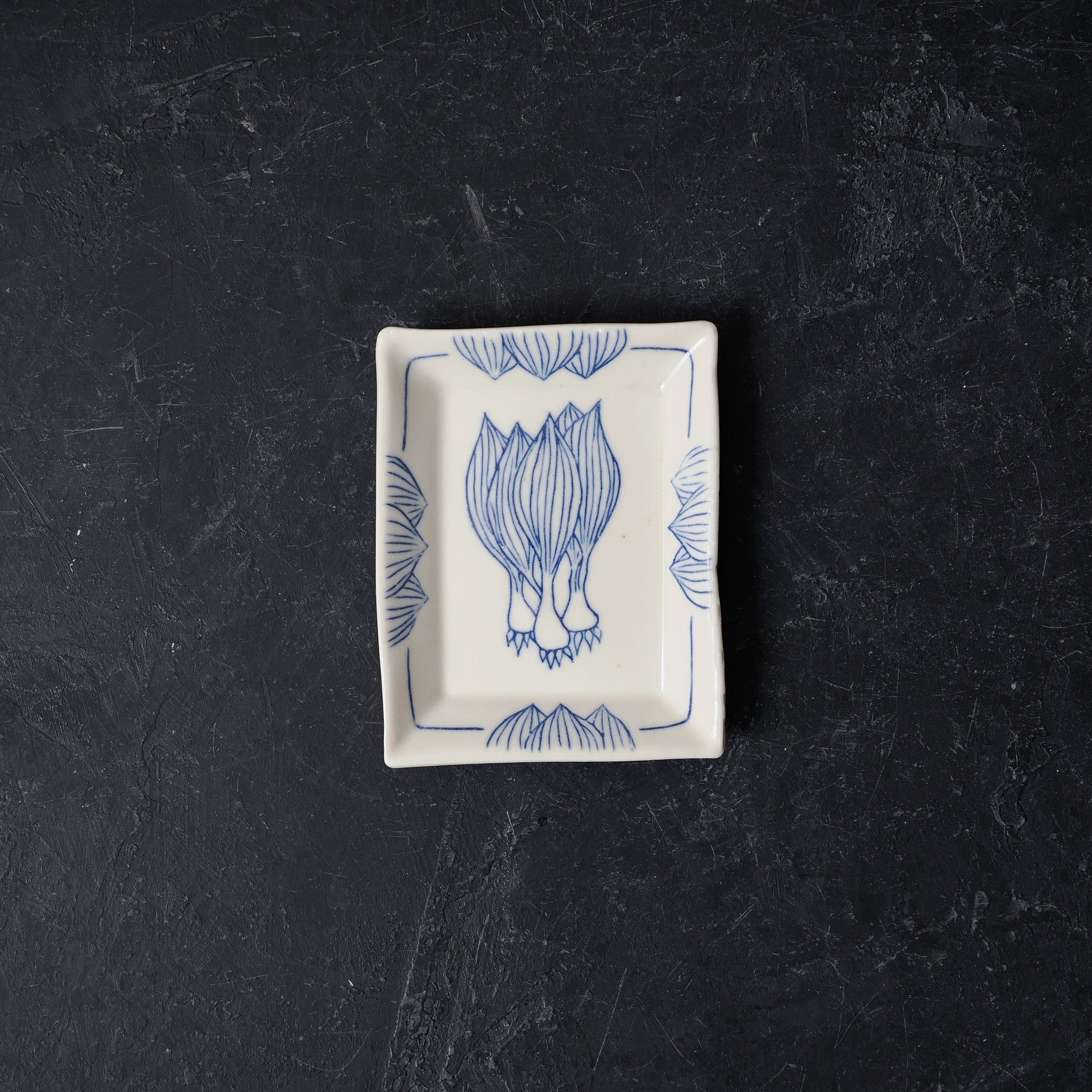 A small rectangle dish decorated with the botanical drawing of a ramp.