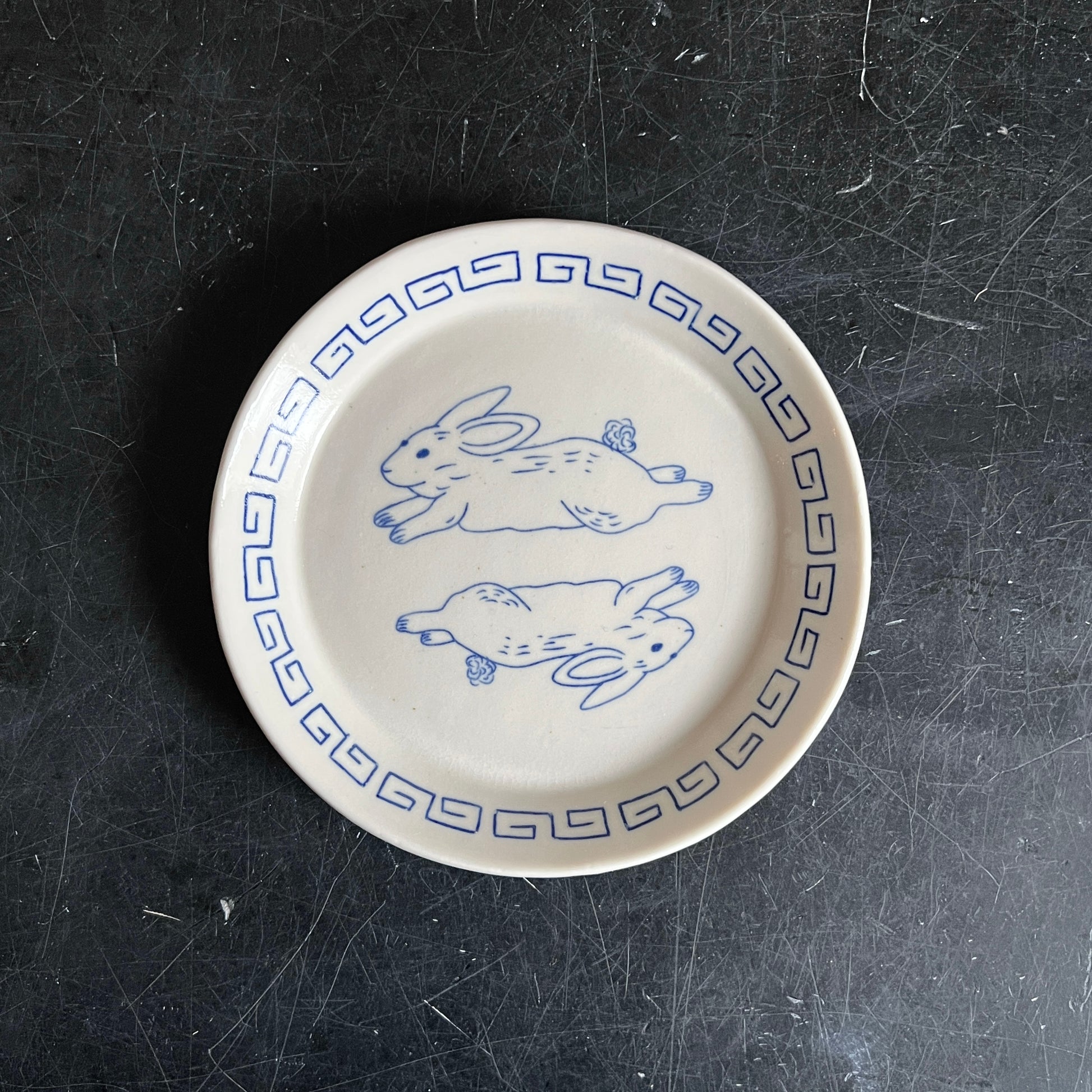 Small round porcelain catchall decorated with two running rabbits. Each rabbit is hand silk-screened and the piece is dipped in a clear glaze. I designed these rabbits to be cute and whimsical to create a feeling of optimism for the new year. The border is decorated with an s-fret, representing infinite wealth, using the mishima technique.