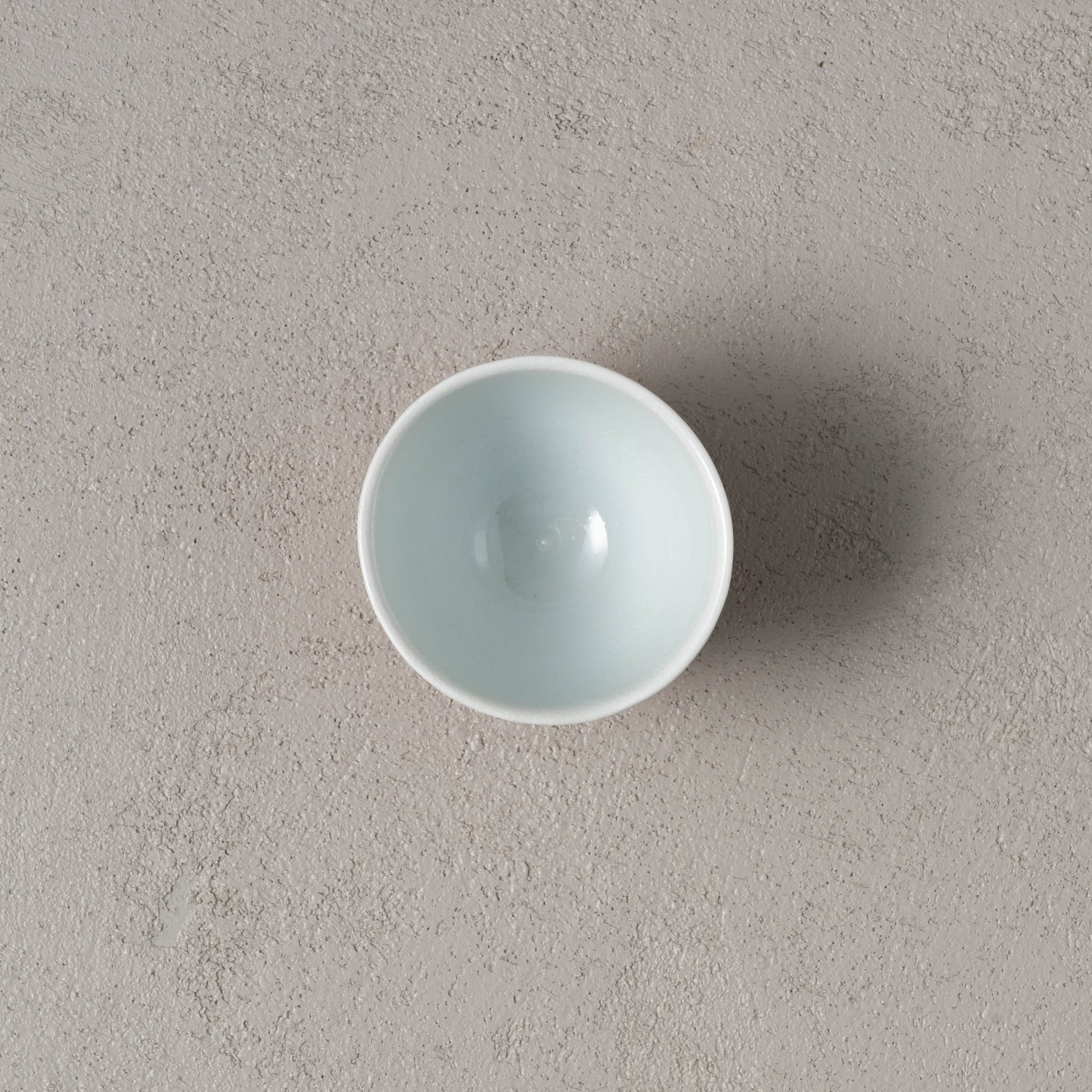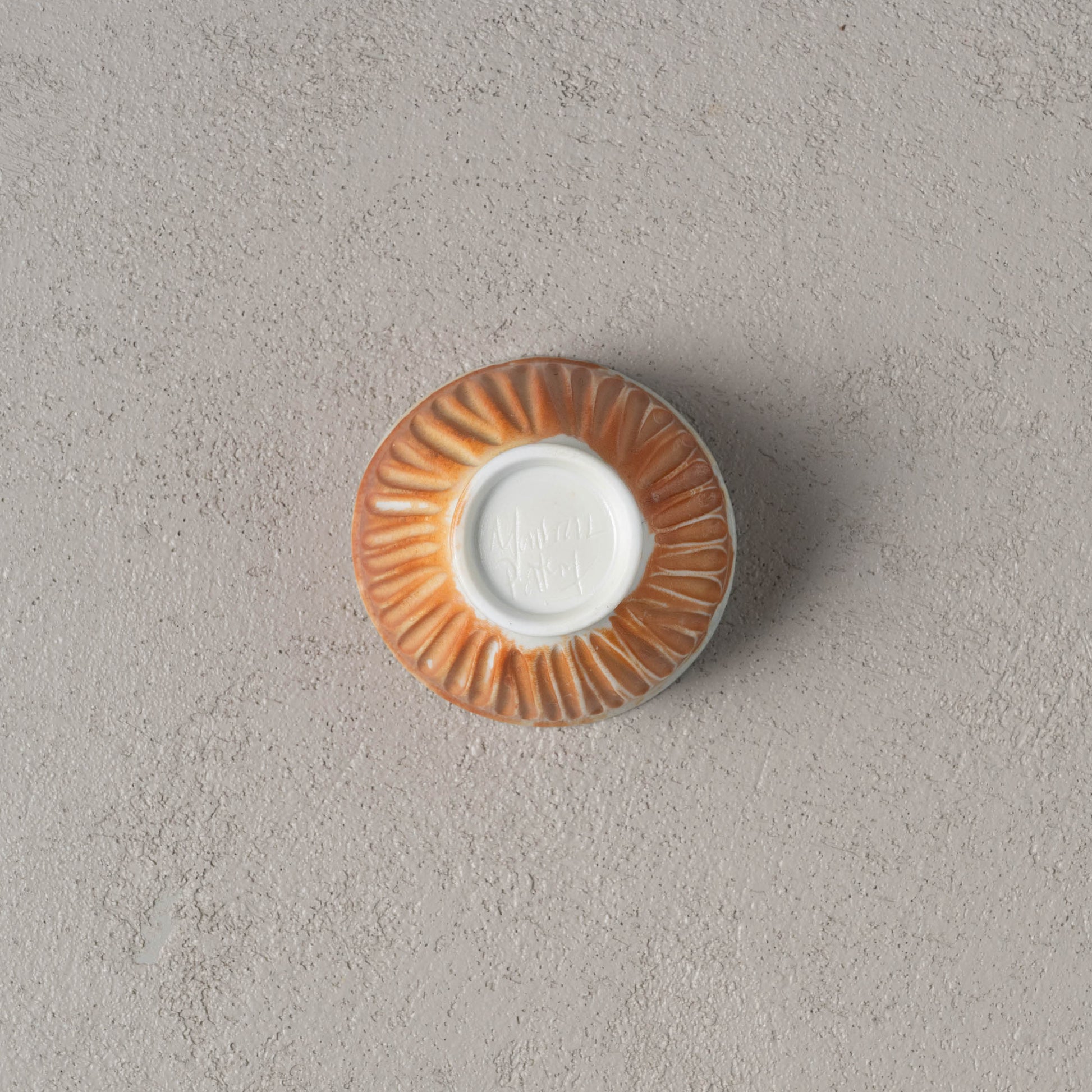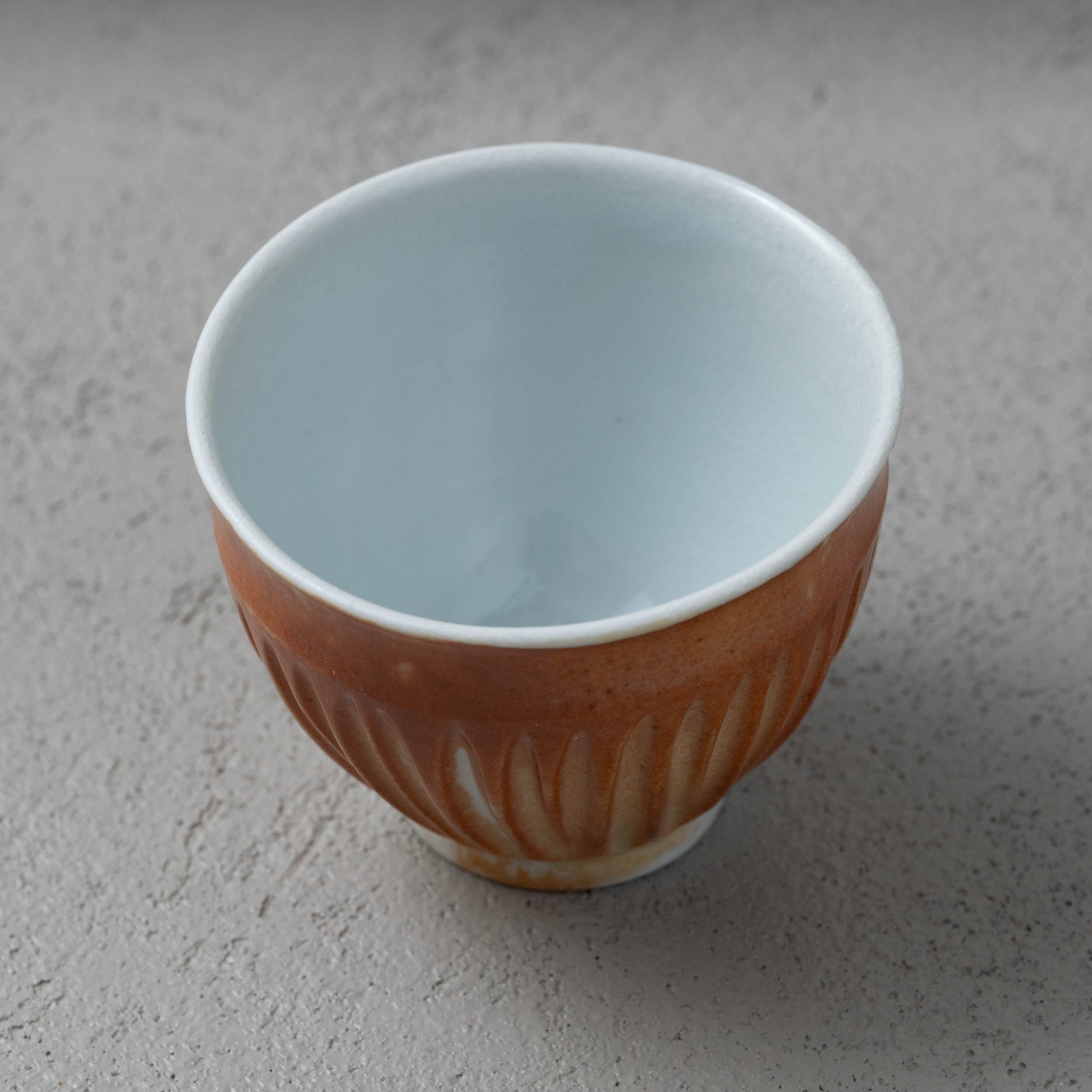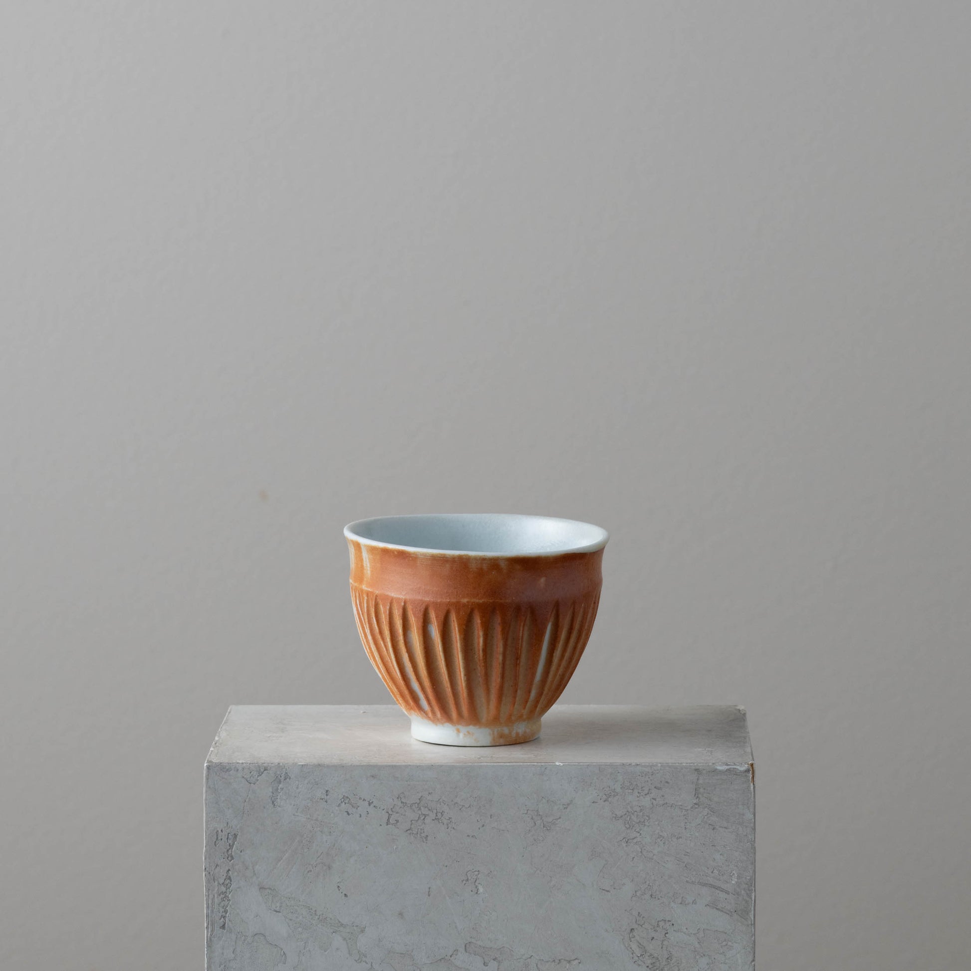 Wheel thrown porcelain tea cup with hand-fluted details on the exterior. Decorated with a red flashing slip, ash, flame, and salt on the exterior. Glazed with clear glaze on the interior.