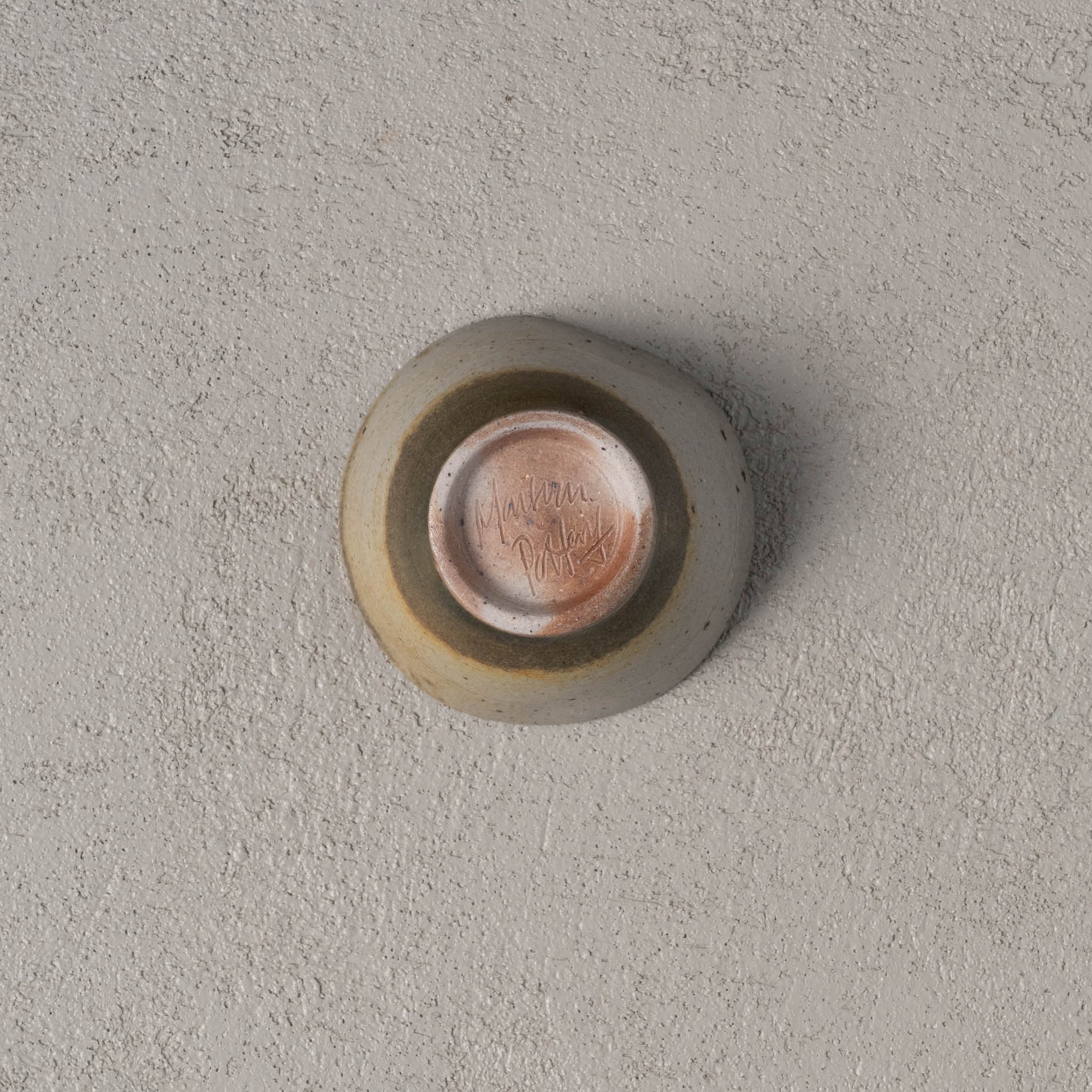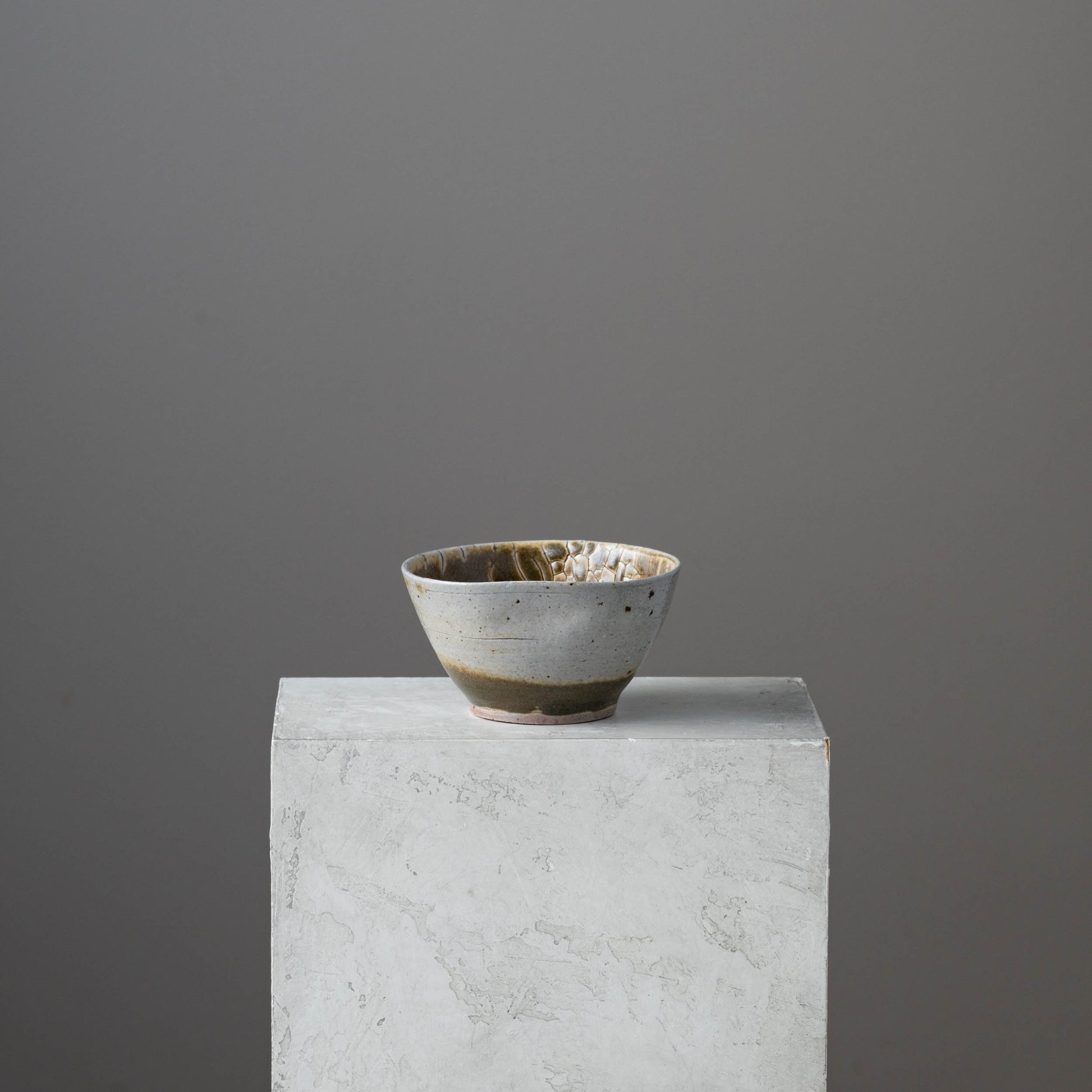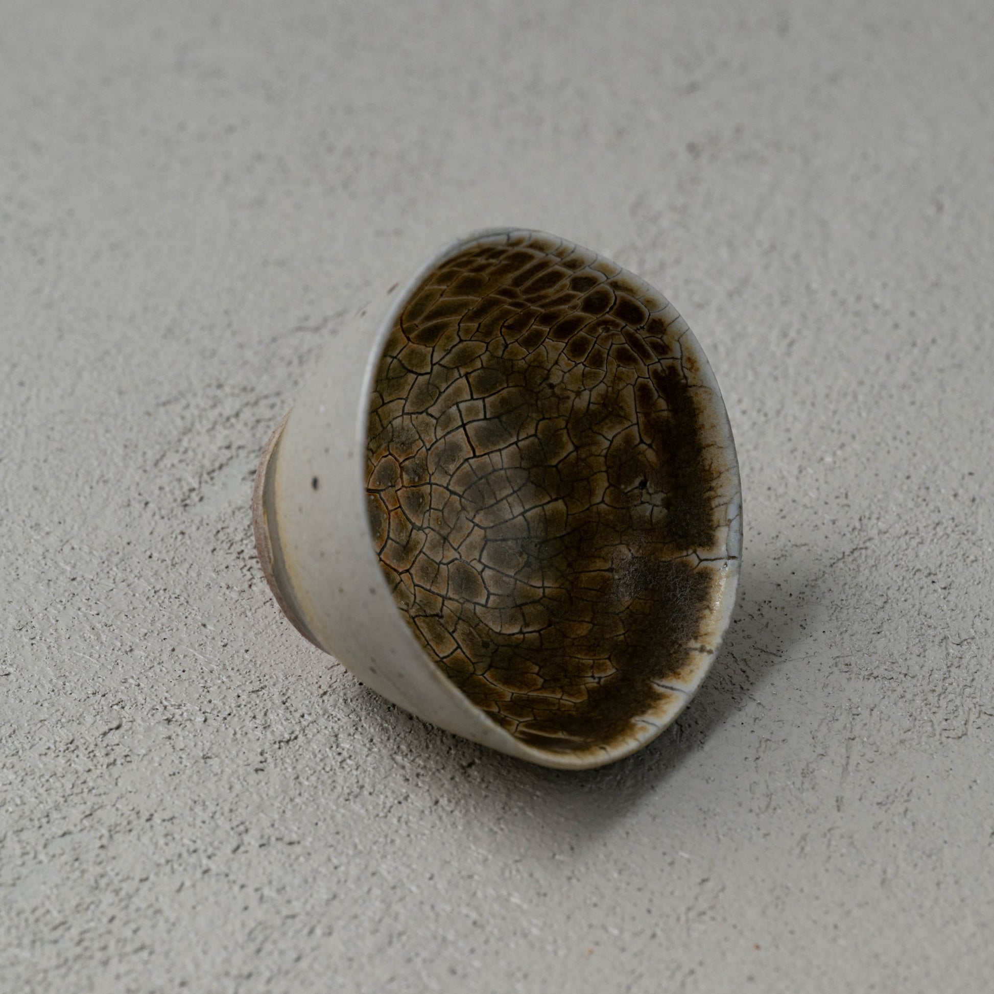 This one is positively reptilian. Wheel thrown stoneware tea cup layered with a crackle slip and Korean celadon glaze on the interior. Decorated only with ash, flame, and salt on the exterior. Tea patina will likely form in the cracks of this one.