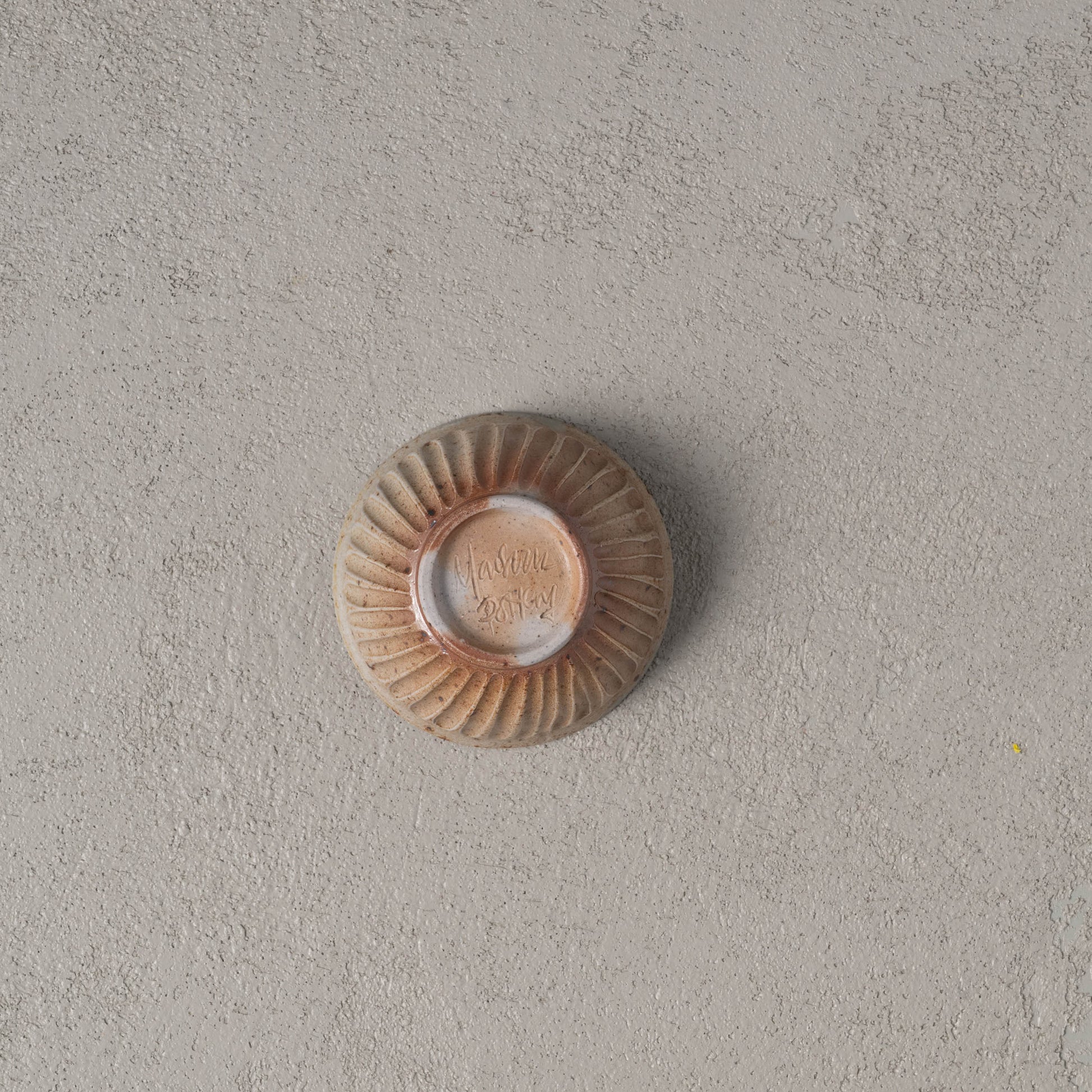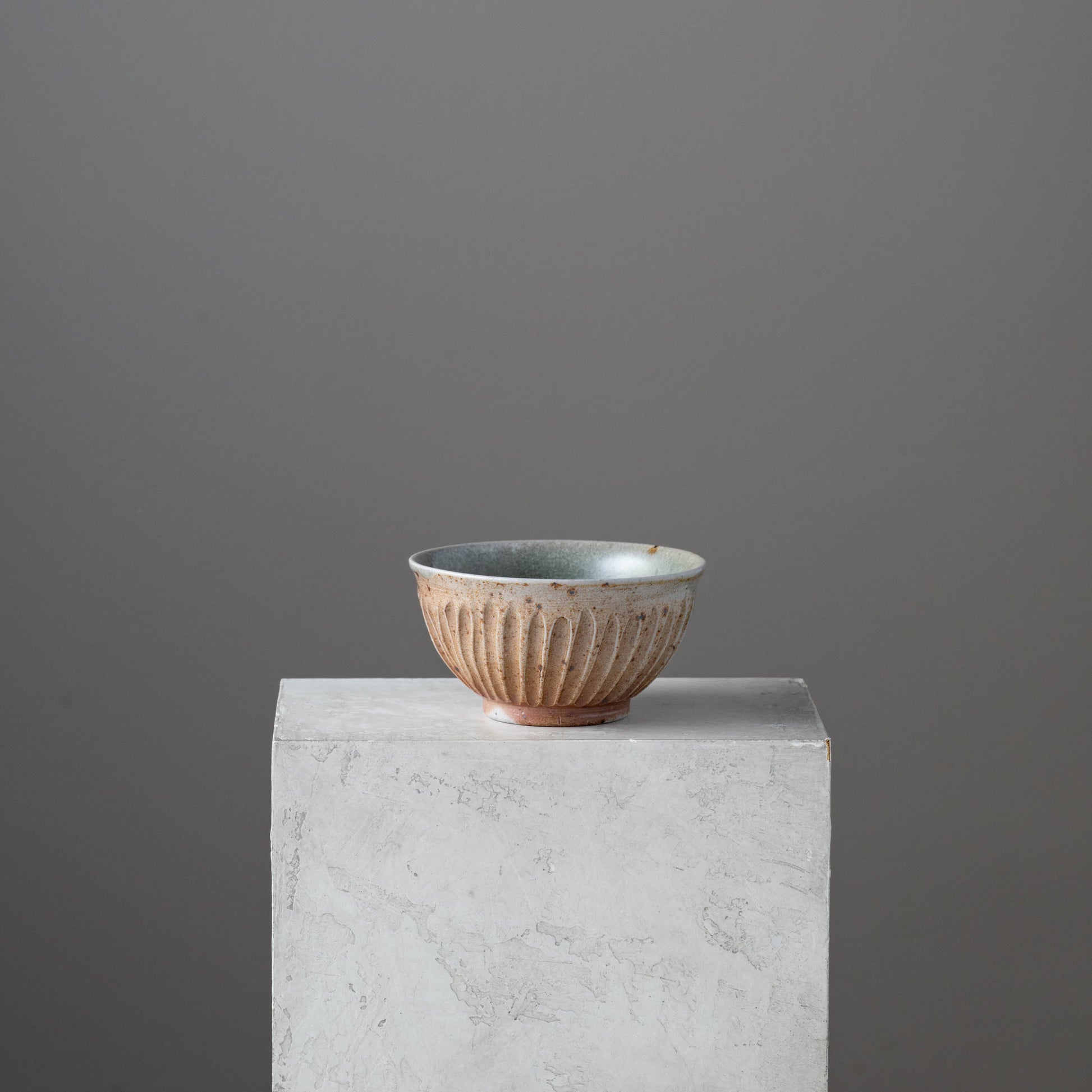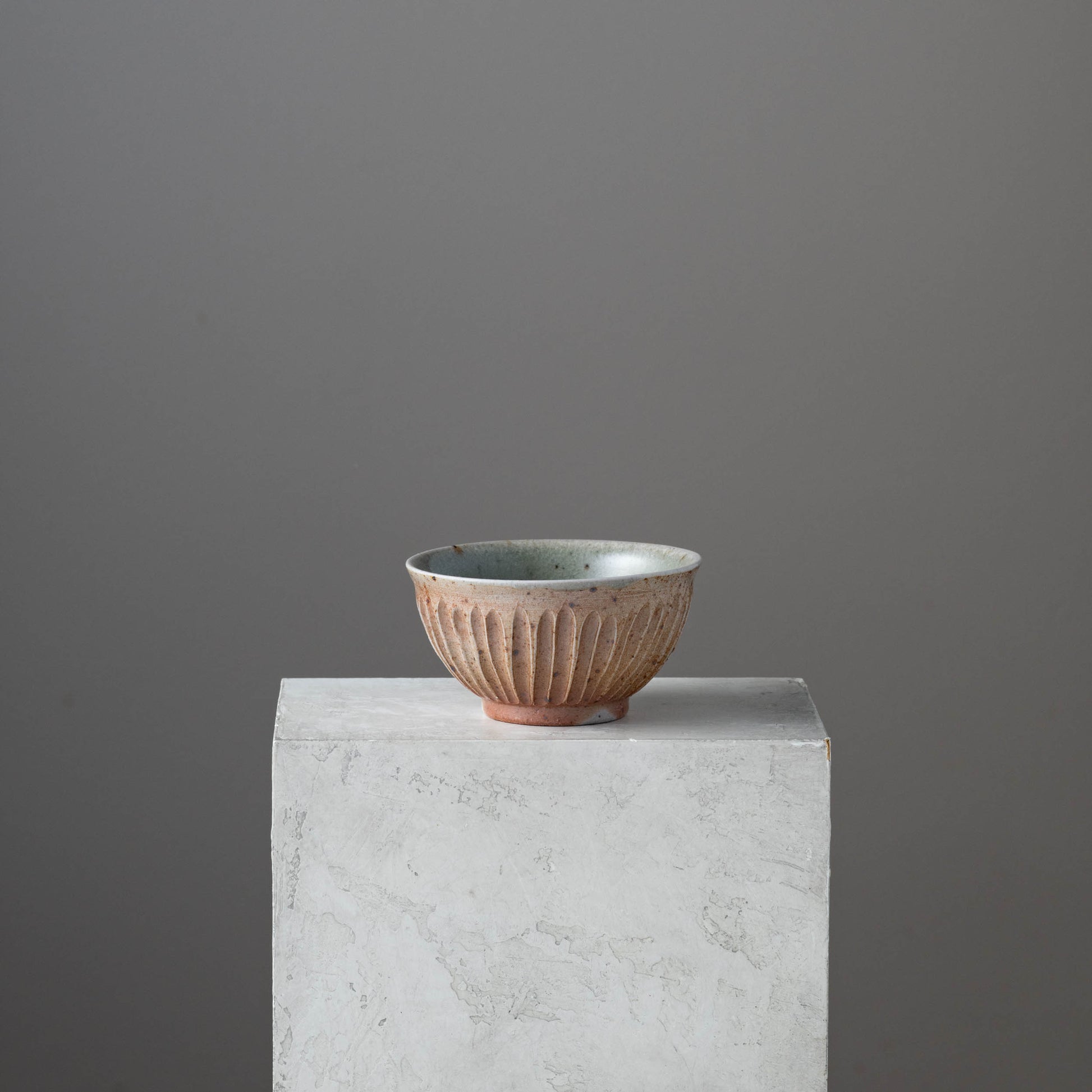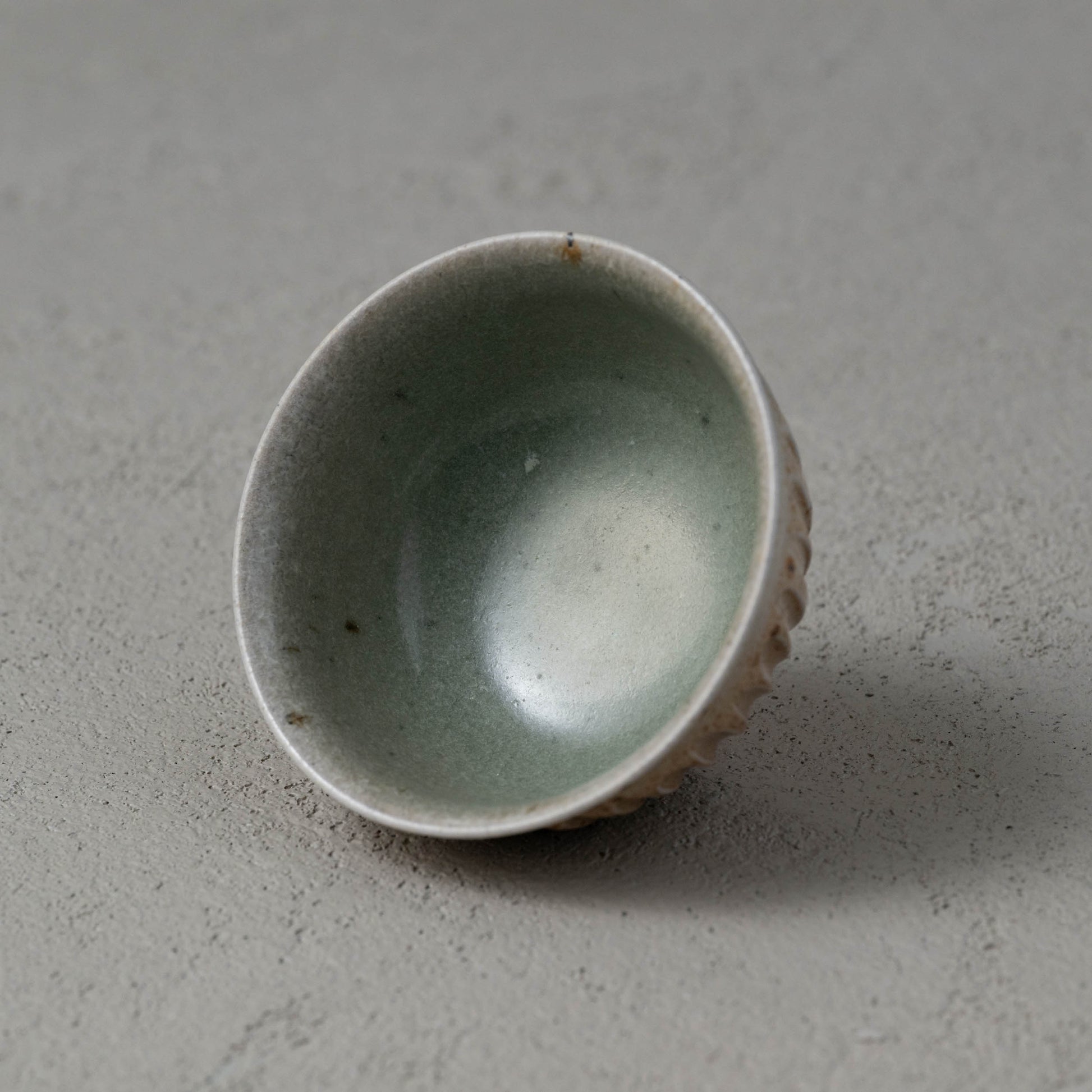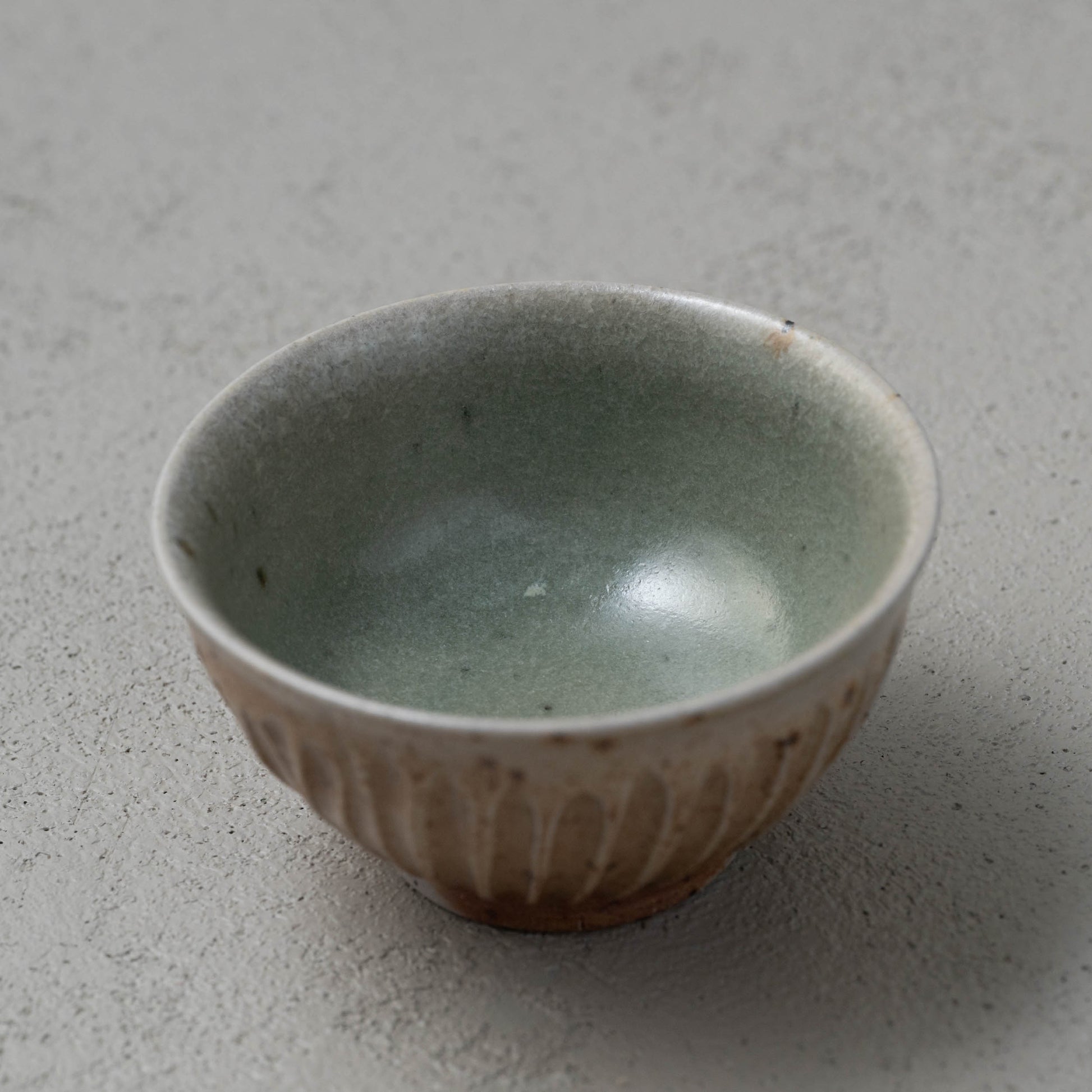 Wheel thrown stoneware tea cup with hand-fluted details on the exterior. Decorated only with ash, flame, and salt on the exterior and finished with a celadon glaze on the interior.