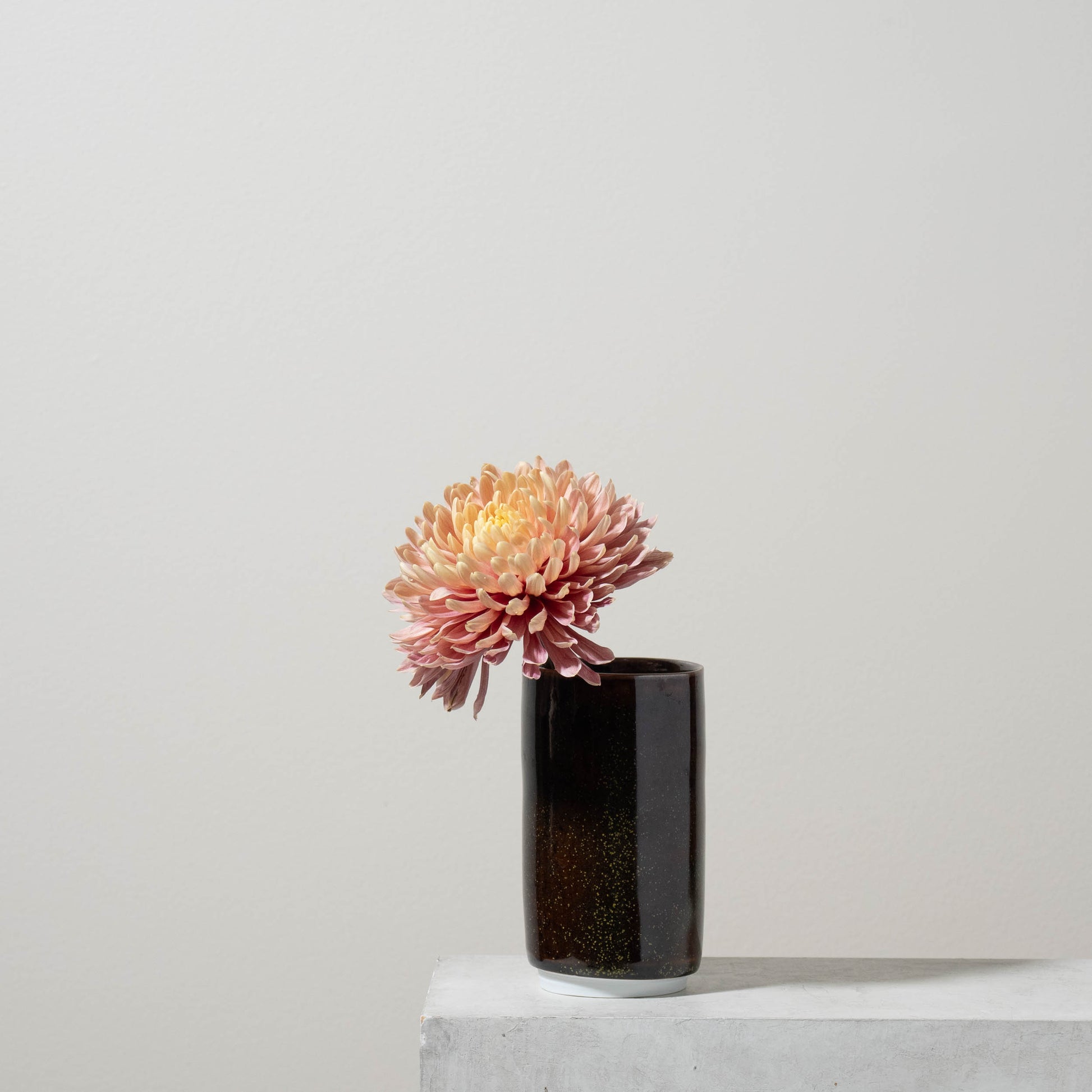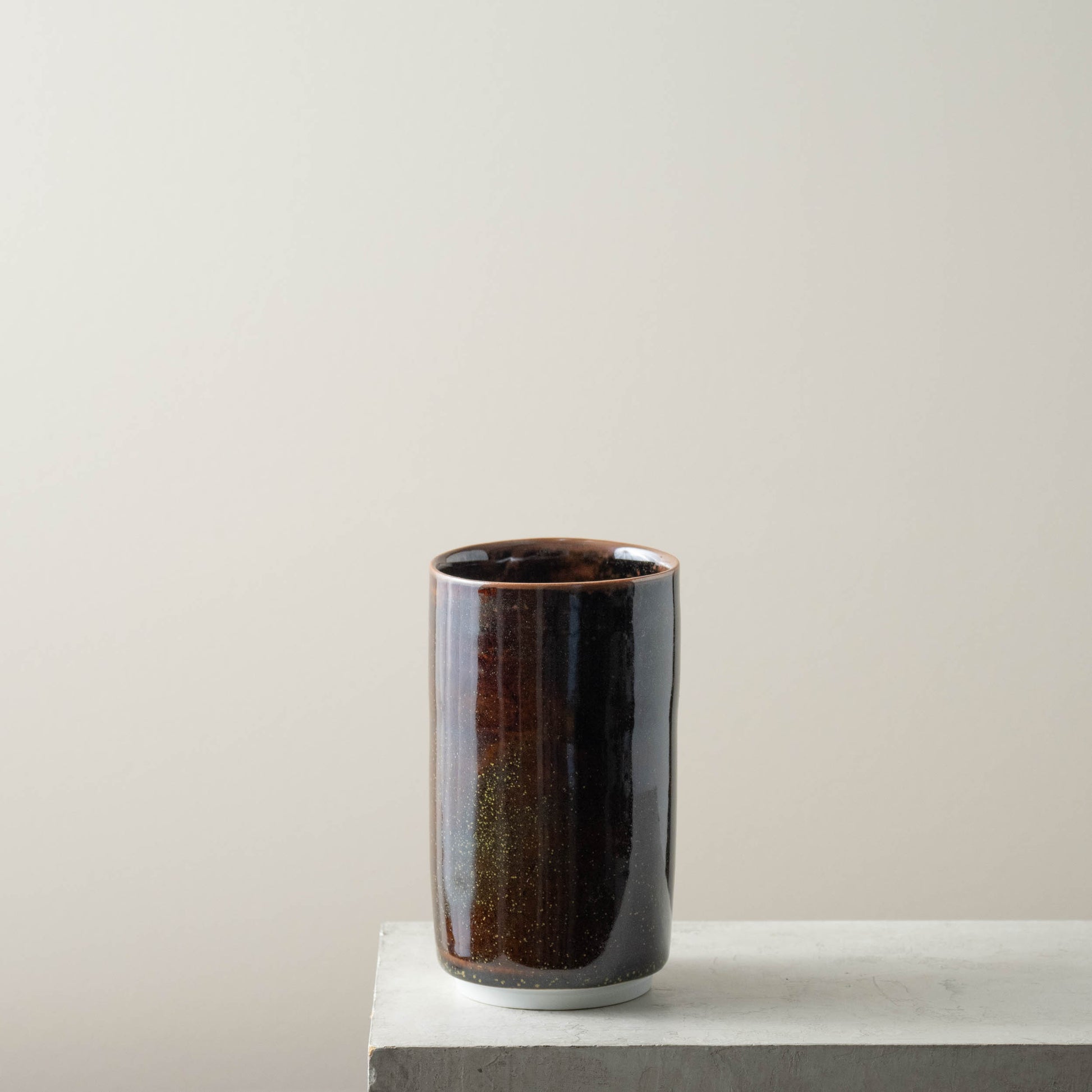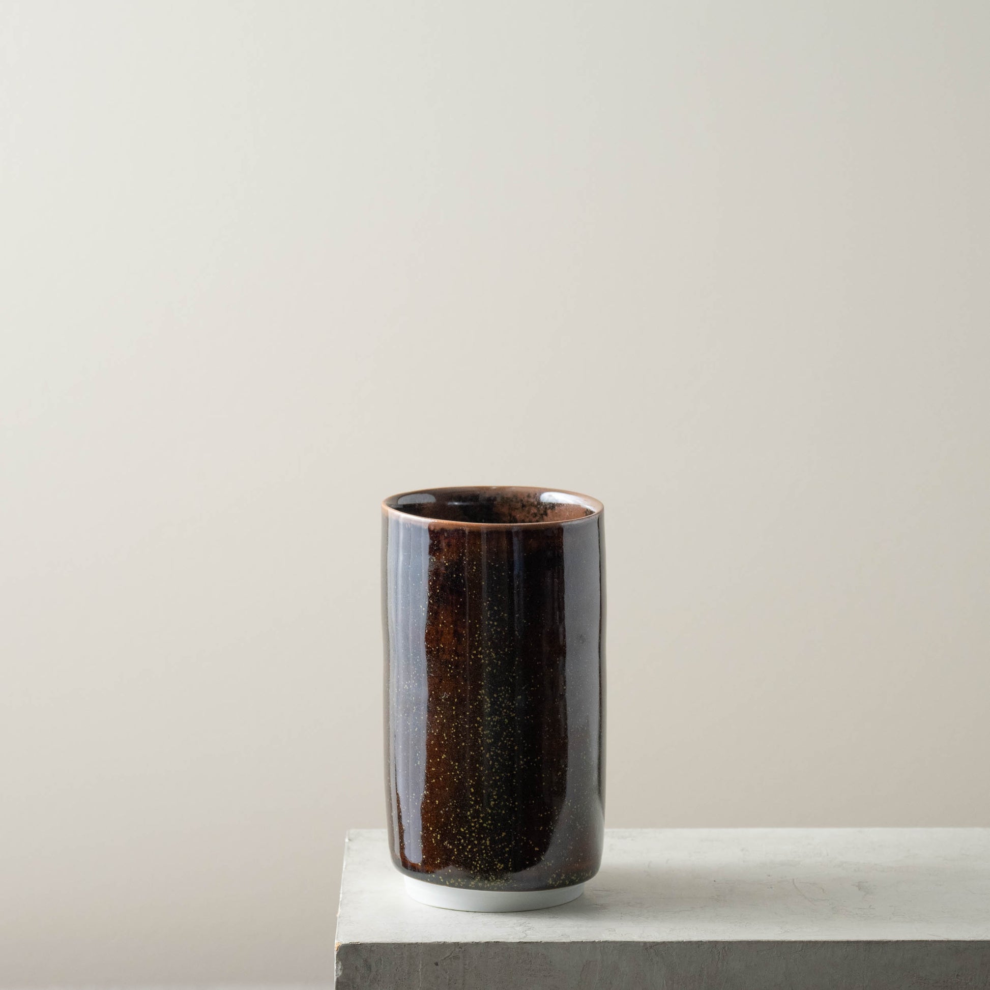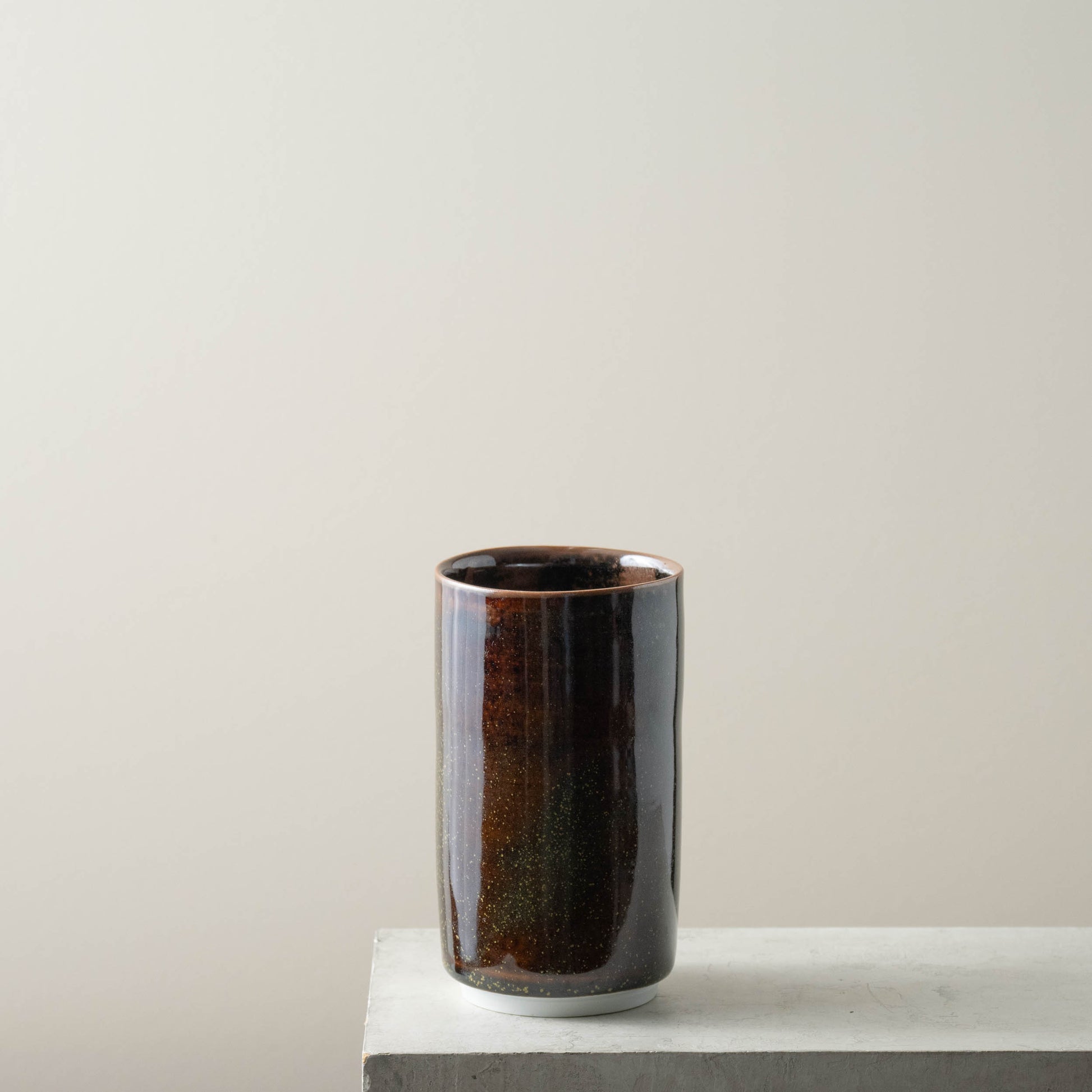 Wheel thrown porcelain vase reduction fired in a tea dust glaze; named as such because the particles that precipitate on the surface resemble the dust remaining after tea has been sorted and sifted. One of a kind.