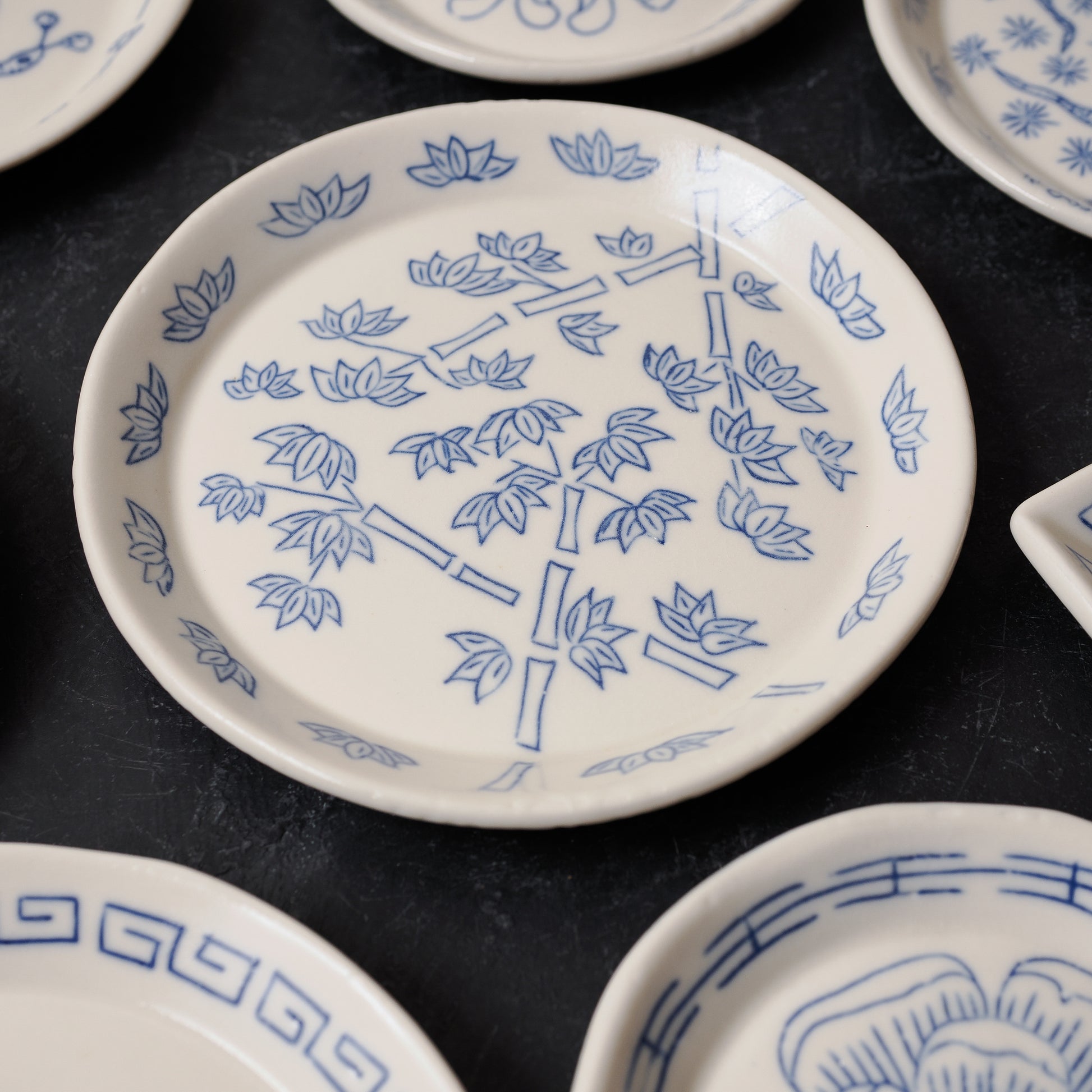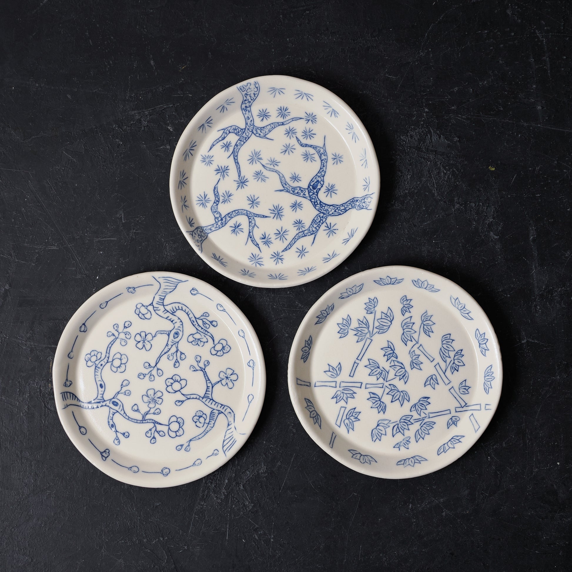 Three round porcelain dishes decorated with the three friends of winter motif.