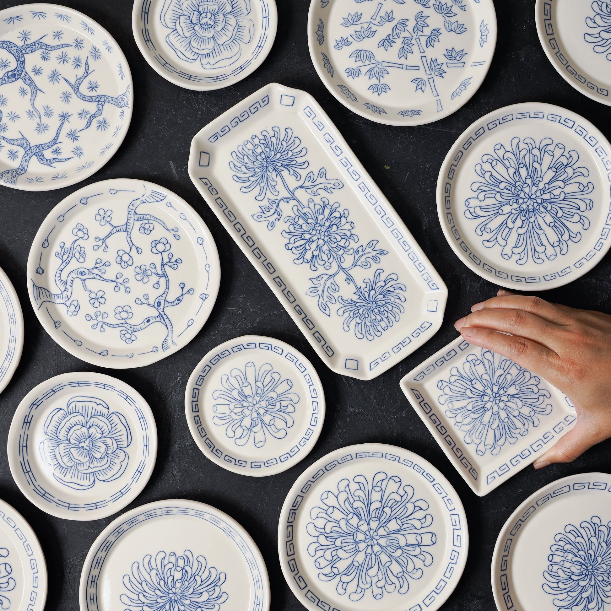 The Three Friends of Winter consists of bamboo, pine, and plum trees. These three trees can thrive in even in the harshest of winters and have come to represent hope, determination and perseverance in the face of adversity. Each piece is decorated using the mishima technique. Every design is etched freehand and filled with pigmented clay and the excess is wiped away.