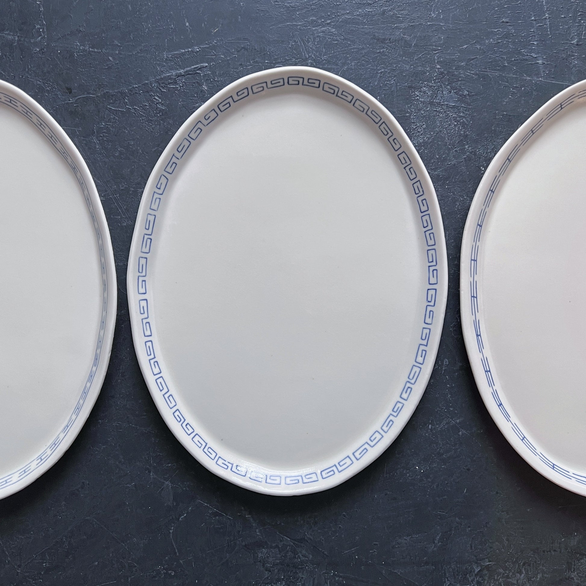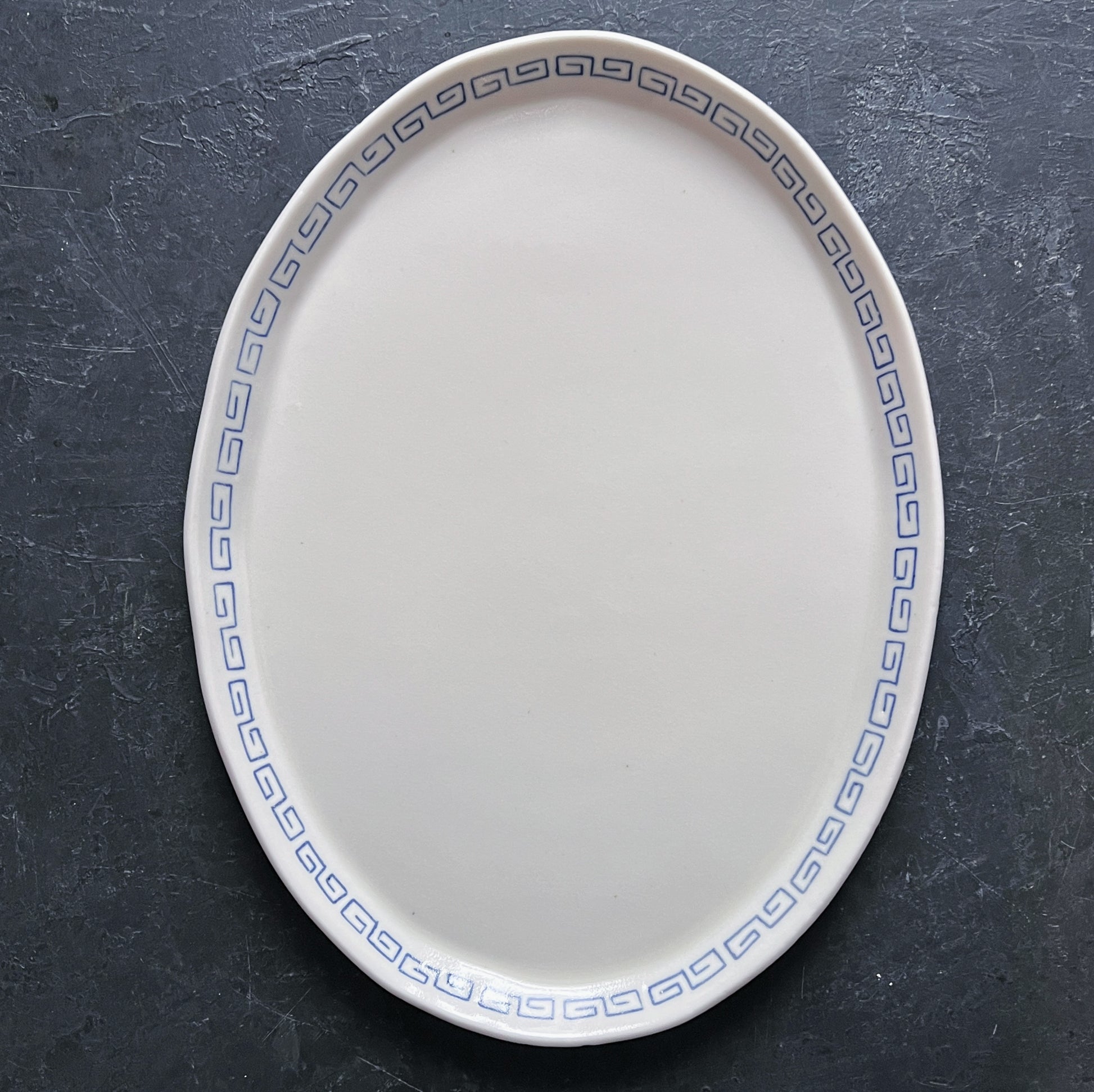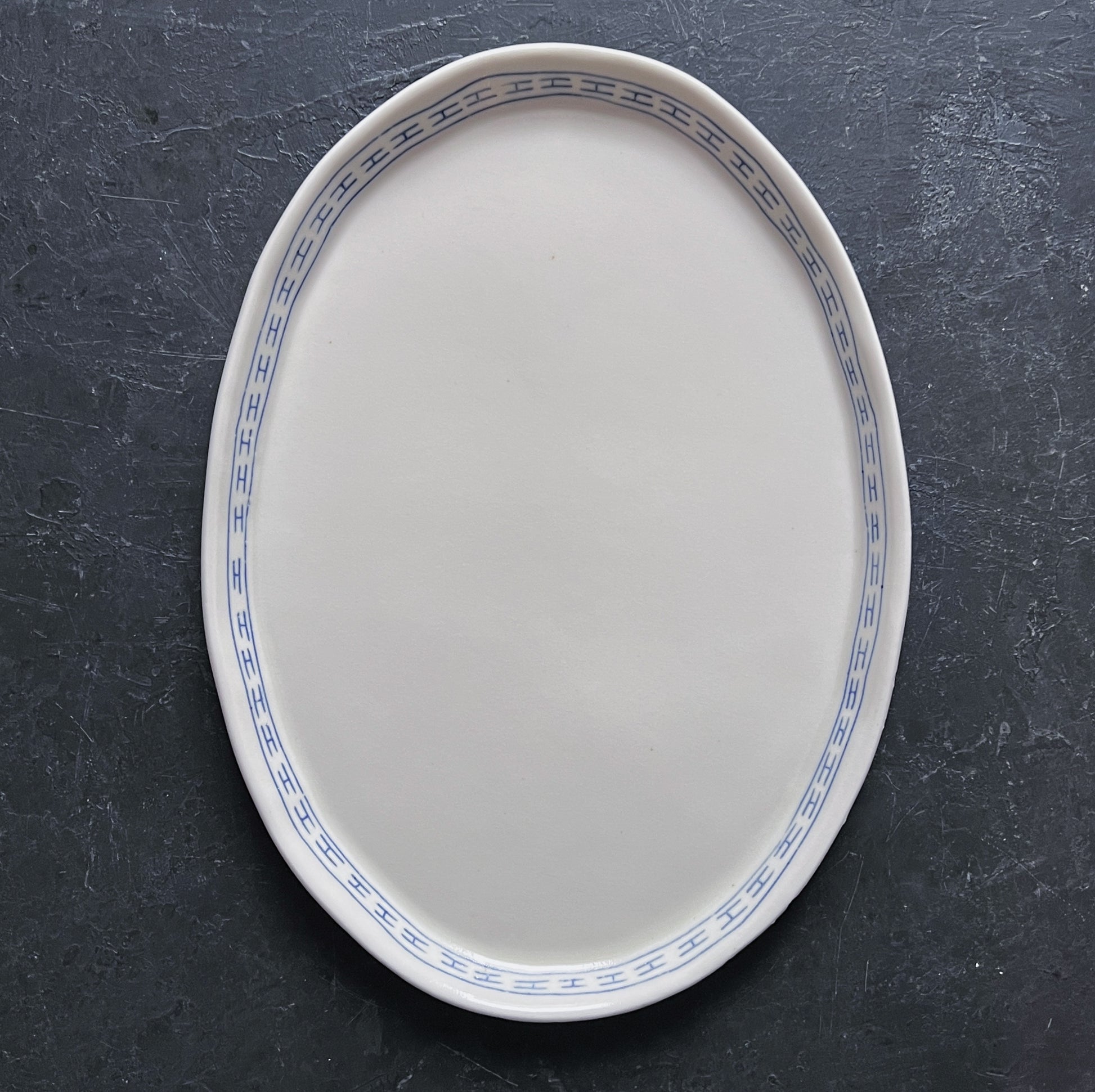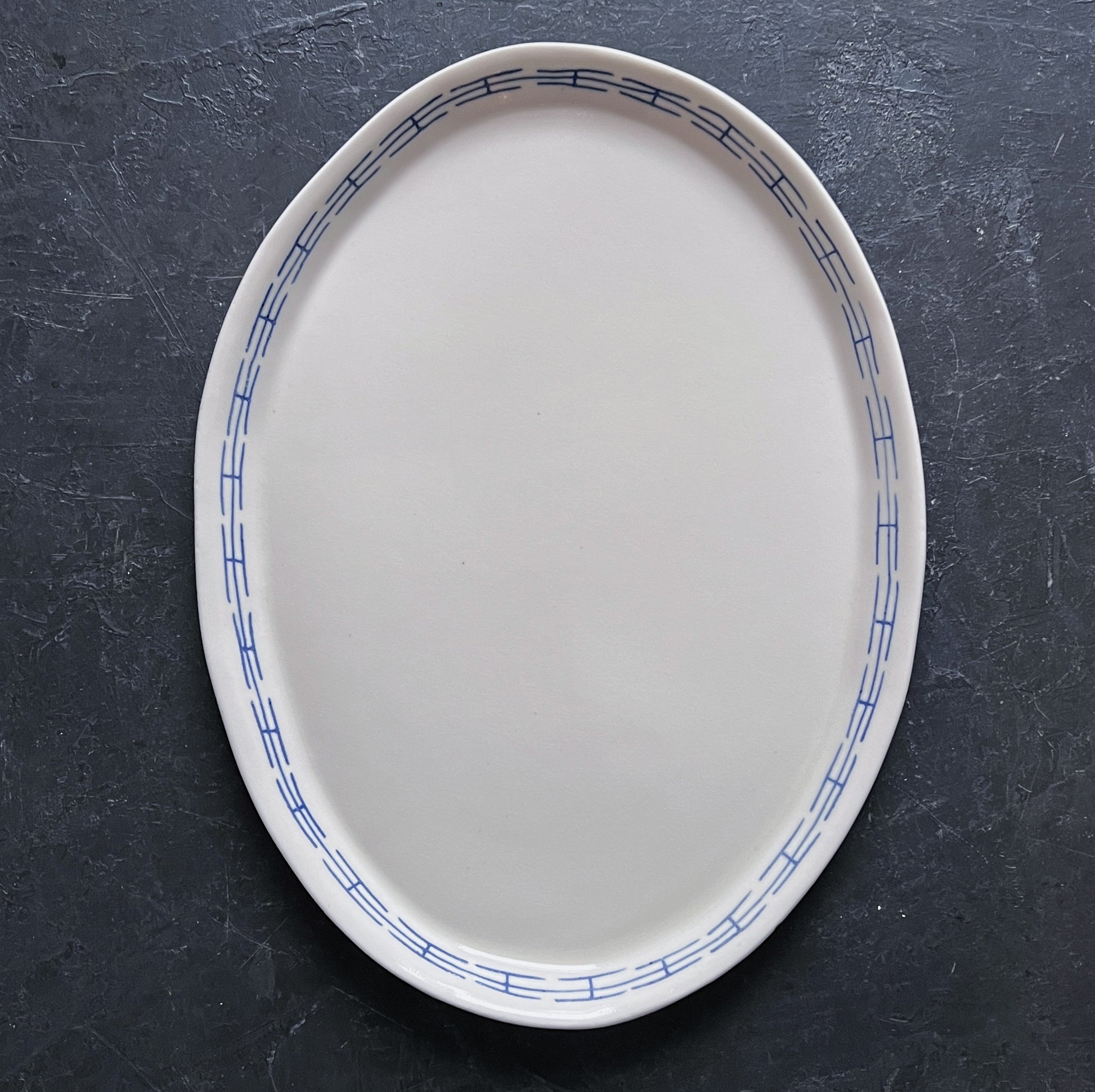 Slump molded porcelain hand-decorated with the traditional mishima technique. Platter measures 12” long, 9” wide, and 3/4” tall.