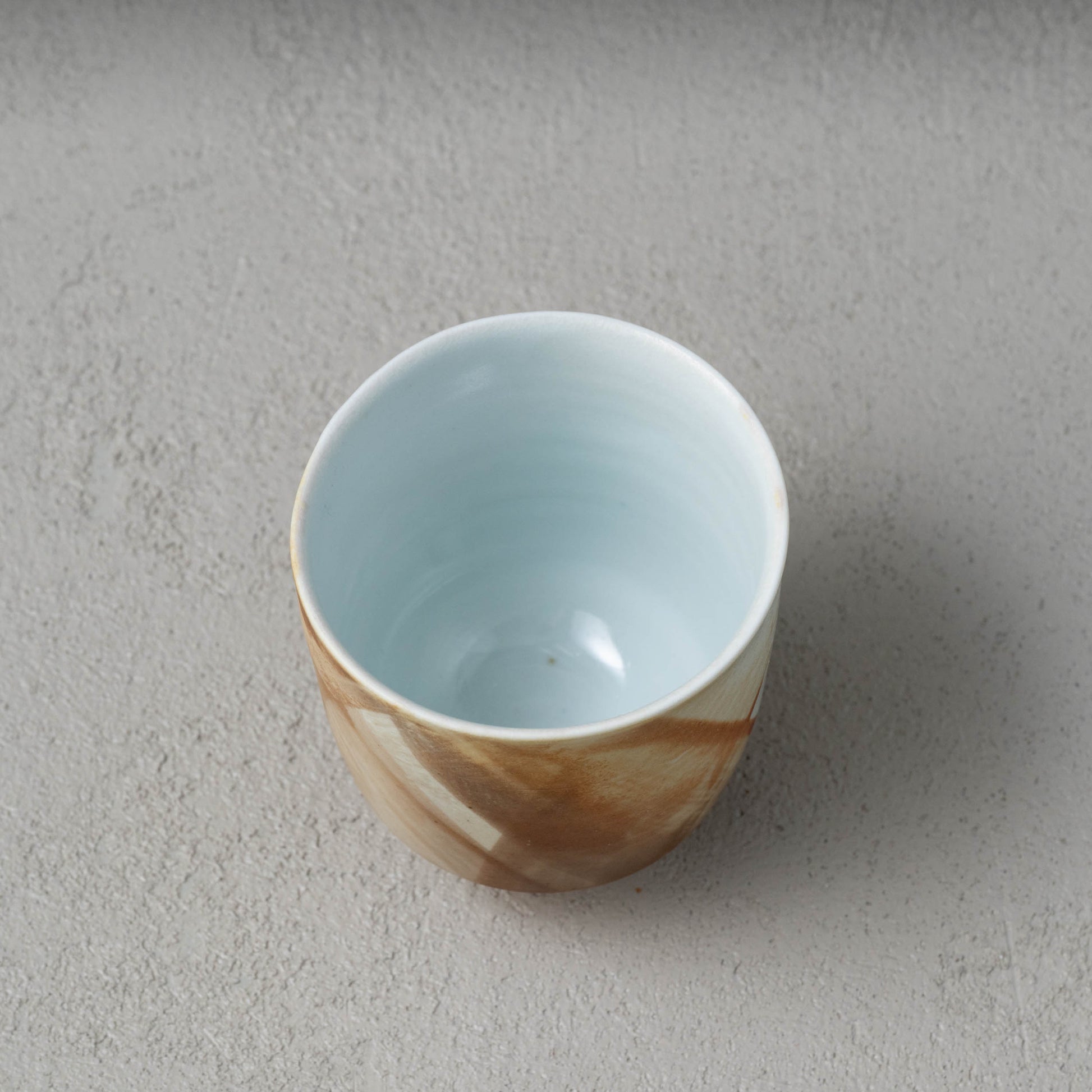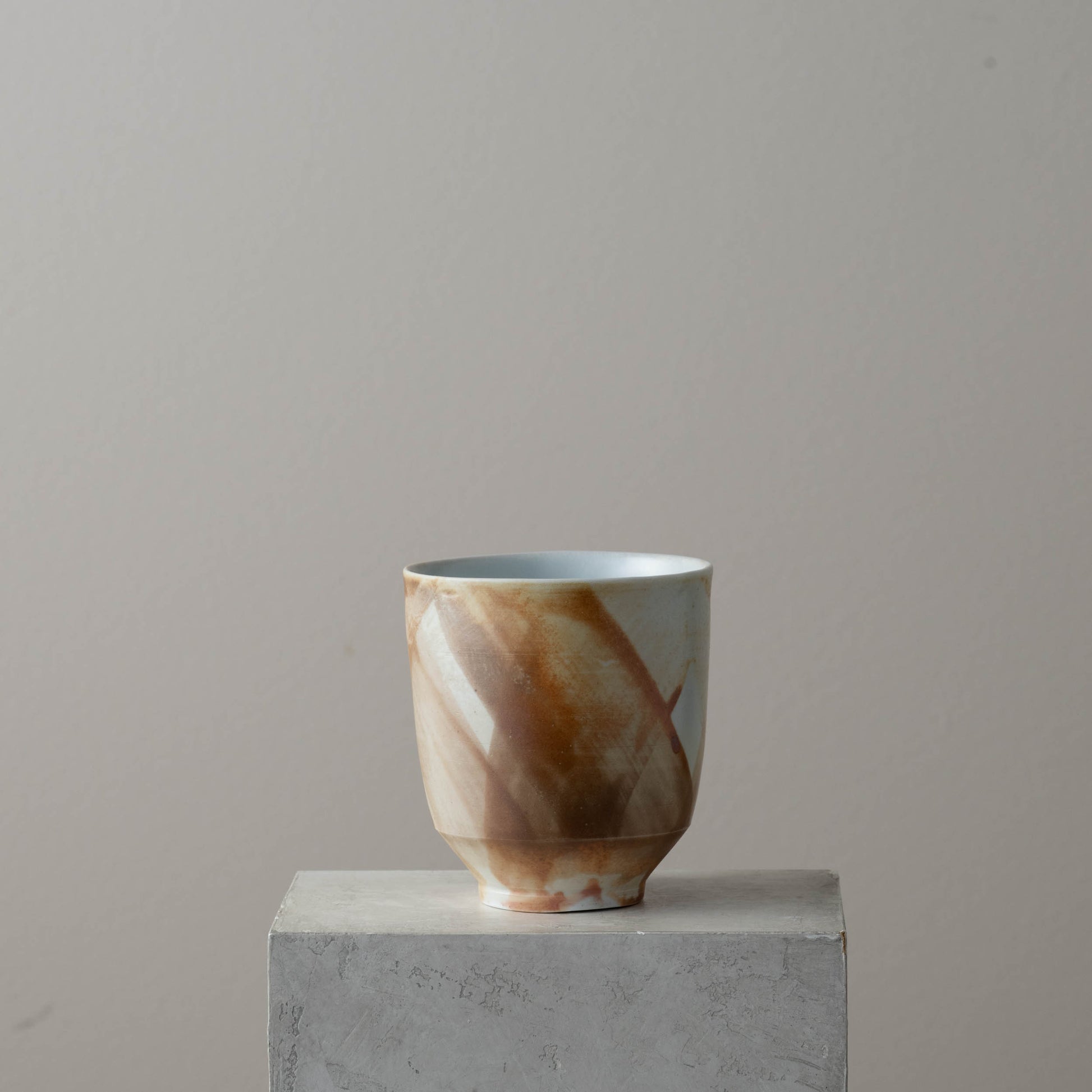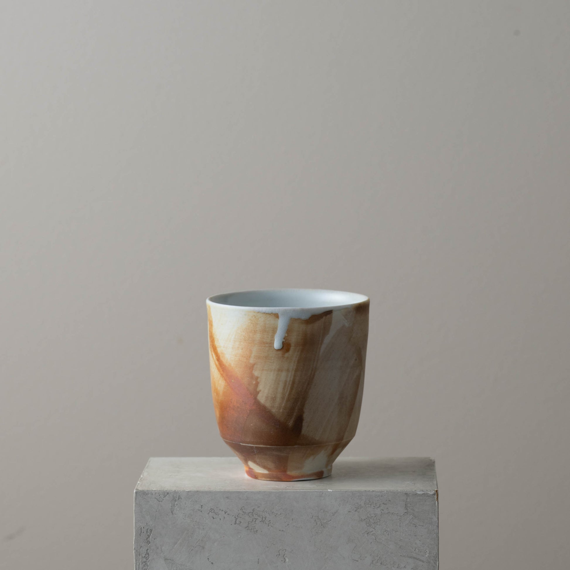 Wheel thrown porcelain yunomi. Decorated with red flashing slip, ash, flame, and salt on the outside and finished with a clear glaze on the inside. A lovely drip detail.